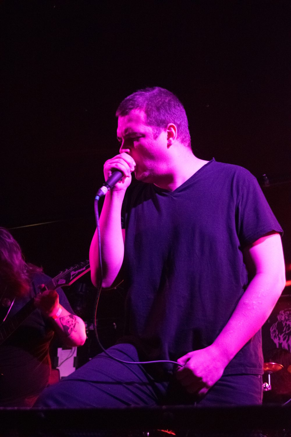 Now for something a little different as Dutch band Ulsect put on a show that could be vaguely described as “atmospheric blackcore.” After one of their guitarists fainted yesterday during his performance with Dodecahedron, everyone’s relieved to see him back on the stage. Ulcest build up their songs with dissonant guitar lines that remind of black metal, climaxing in heavy breakdowns. Their singer deserves a special mention for his theatrical performance, which takes their performance to even deeper emotional depths.