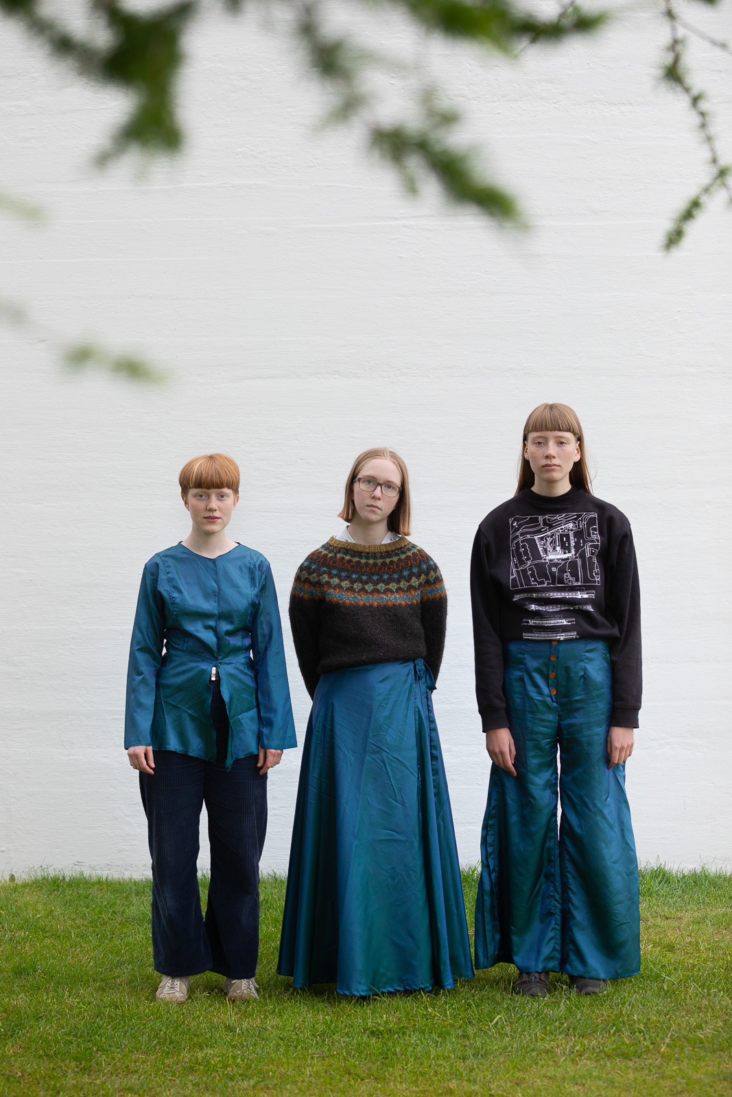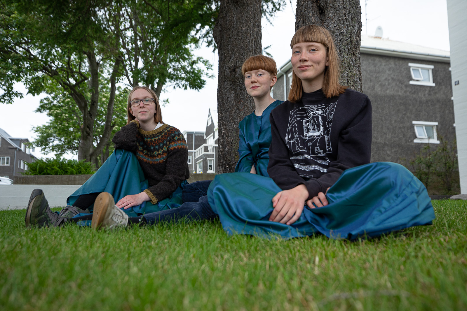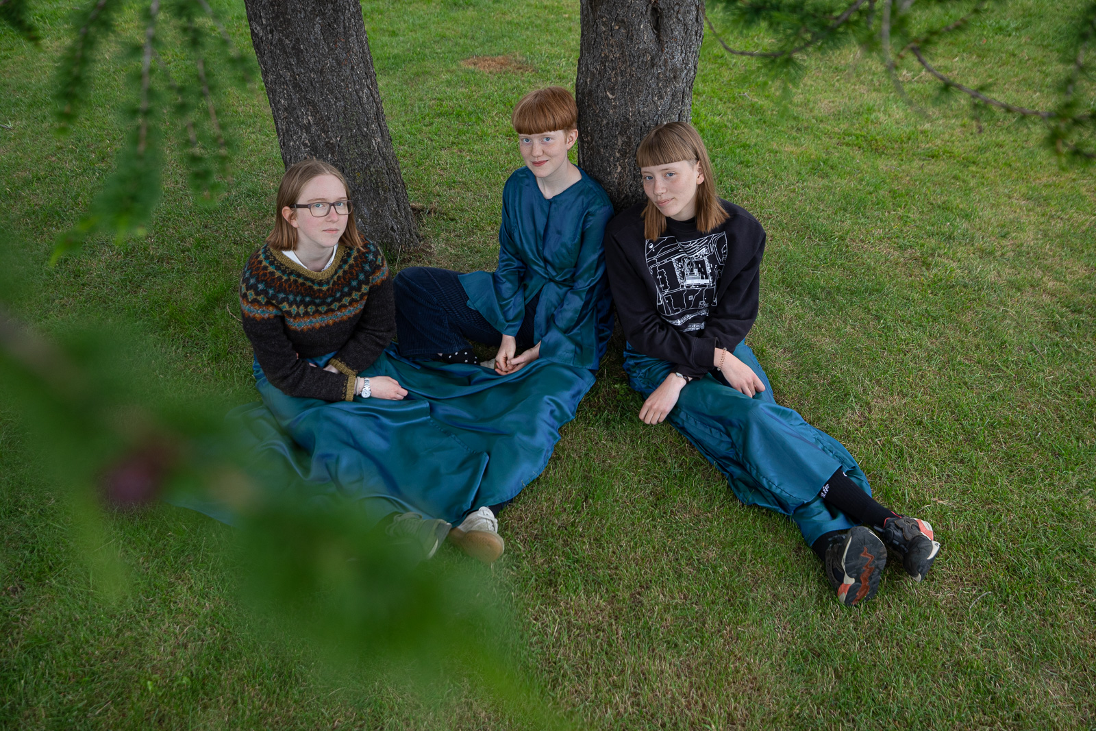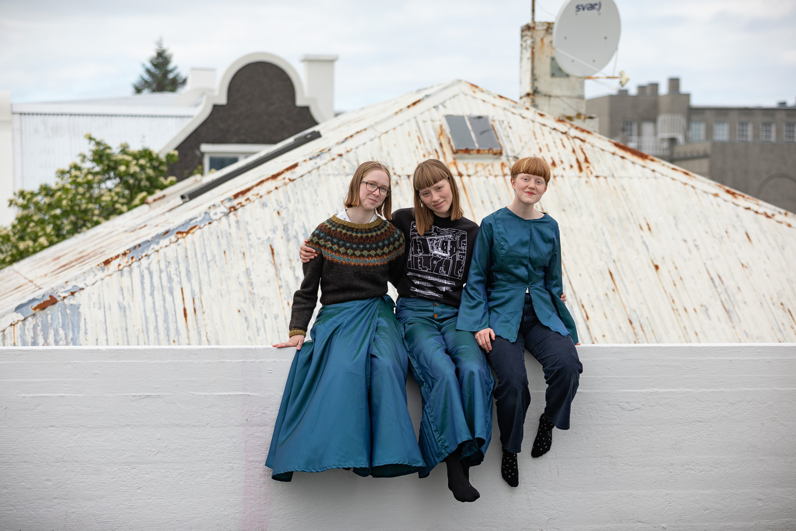 The Dymbrá girls seem right at home posing on the grassy field and between the trees beside Ásmundarsalur, smartly clad in matching outfits of sleek cobalt fabric of the sort that they often make when performing or appearing as a group. Made up of Menntaskólinn við Hamrahlíð schoolmates Eir Ólafsdóttir on cello, Nína Sólveig Andersen on violin, and Eyrún Úa Þorbjörnsdóttir on flute, the teen trio recently released an eponymous debut album consisting of elegant, ethereal instrumentals with occasional hauntingly beautiful Icelandic vocals. “We wanted to create a feeling and an atmosphere based on what we feel inside more so than specific words or messages of ours,” Nína explains.