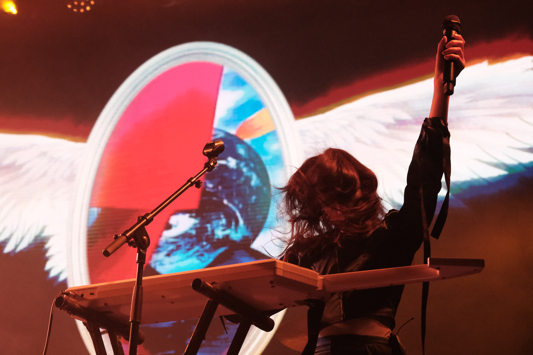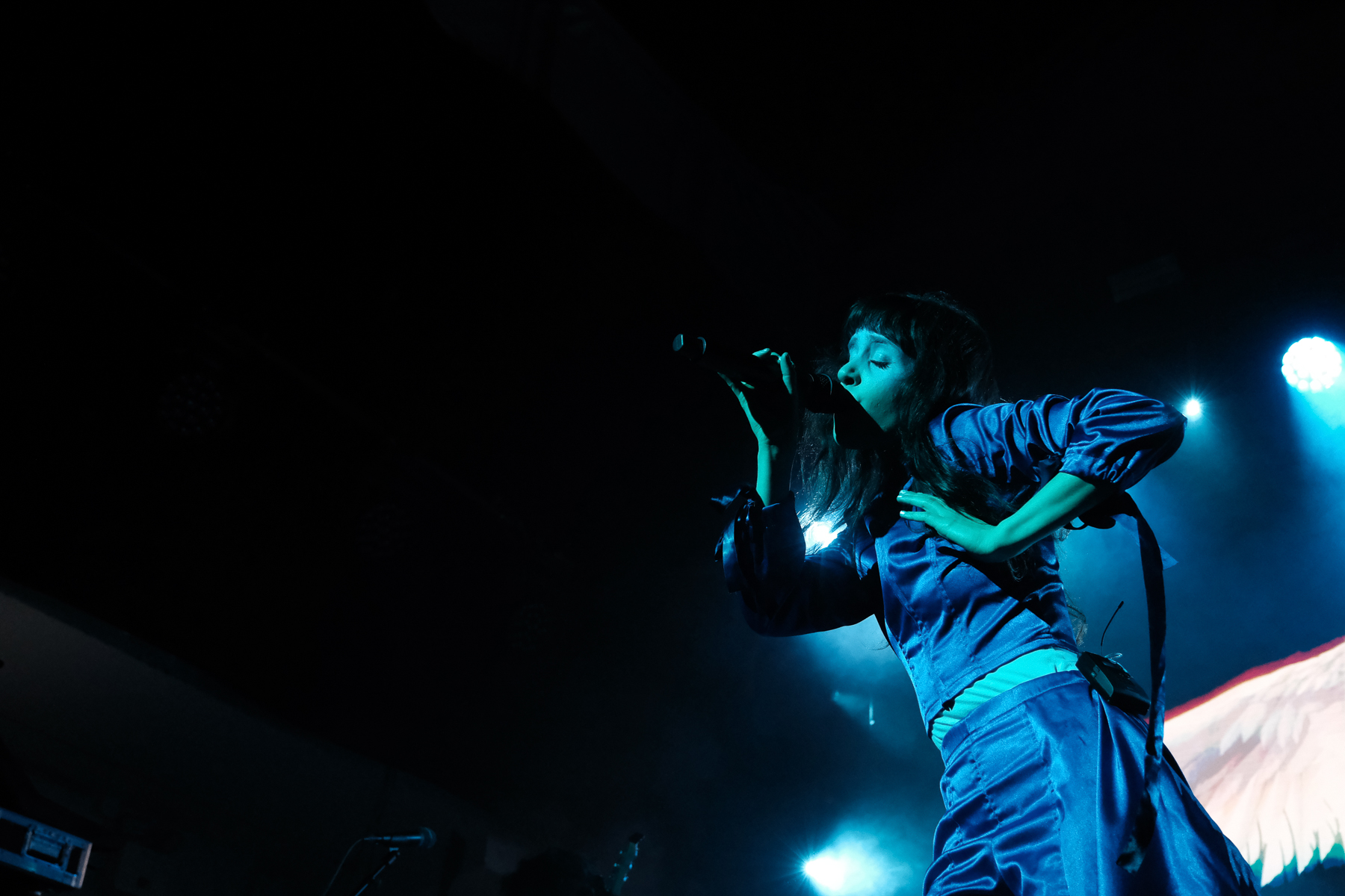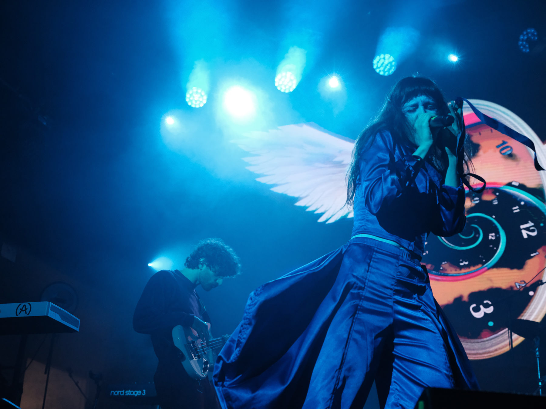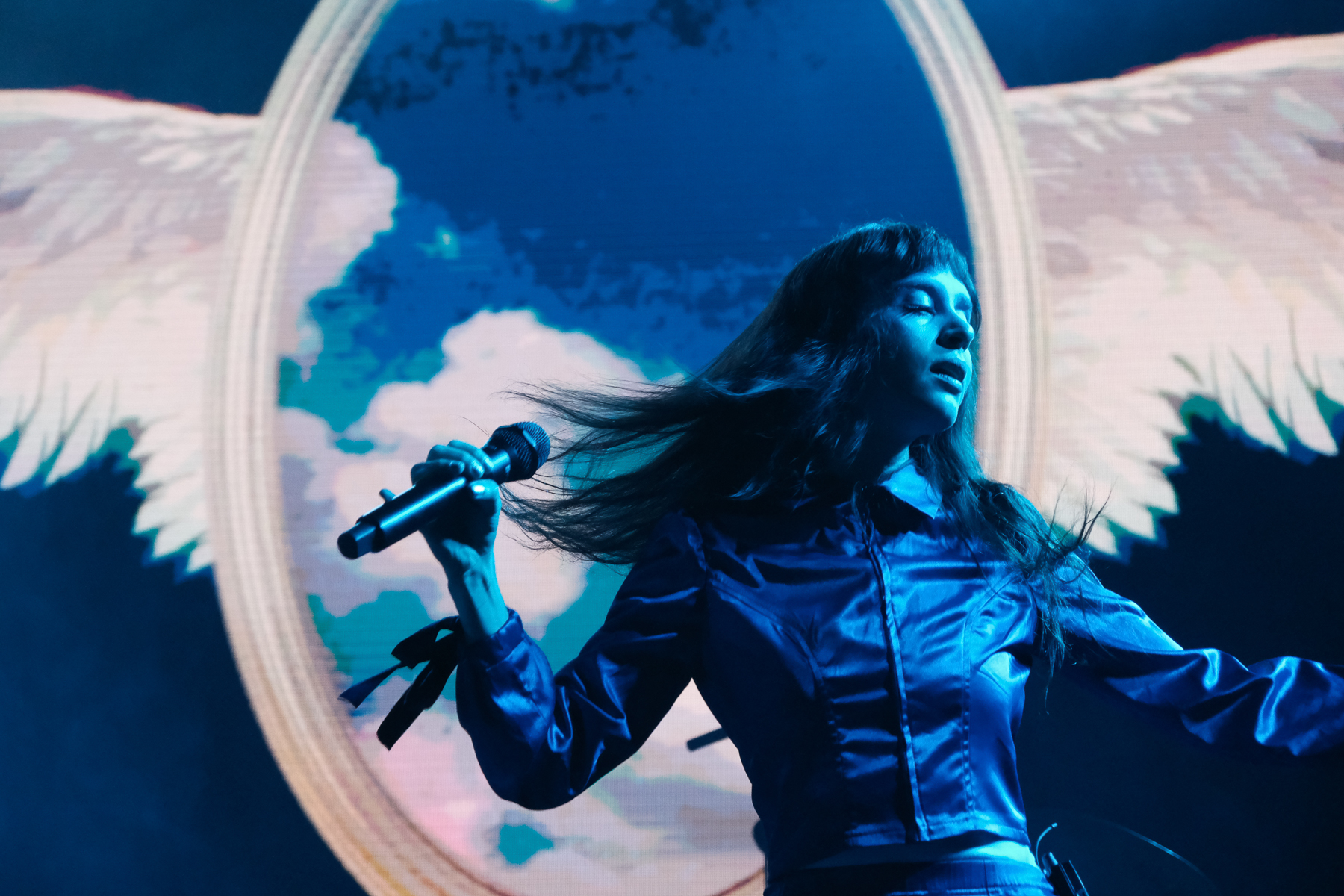 As the show starts, the visual is centred on an ornate gold frame with lightly flapping wings. In the frame oscillates a menagerie of short clips: singer Mica Tenenbaum serenading you, hypnotic spirals, the earth, animals, clocks, biological diagrams of eyes, and much, much more. They’ve got a characteristic tint of grainy VHS-esqe warp to their visuals that aligns with their synthy, internet-pop music and creation of a world that feels both reminiscent of the beginning of the internet and 1000 years into the future. Mica is fully immersed into this world while performing, and it works. There are costume changes, lighting warps the created world and the mood, and there’s a level of theatrics that lets you immerse yourself too. The crowd was having fun; there was one Icelandic guy in front of me who knew every word and ended the last song with sweaty hair and a huge smile. So. Much. Fun.