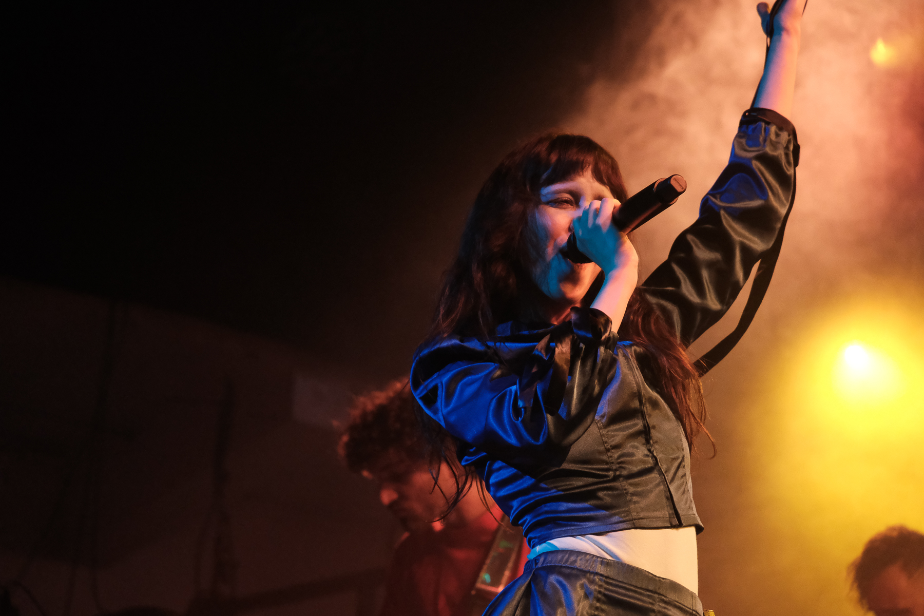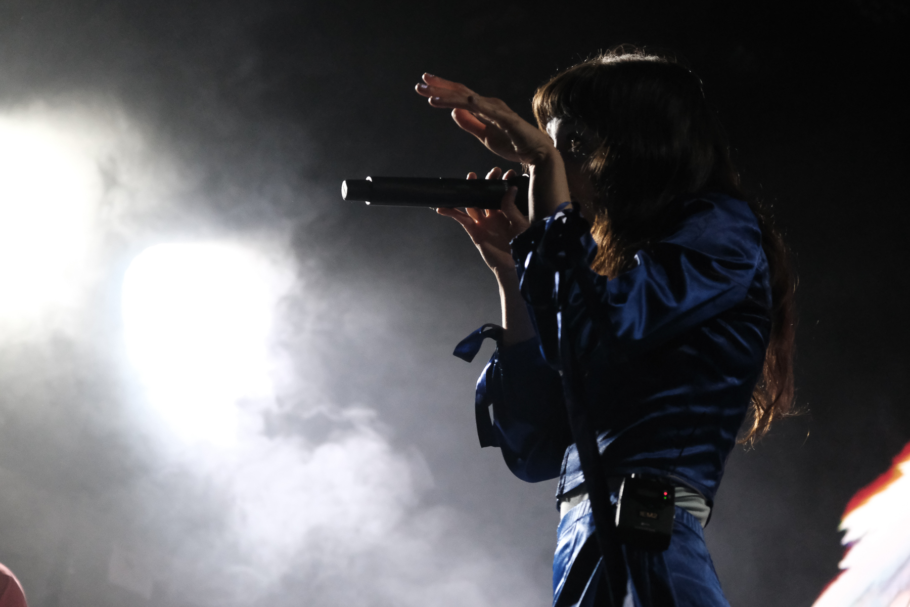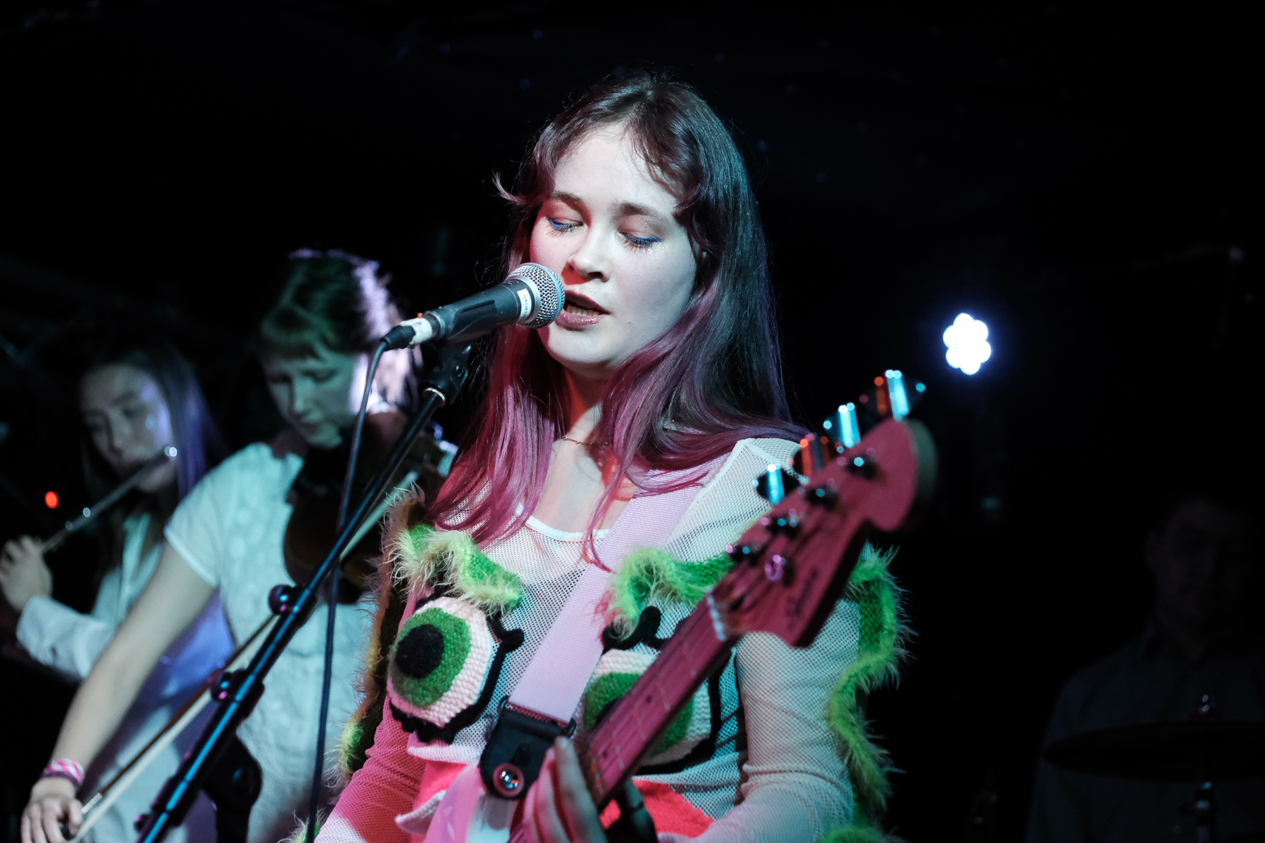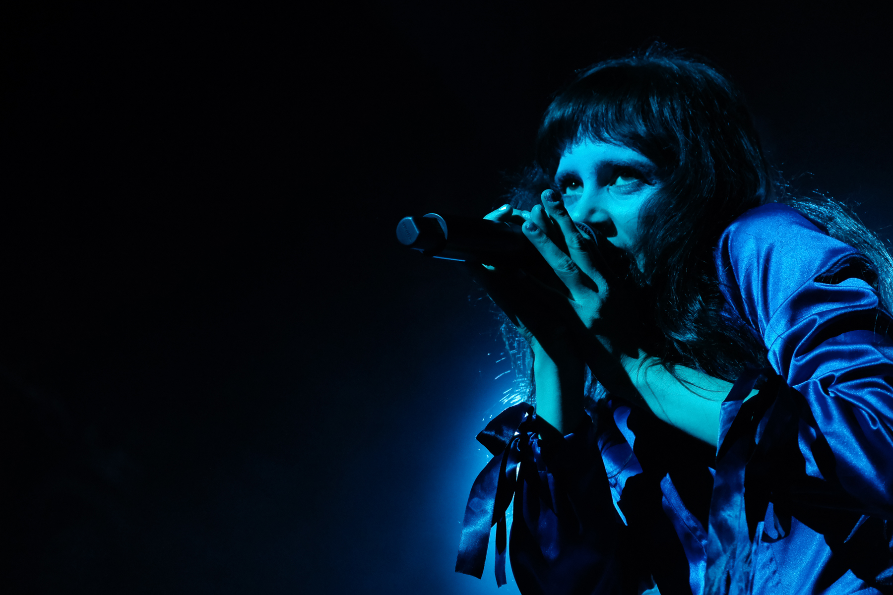As the show starts, the visual is centred on an ornate gold frame with lightly flapping wings. In the frame oscillates a menagerie of short clips: singer Mica Tenenbaum serenading you, hypnotic spirals, the earth, animals, clocks, biological diagrams of eyes, and much, much more. They’ve got a characteristic tint of grainy VHS-esqe warp to their visuals that aligns with their synthy, internet-pop music and creation of a world that feels both reminiscent of the beginning of the internet and 1000 years into the future. Mica is fully immersed into this world while performing, and it works. There are costume changes, lighting warps the created world and the mood, and there’s a level of theatrics that lets you immerse yourself too. The crowd was having fun; there was one Icelandic guy in front of me who knew every word and ended the last song with sweaty hair and a huge smile. So. Much. Fun.
