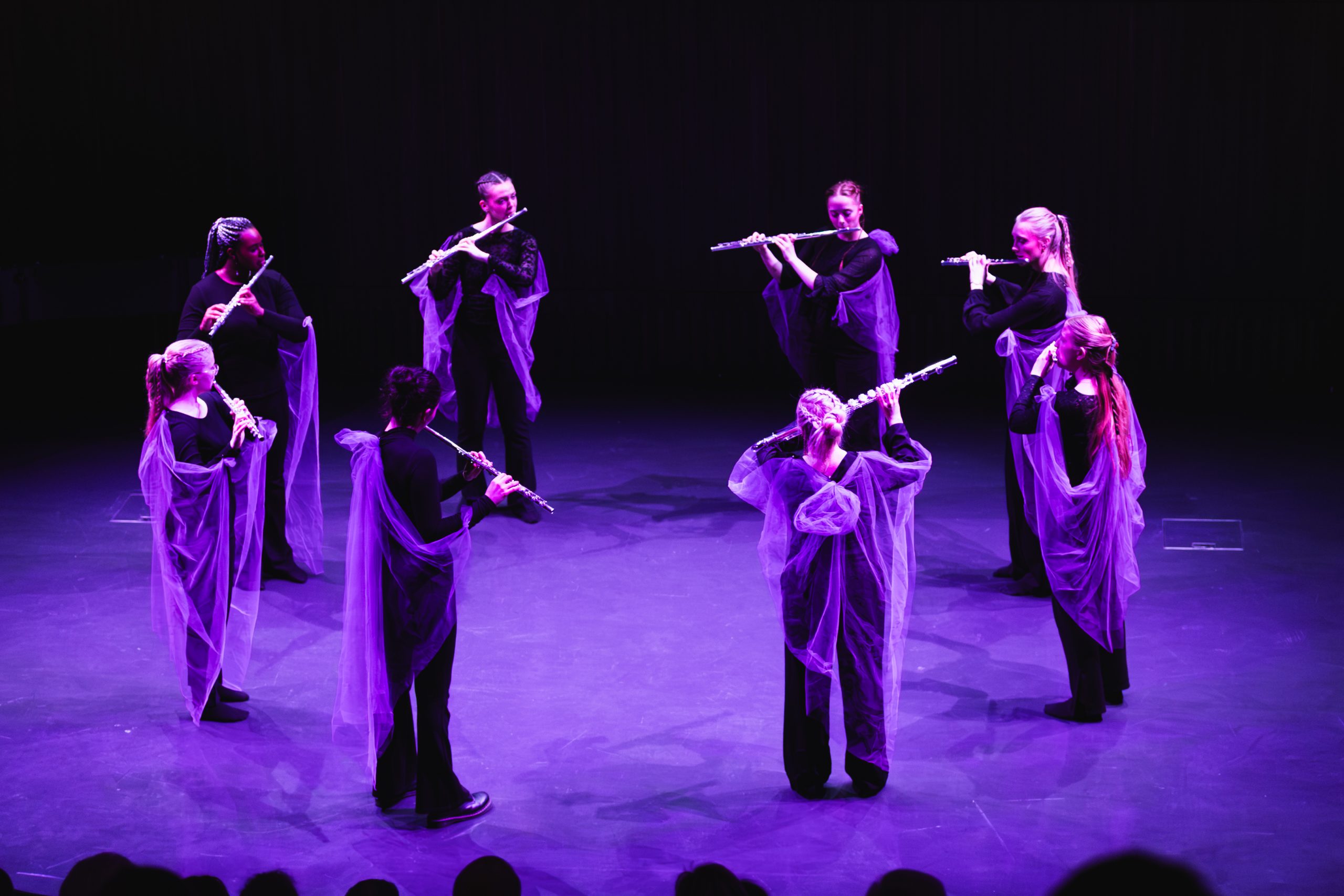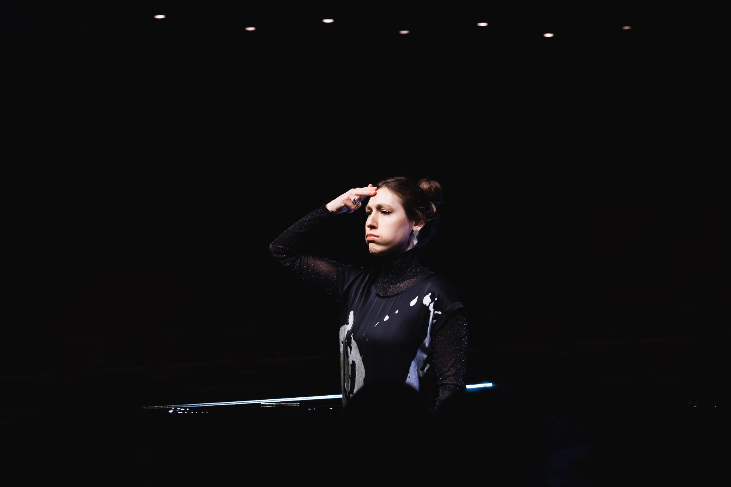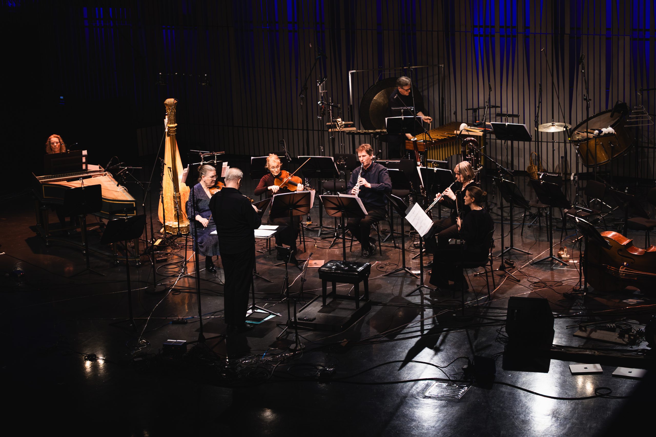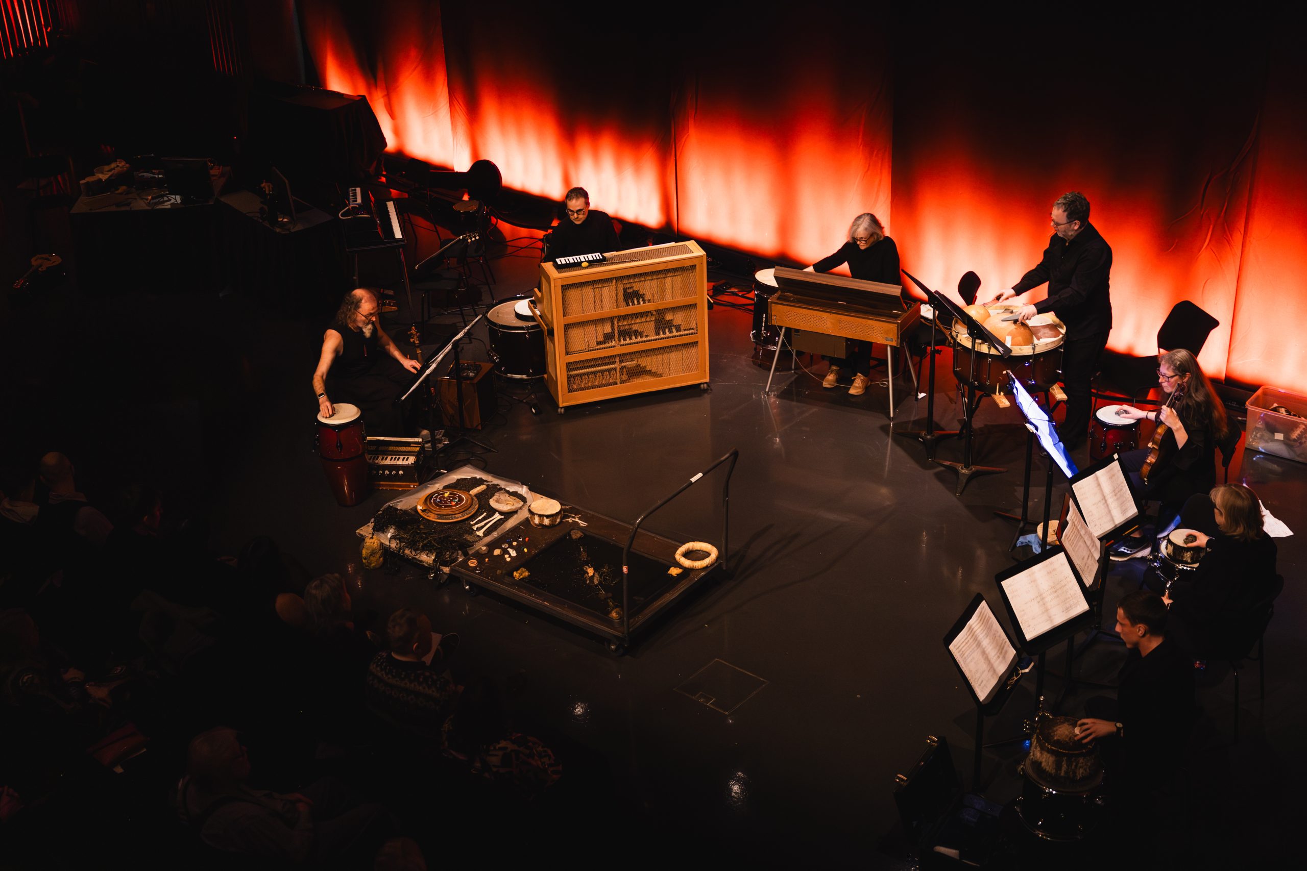 One piece that keeps on reverberating long after its final note, is Bergrún Snæbjörnsdóttir’s Intraloper, premiered by brass ensemble APPARAT. Behind the musicians hang vibrating metal plates, illuminated by ominous red light. Before APPARAT even starts playing, the sound of vibrating metal already fills the space with suspense. Slowly the ensemble comes to life: snoring, whispering and stretching as if an organism is growing and pulsating in the room. The light switches to cold white and for the first time in the piece, the brass instruments fully utilise their sound. Sound continues to resonate through the metal sheets, even when the instruments are not playing. It is as if there is always something lurking behind the ensemble, a composition that happens in the margins.