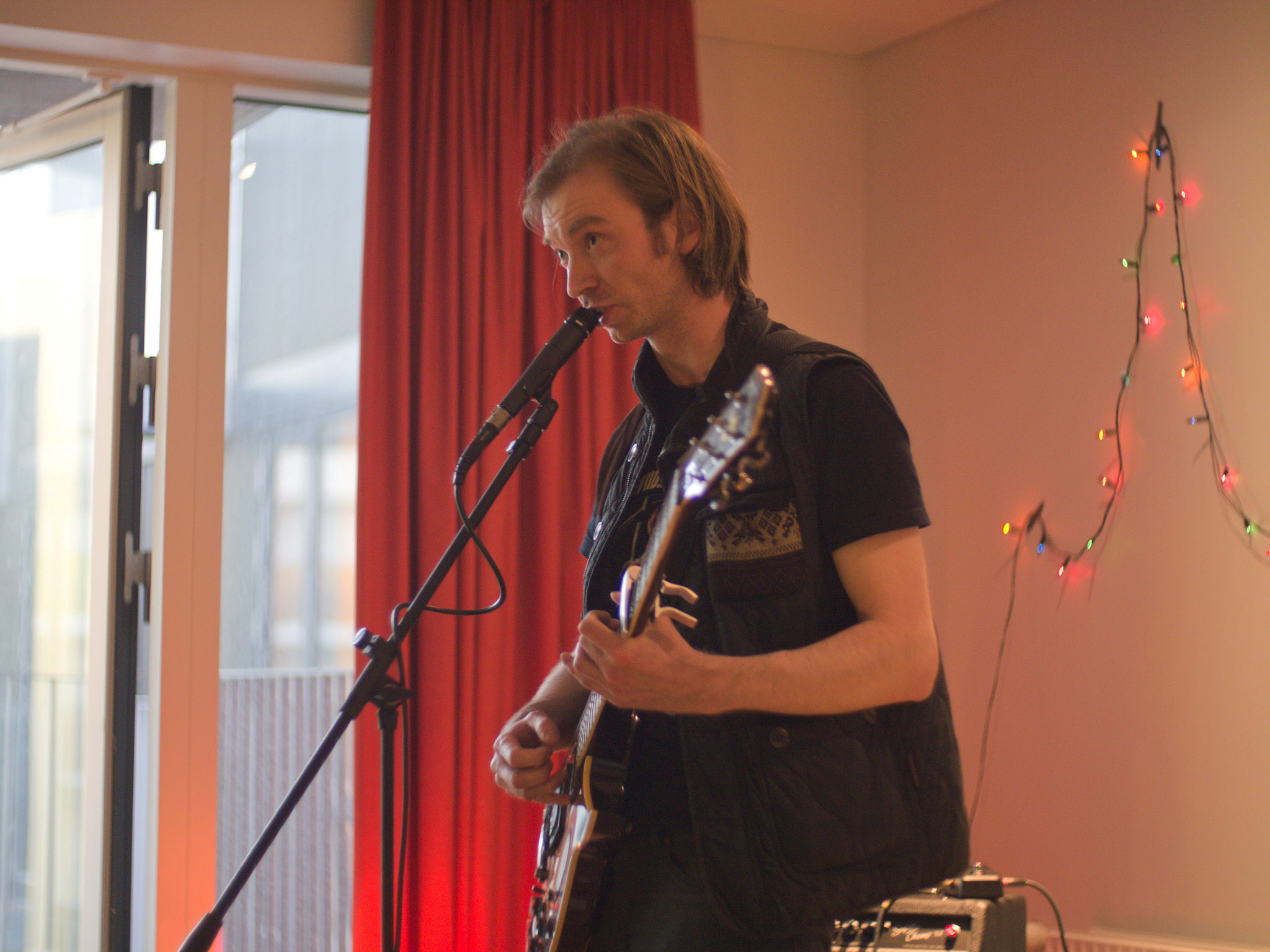 This was the secret password to score entry into a Sofar Sounds secret show, which I attended last night at a University of Iceland dorm with some fellow Grapevine interns. Sofar Sounds is a music discovery community in the form of a secret club that puts on small, intimate shows all over the world. They’re invite only and usually held in the living room of someone who has volunteered to host, sort of like Airbnb for performances. Getting to this performance felt like a clandestine rendezvous, since all we had to go on was an email from our friend, one of the performers that night. We had the number of the dorm building, but that was it. No one was waiting at the door to let people in and there was no one to call, so we just had to wait in the lobby until a student happened to leave and open the door for us. We hustled up the stairs, following the sound of music, took our shoes off and got inside in time to see the rest of Þausk’s set.