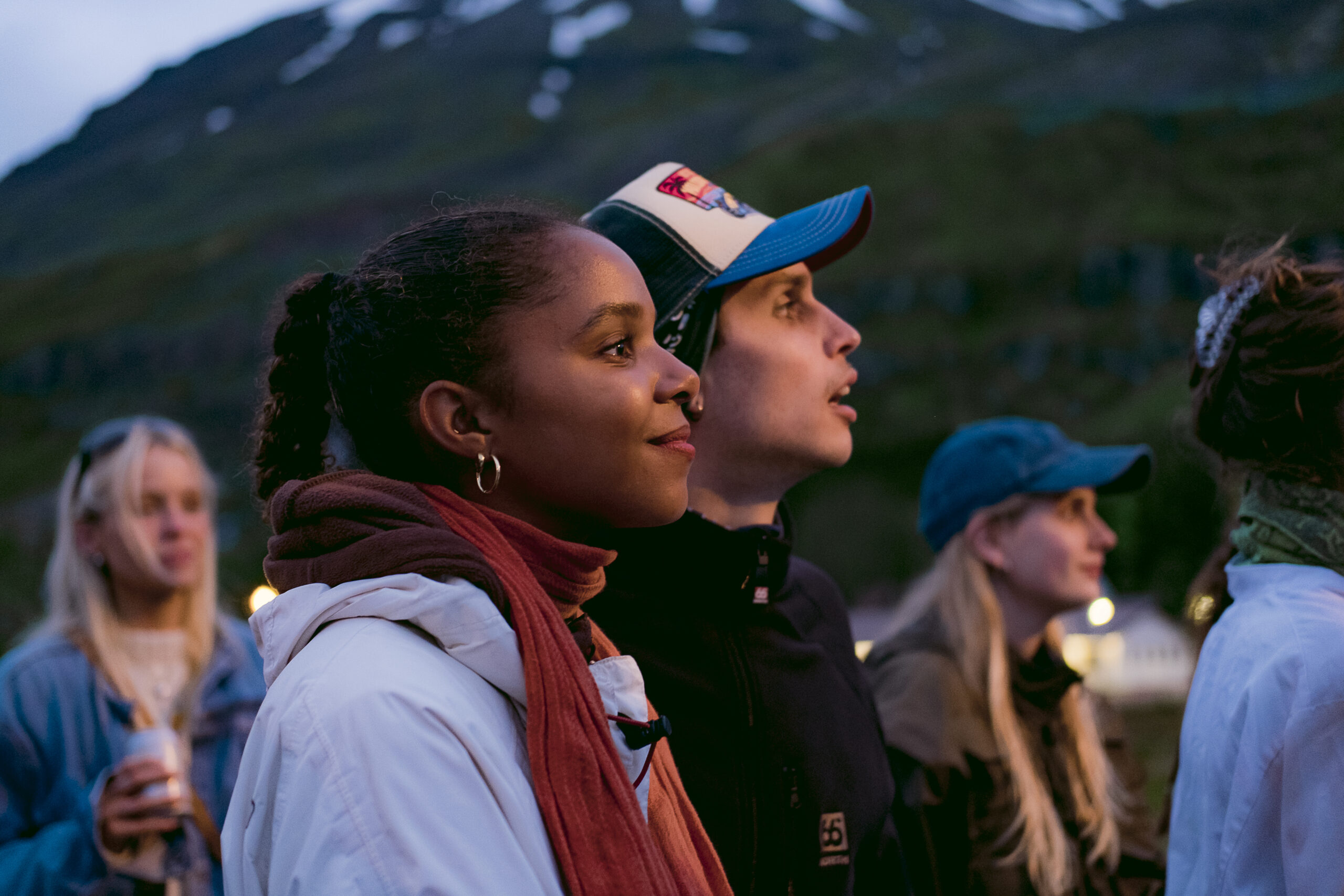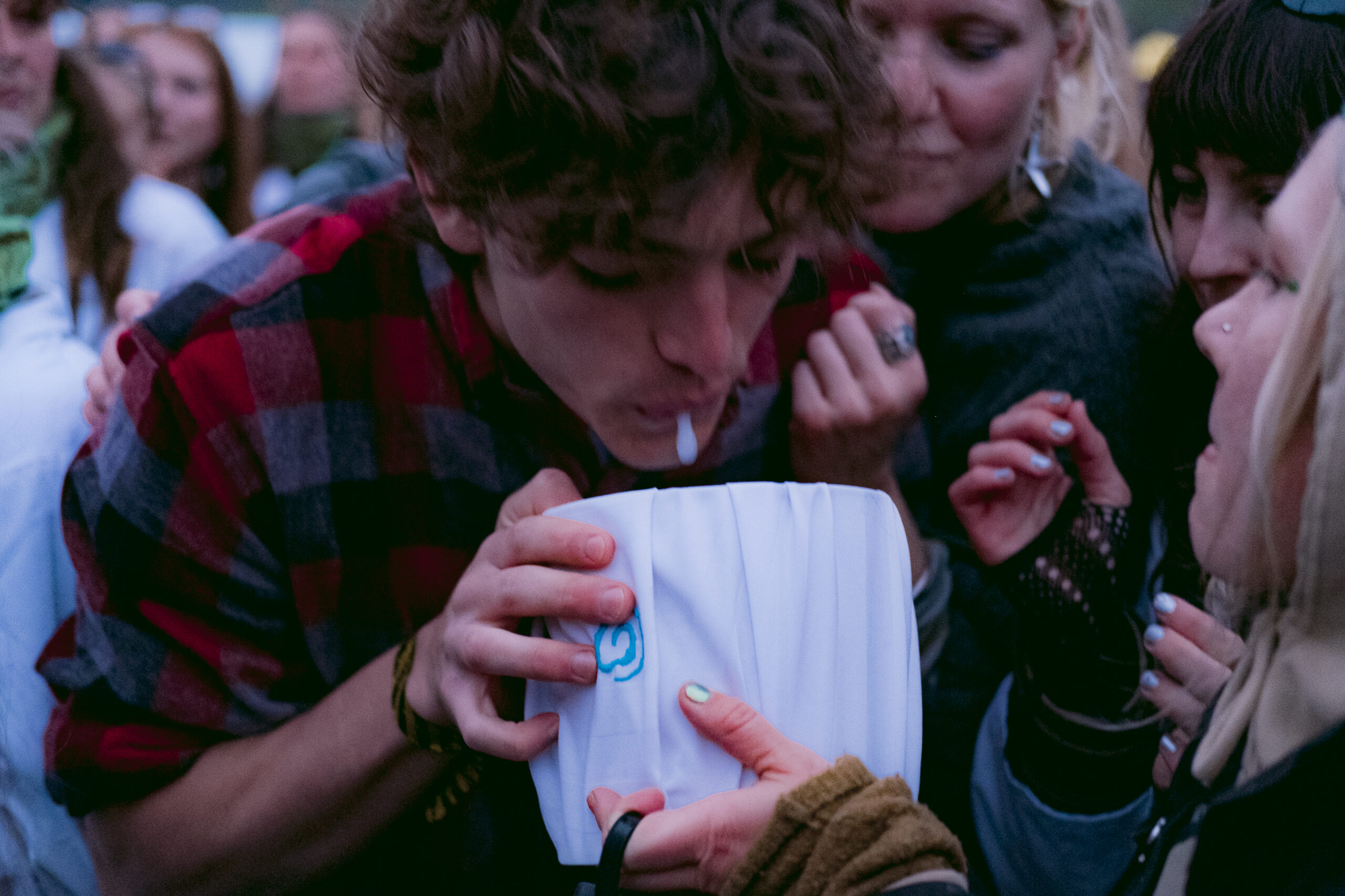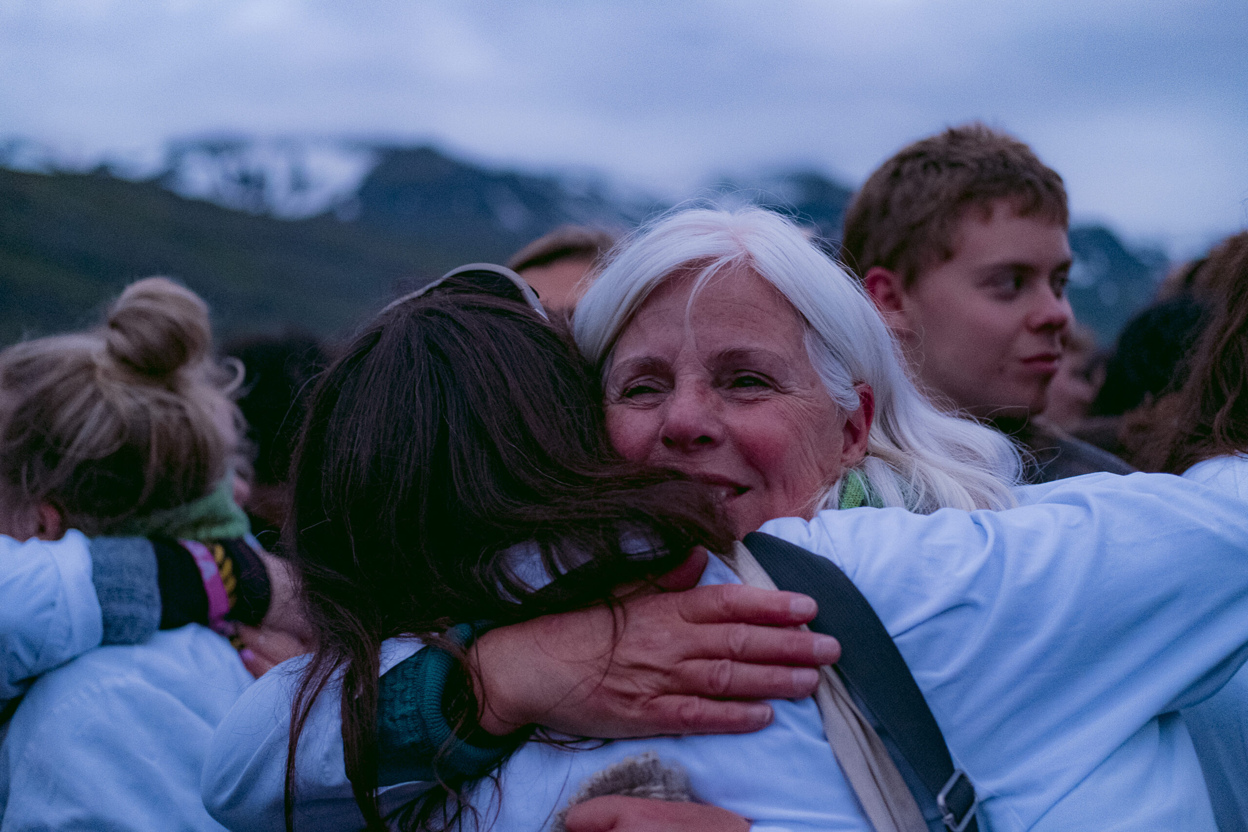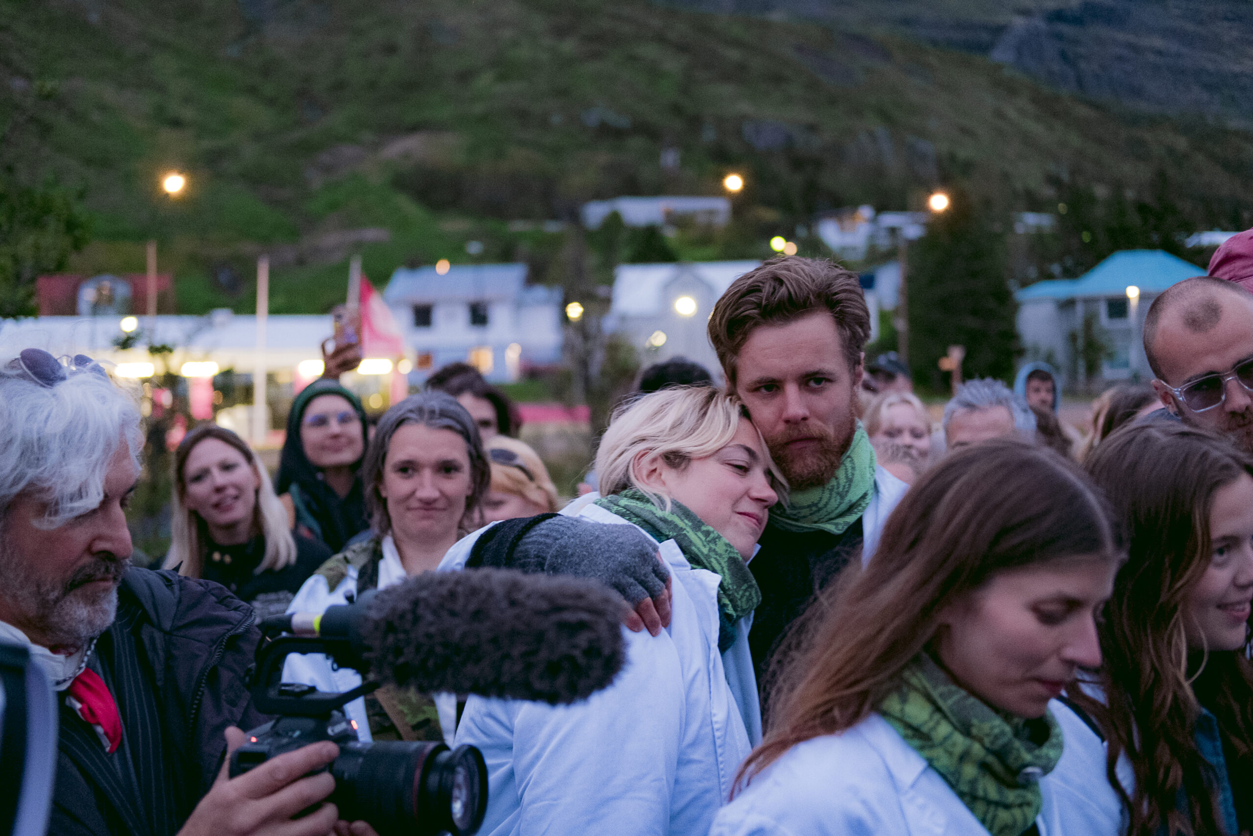The makeshift funeral takes place at a spot by the waterside. An urn is passed around, and attendees are invited to spit into it — preserving a part of themselves in this moment, to be buried along with LungA. Voices wail, “LungA er jarðað í dag” (“LungA is buried today”), with the mourners hugging, shedding tears, or looking towards the far horizon.