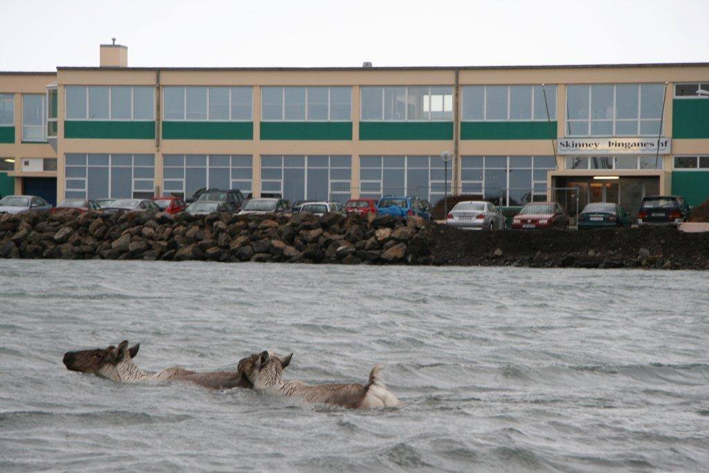 A couple of reindeer swam into Höfn harbour in Hornafjörður yesterday, surprising boat captain, Gunnar Ásgeirsson, as they appeared alongside his boat.