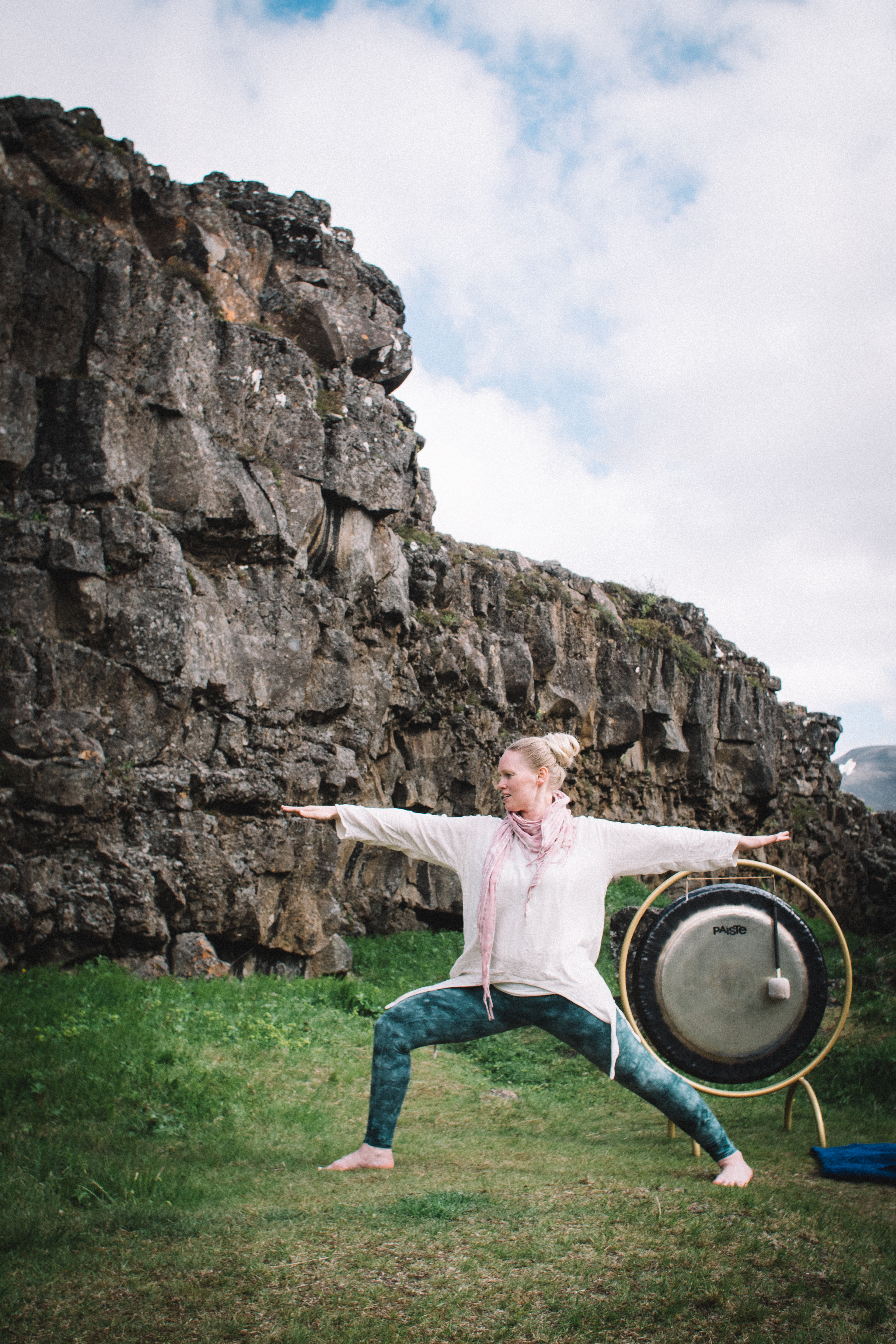 Not long later, we take a left from the main road, heading away from the most popular tourist area of Þingvellir. We pull over in a craggy, wild area of the park, and head up a short path to a grassy crevasse. Arnbjörg carries a large case with her that contains the gong for the meditation session. We down our bags and spread out between the rocky walls of the chasm, starting with some breathing exercises before Arnbjörg leads us through some stretches and a gentle, basic yoga routine.