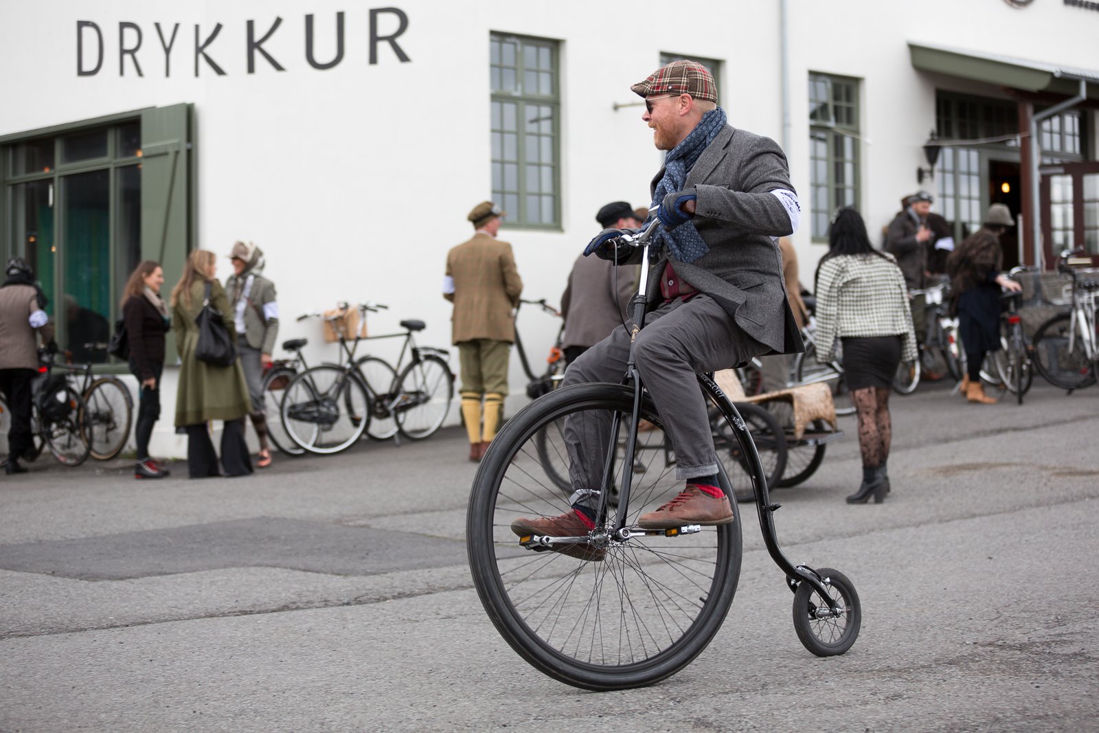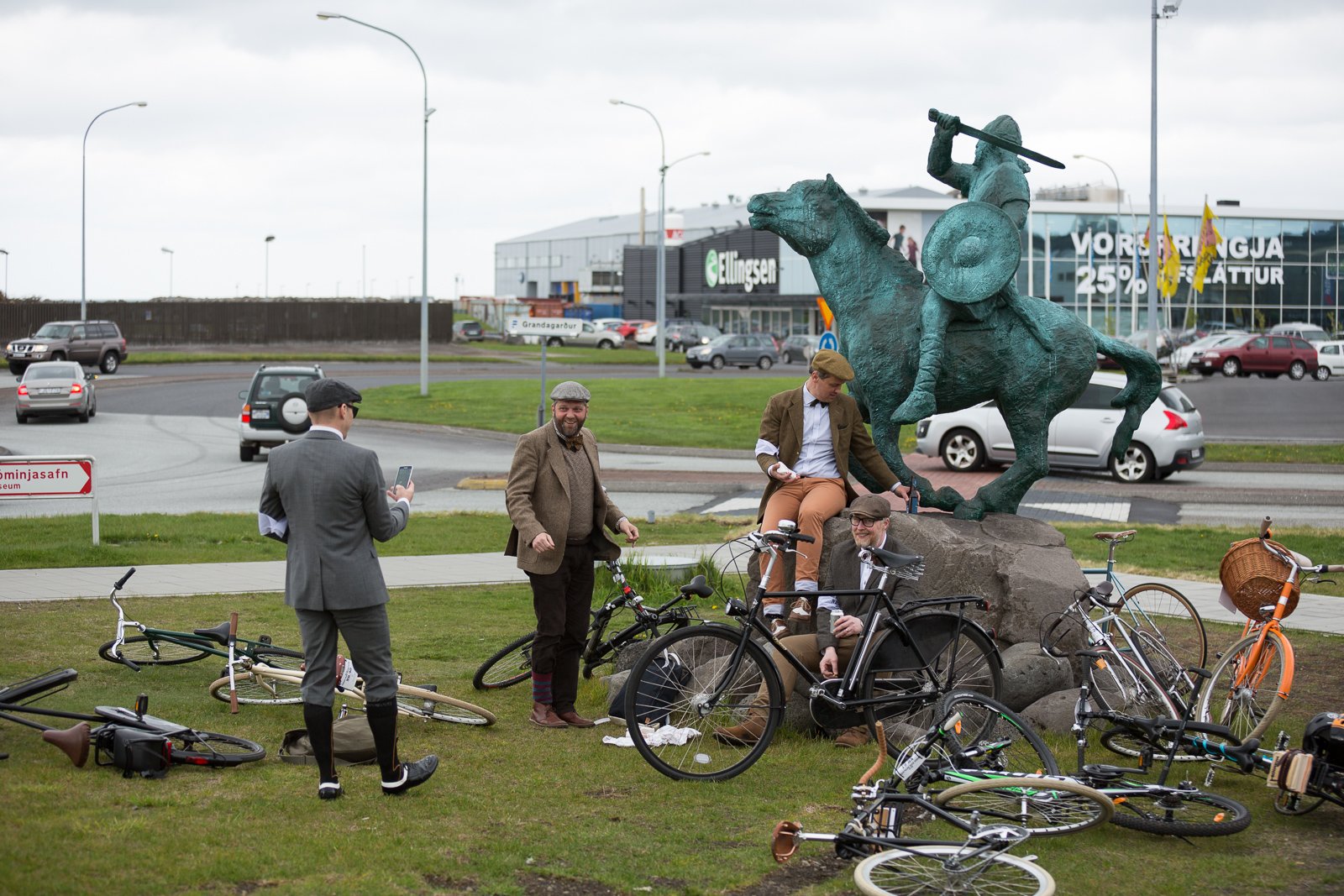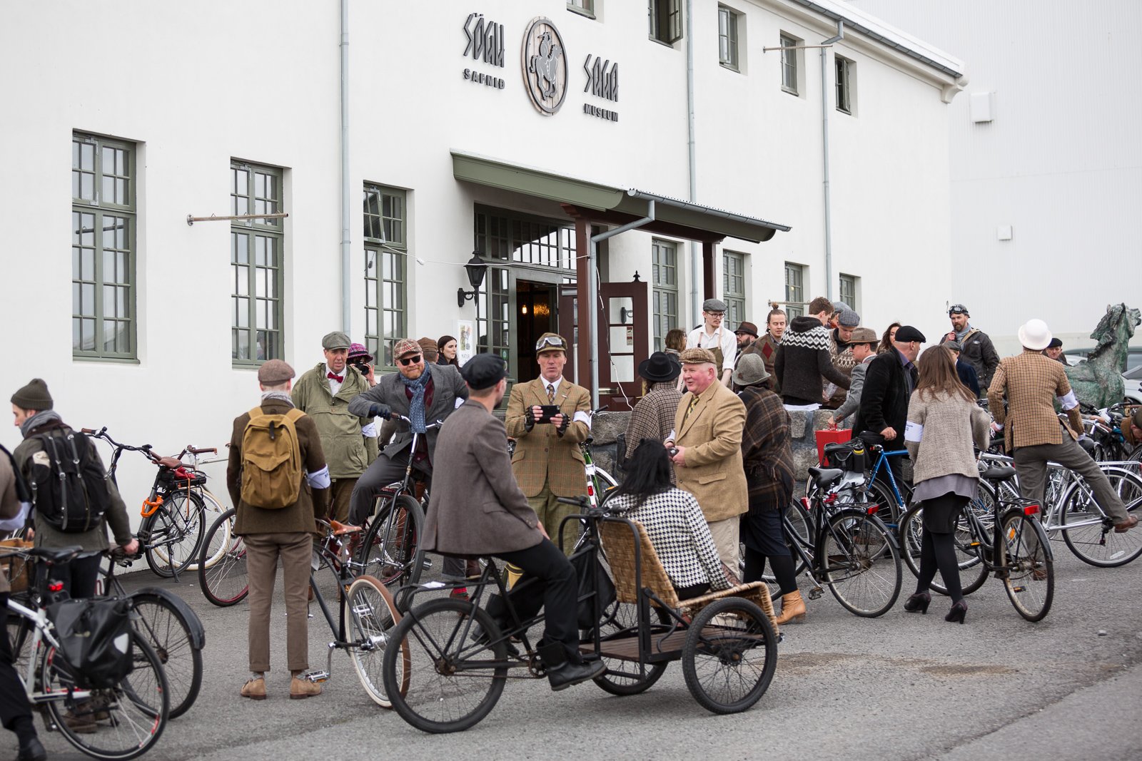 The participants got dressed up in typical English old-fashioned clothing and brought their antique bikes to Hallgrímskirkja church on top of Skólavörðustígur. The ride went from the church down to The Pond (Tjörnin) where the riders turned west for Hringbraut. From there they headed for refreshments at Matur og Drykkur at Grandagarður. Finally, the riders headed back east for Kex Hostel for a final celebration.