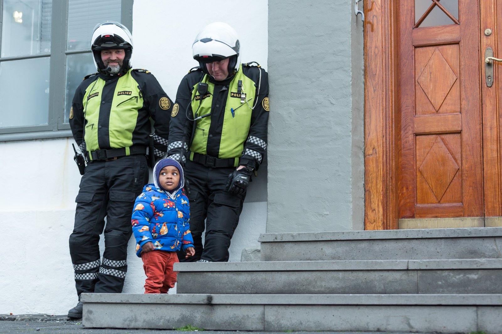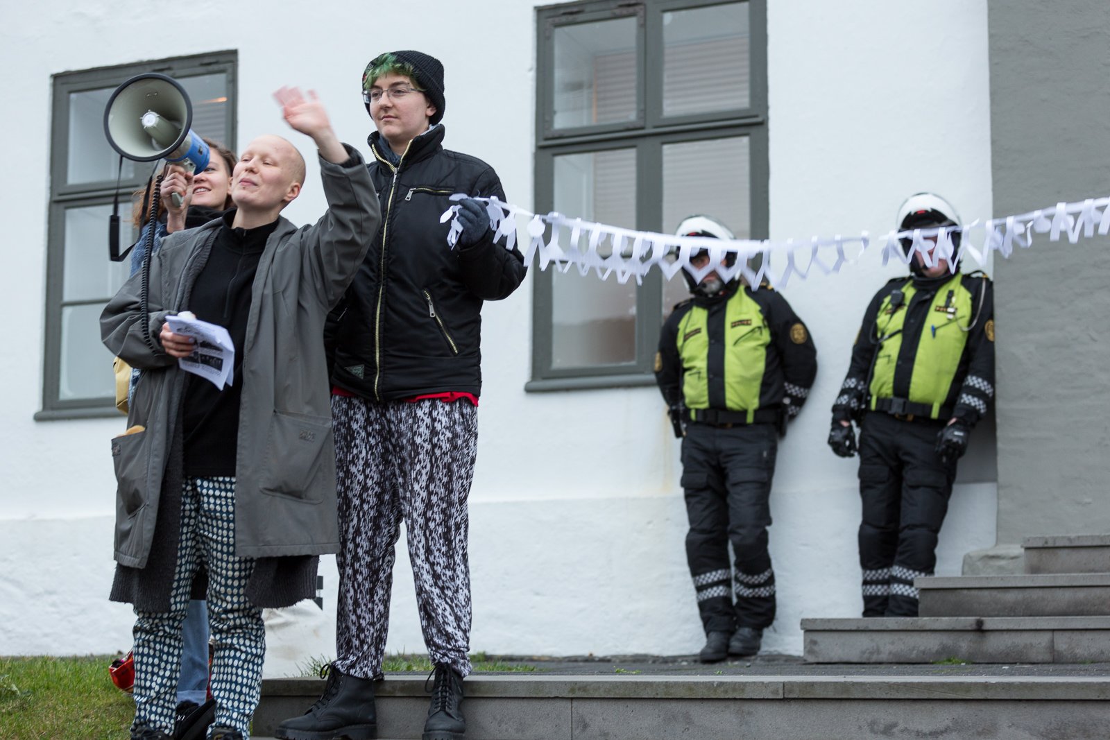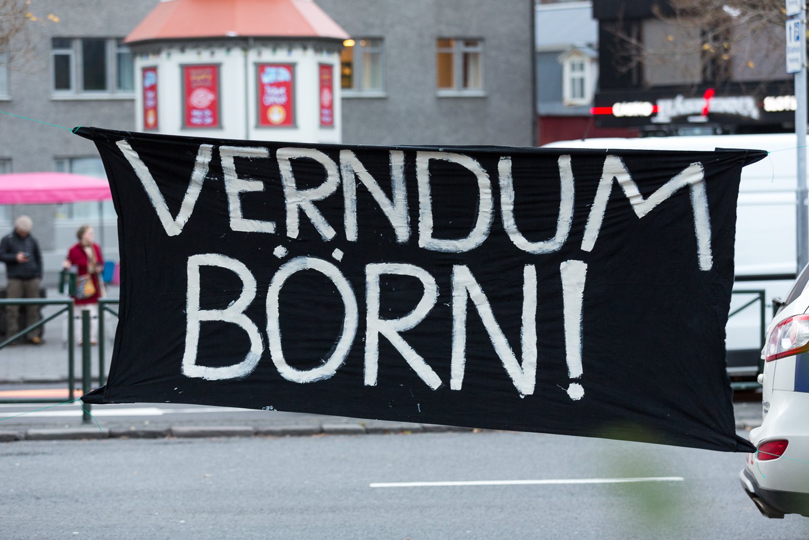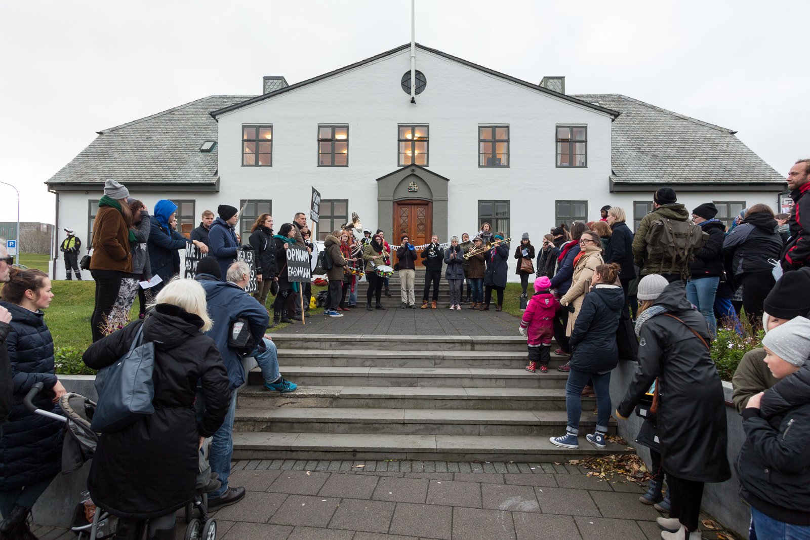 Banners were festooned around Government Offices as people formed a gauntlet leading to the front door of the building. Protesters on the scene pointed out that, according to Article 21 of the Act on Foreigners, “a foreigner born in Iceland, who has since resided permanently and continuously in Iceland, can not denied entry to Iceland or expelled from Iceland”. Despite this fact, the Directorate of Immigration (UTL) has deported or ordered the deportation of families, some with young children who were born in Iceland.