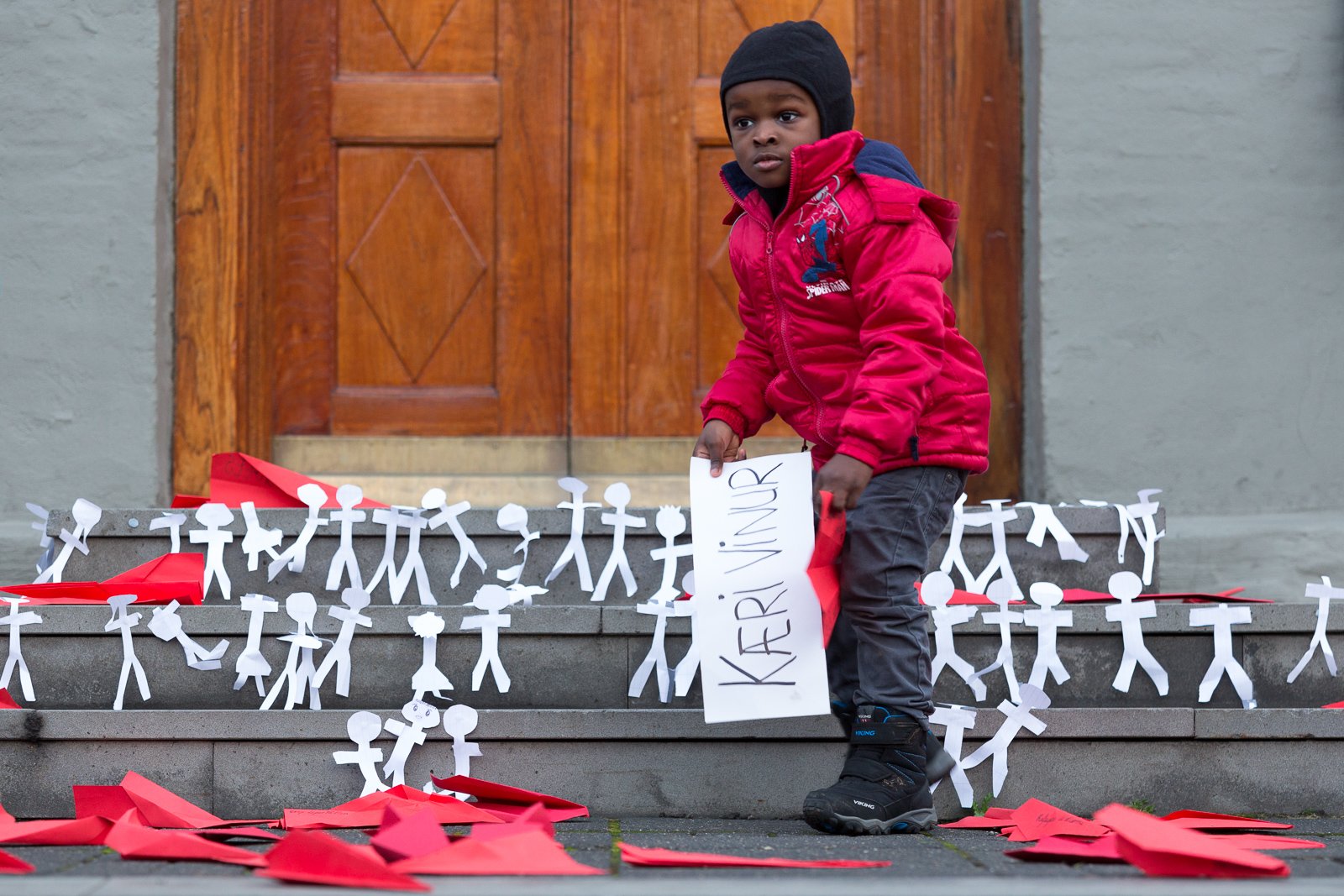 At the protest’s conclusion, people were invited to stick a paper doll to the steps of the Government Offices, with each paper doll representing a child that has been deported from Iceland. Red paper planes were also distributed, and flown at or around the building.