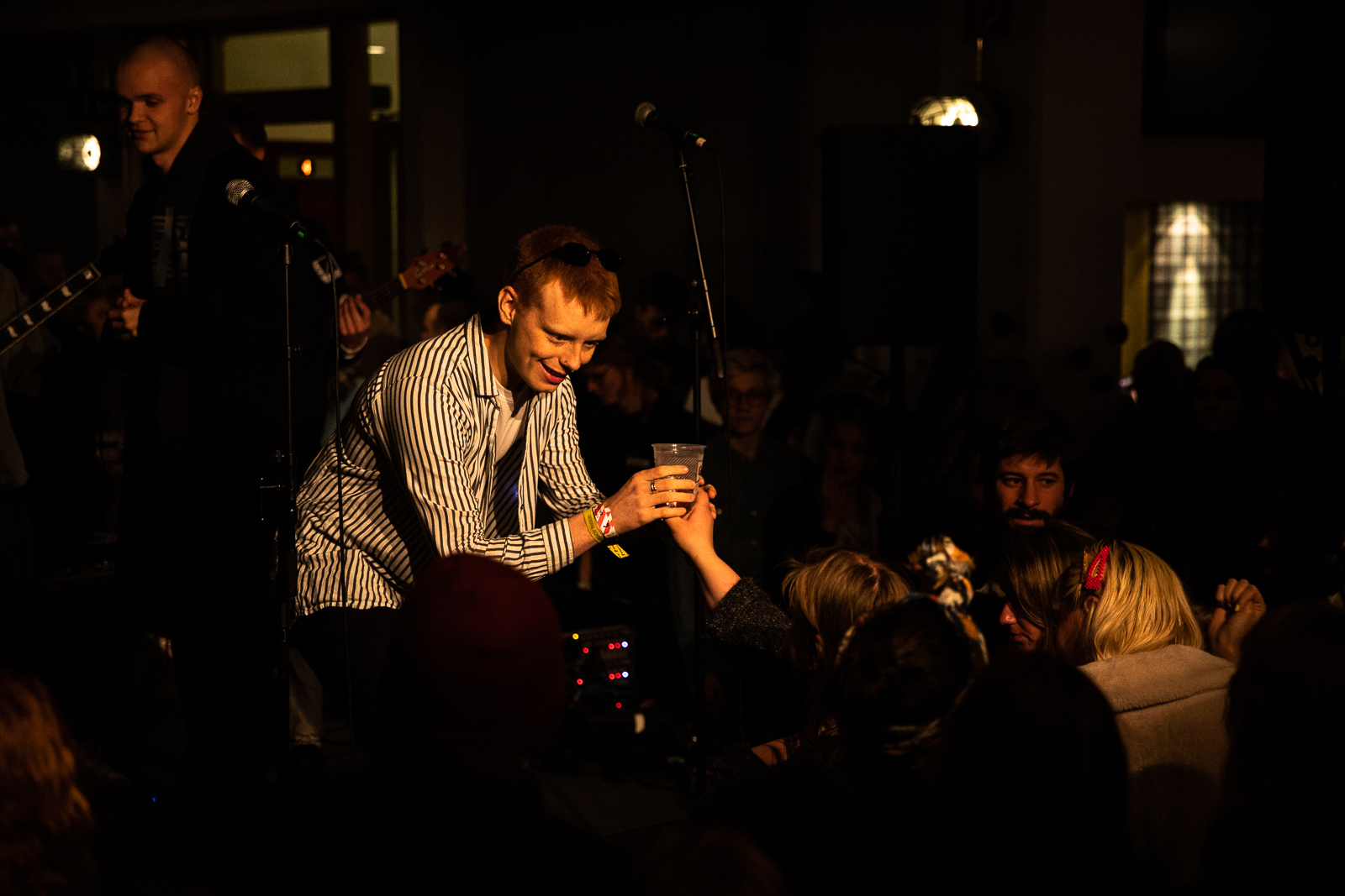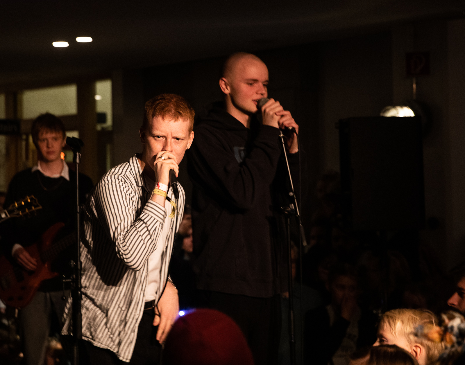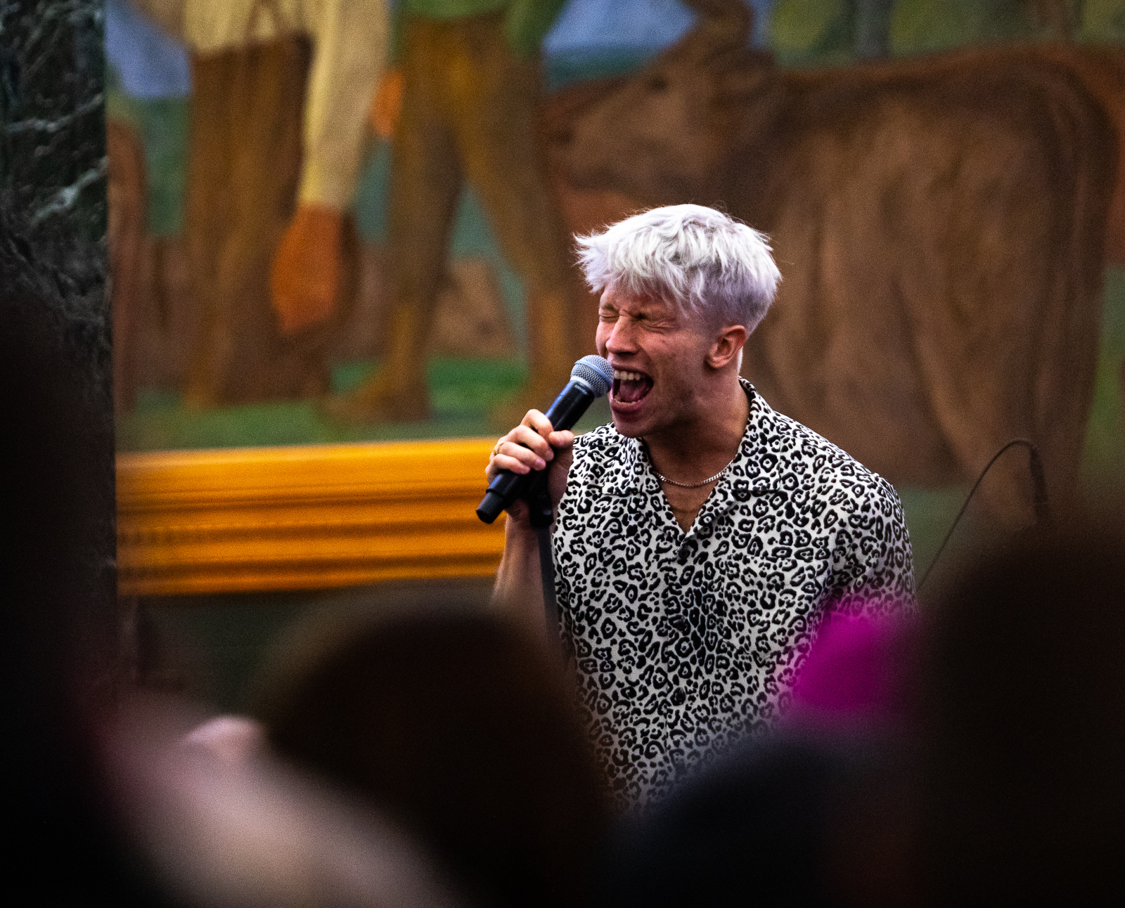 Auður played at the Reykjavík Art Museum, He was in a skin-tight shirt and flexing these silver pants that looked like they had done a ton of cocaine before going onstage. But Auður was energetic, running around singing his lungs out. In the next song, he grabbed an electric guitar and played it seamlessly, aiming it into the crowd like he was literally going to burst all over.