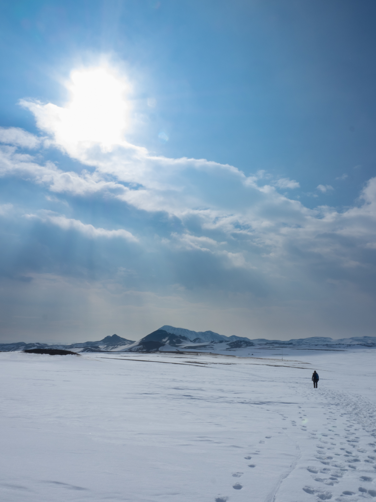 Solitude score: Very high. There was not a single soul to be seen anywhere at the power station, which made it a slightly eerie experience. And on the hike to the crater the only other humans were those two tourist boys from Grjótagjá, (this time wearing more than their Speedos).