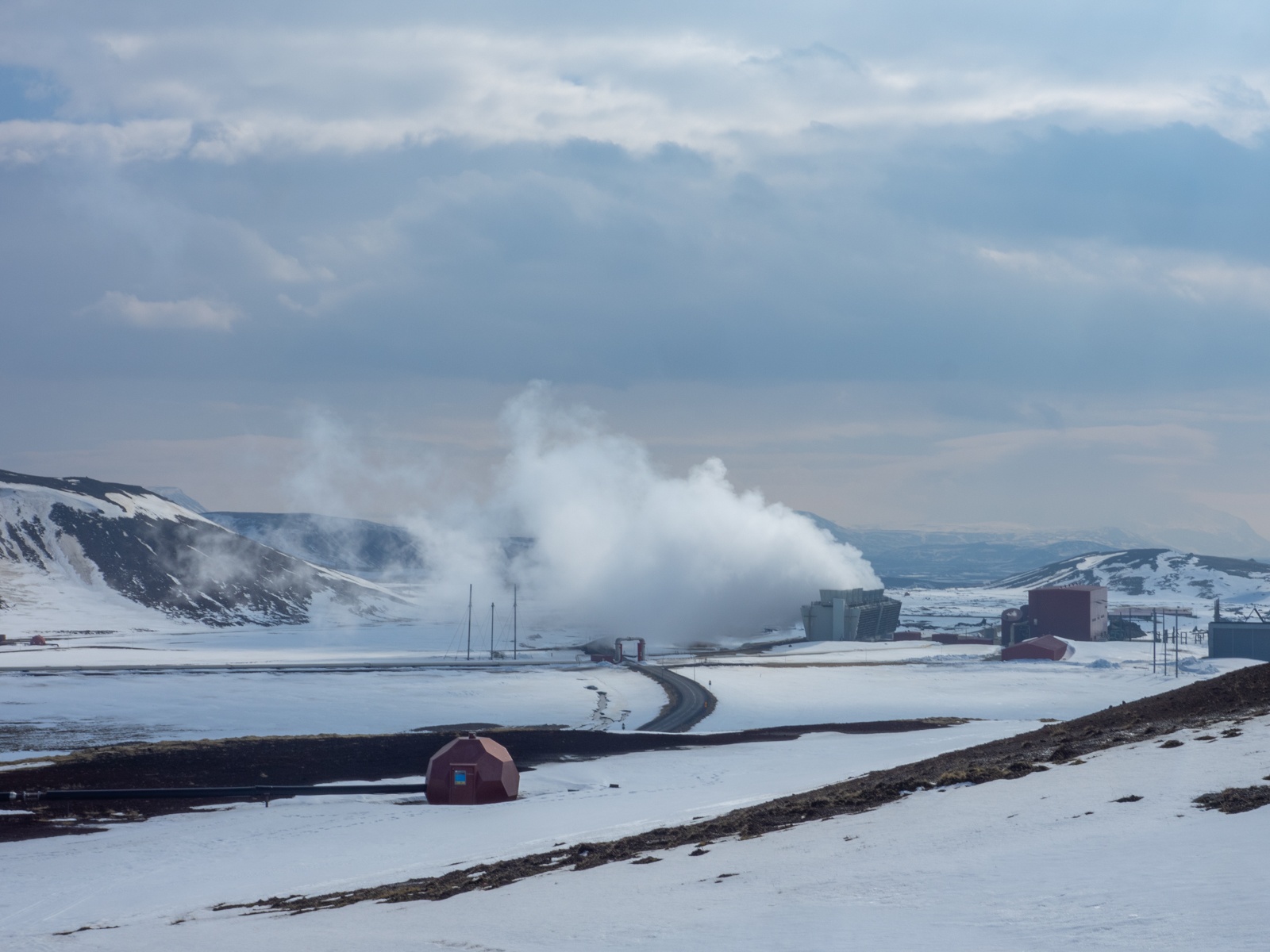 A short drive north from the Grjótagjá cave brought me to the geothermal power station and dormant volcano at Krafla. You can wander the station compound freely and marvel at the huge clouds of water vapour billowing from the plant at ground level and crossing the valley.