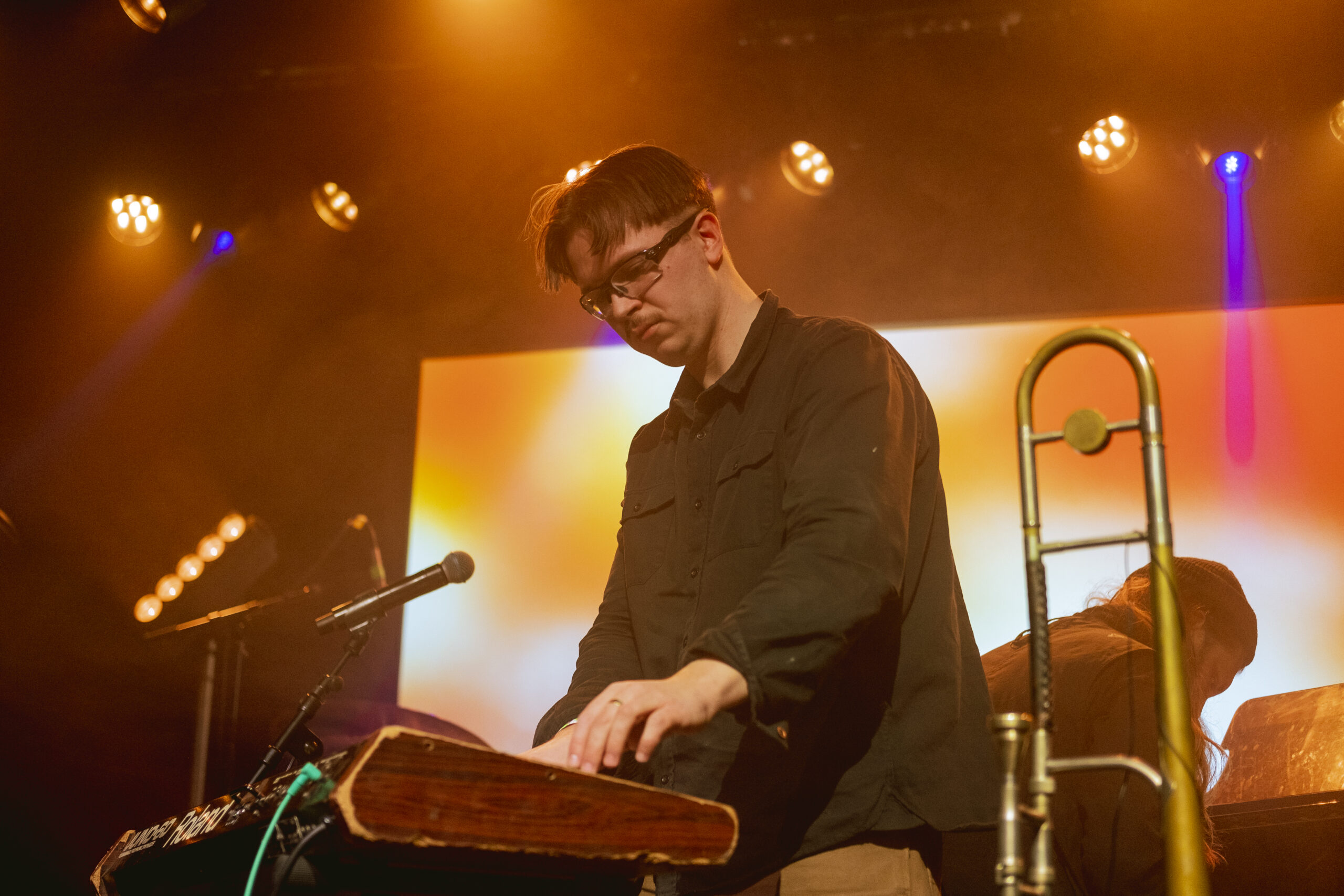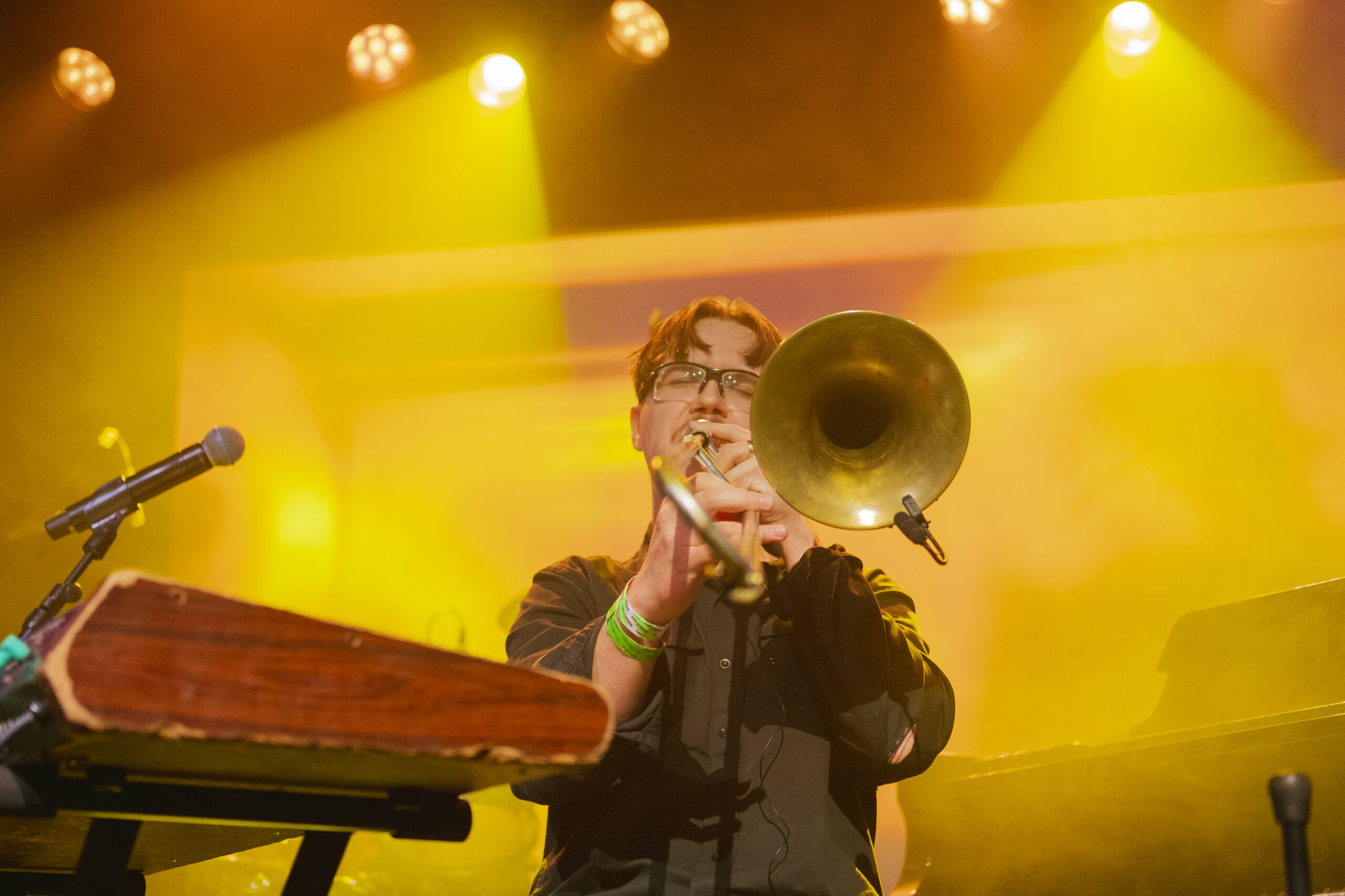 Hugar probably has the most instruments on stage that you’ll see tonight — you have a grand piano, trombone, flute, guitar, keys and something that I can’t even make sense of from afar.