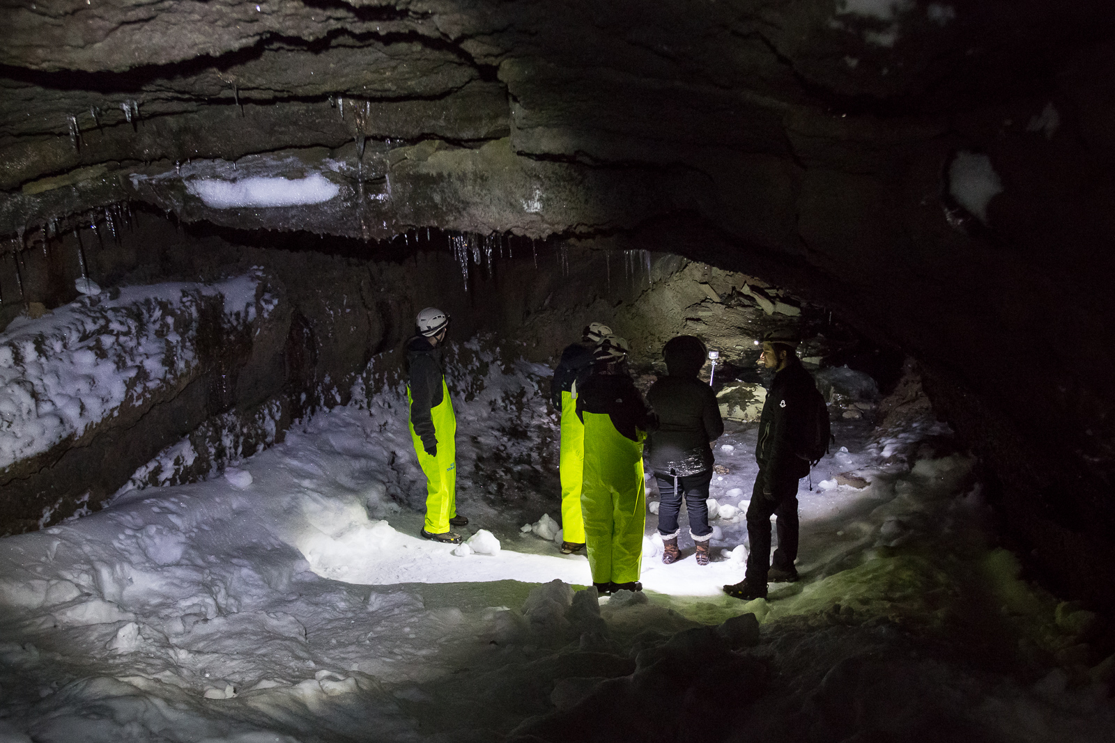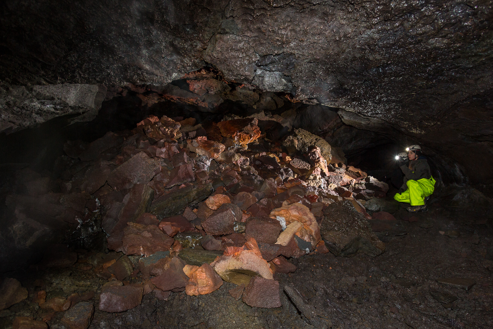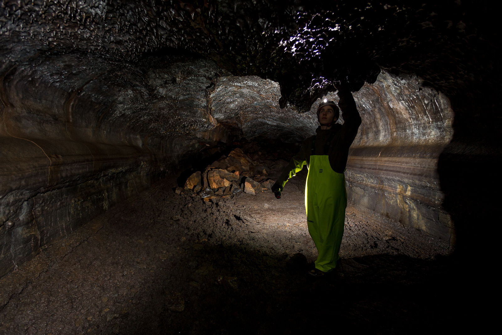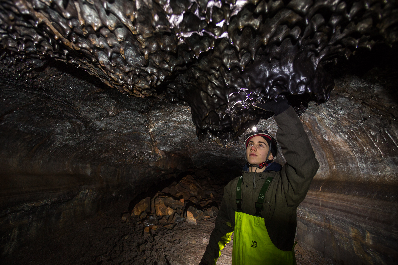 Equipped with helmets, lights and pretty nice neon-yellow fisherman’s pants, the seven of us are exploring Leiðarendi, one of hundreds of lava tubes in Iceland. It is located in the 2,000-year-old lava fields of Stóribolli on the Reykjanes peninsula, a mere thirty minutes outside of Reykjavík. “We can enter this tube only because its ceiling collapsed,” explains Adrien, who came to Iceland from Paris to be a diving guide and recently started caving as well. “Only a few lava tubes are accessible like this one,” he tells us. “Most are hidden and inaccessible underground.”