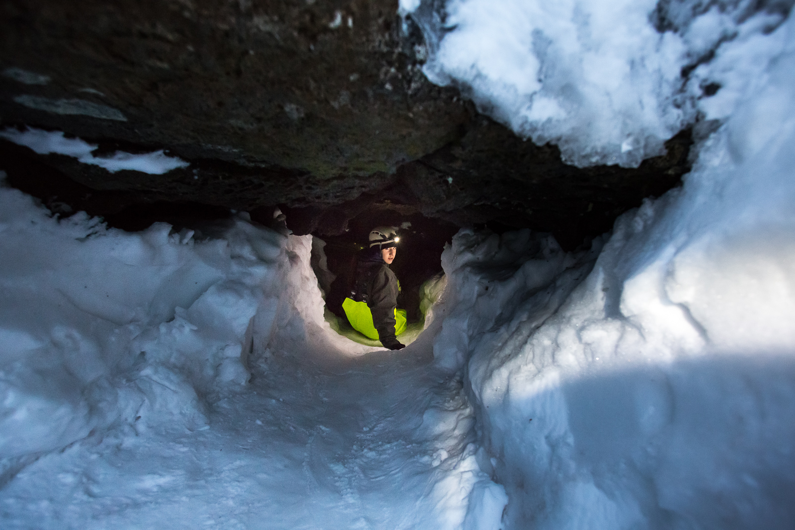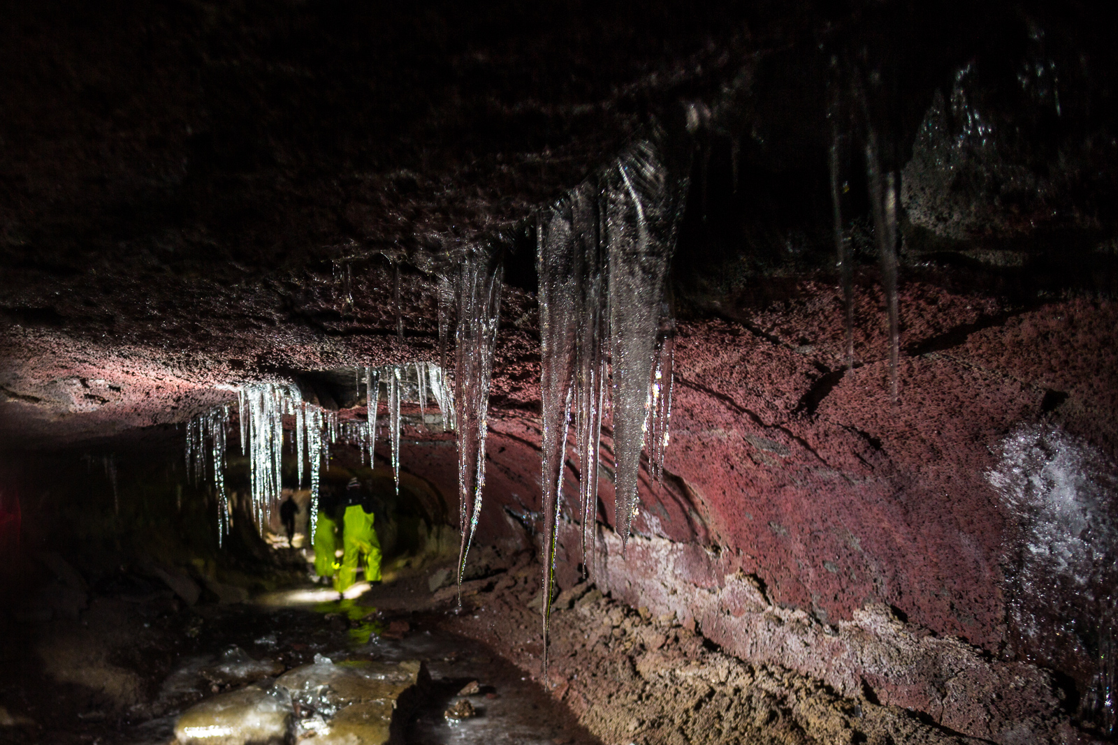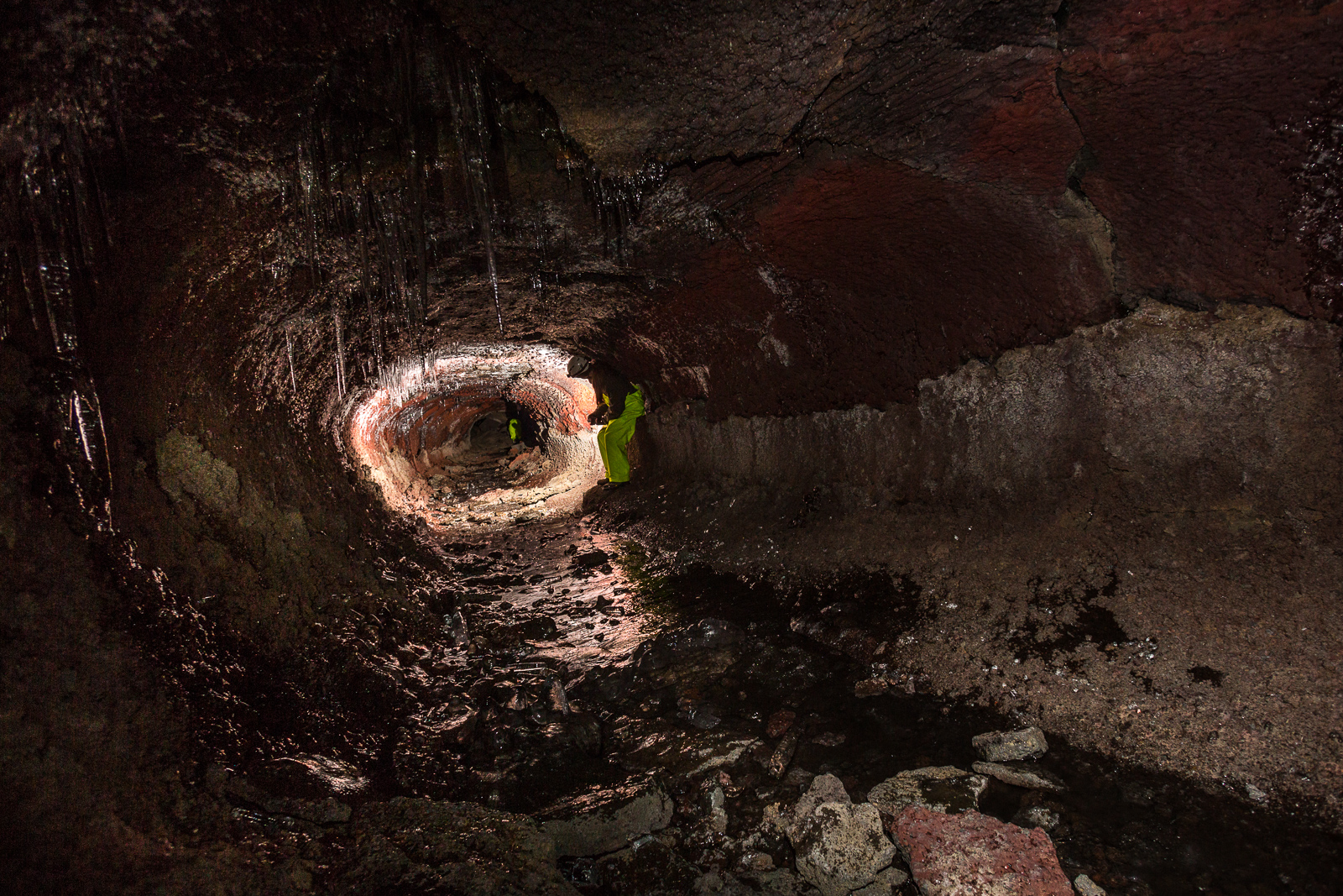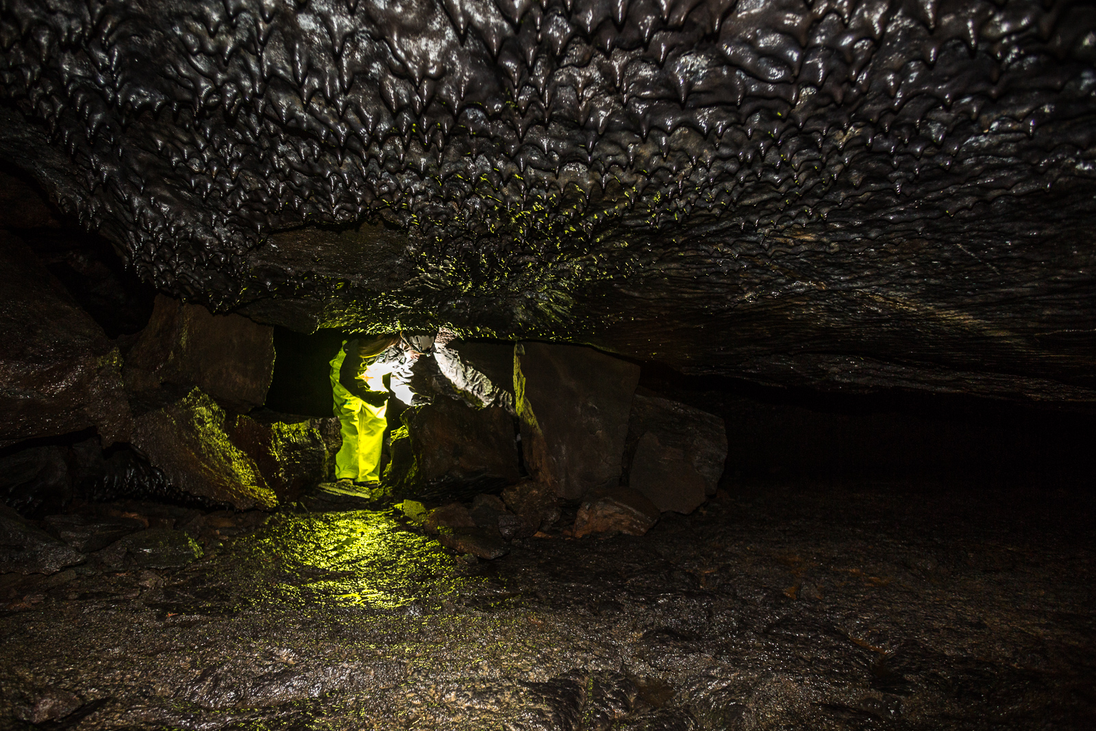 Equipped with helmets, lights and pretty nice neon-yellow fisherman’s pants, the seven of us are exploring Leiðarendi, one of hundreds of lava tubes in Iceland. It is located in the 2,000-year-old lava fields of Stóribolli on the Reykjanes peninsula, a mere thirty minutes outside of Reykjavík. “We can enter this tube only because its ceiling collapsed,” explains Adrien, who came to Iceland from Paris to be a diving guide and recently started caving as well. “Only a few lava tubes are accessible like this one,” he tells us. “Most are hidden and inaccessible underground.”