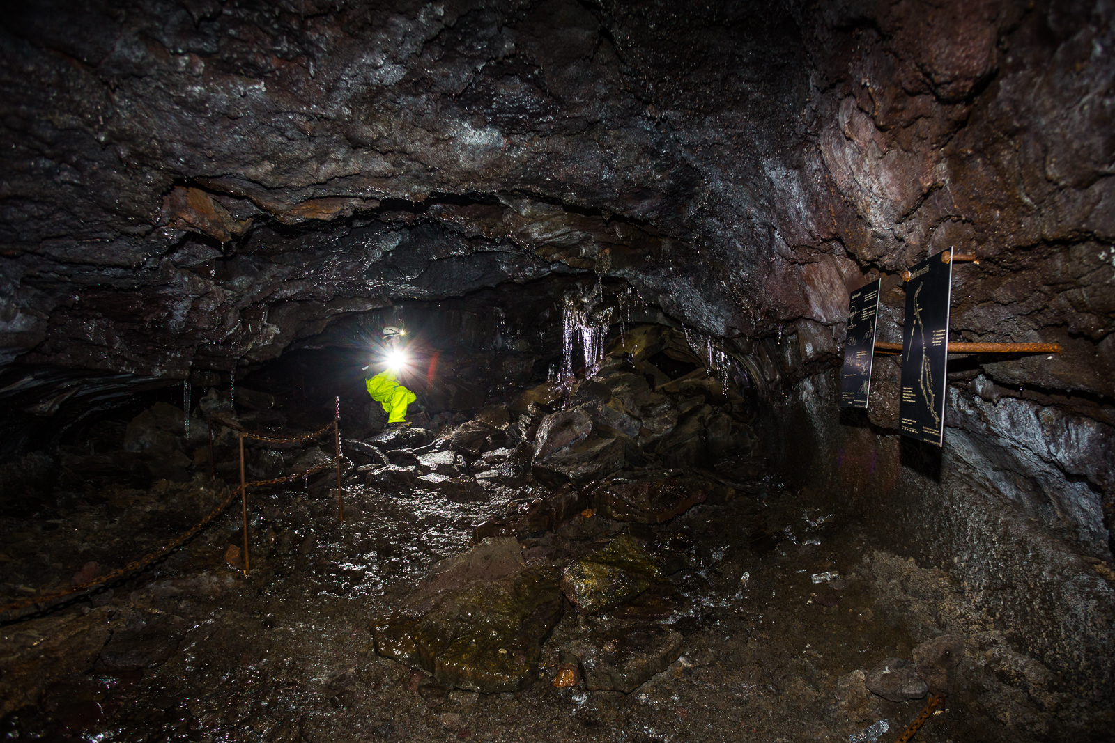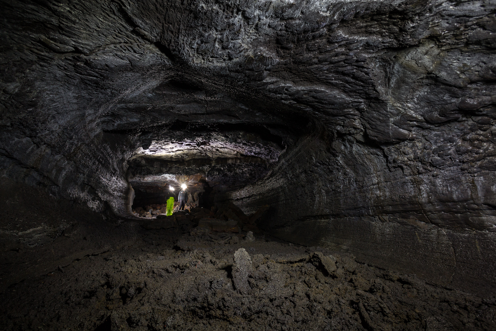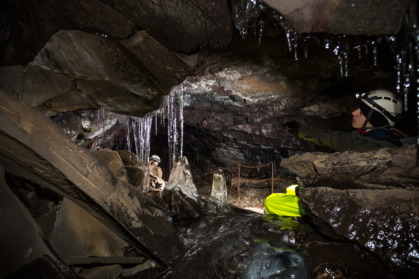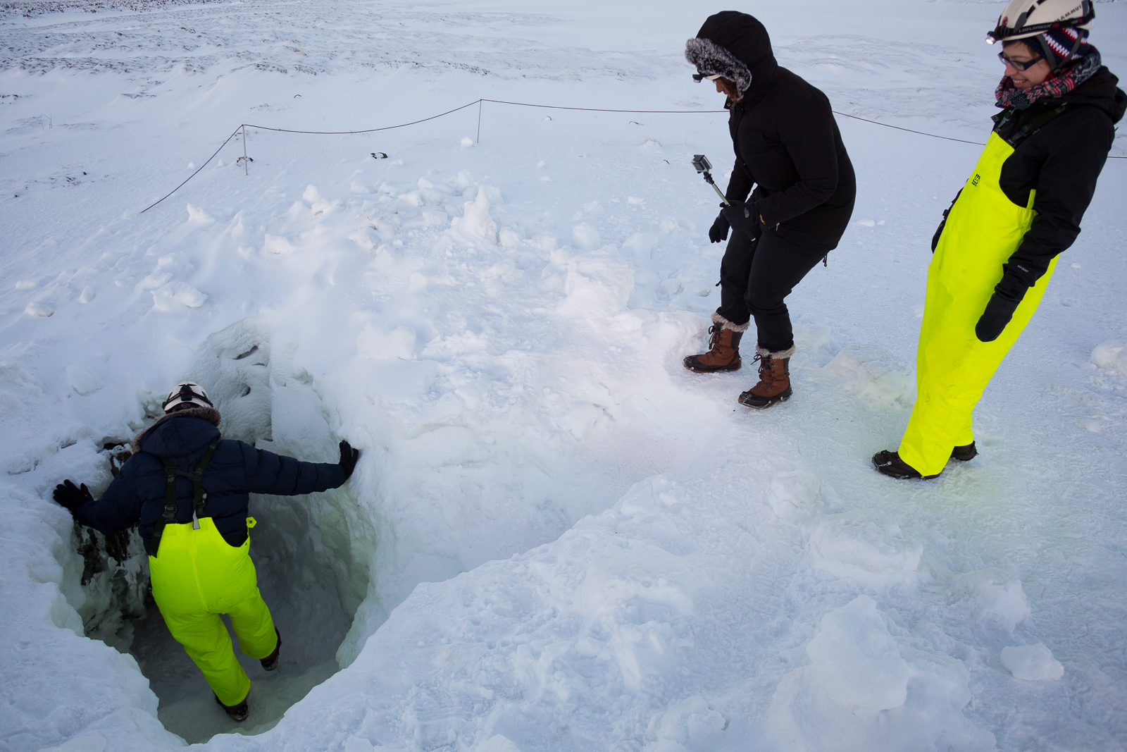 Equipped with helmets, lights and pretty nice neon-yellow fisherman’s pants, the seven of us are exploring Leiðarendi, one of hundreds of lava tubes in Iceland. It is located in the 2,000-year-old lava fields of Stóribolli on the Reykjanes peninsula, a mere thirty minutes outside of Reykjavík. “We can enter this tube only because its ceiling collapsed,” explains Adrien, who came to Iceland from Paris to be a diving guide and recently started caving as well. “Only a few lava tubes are accessible like this one,” he tells us. “Most are hidden and inaccessible underground.”