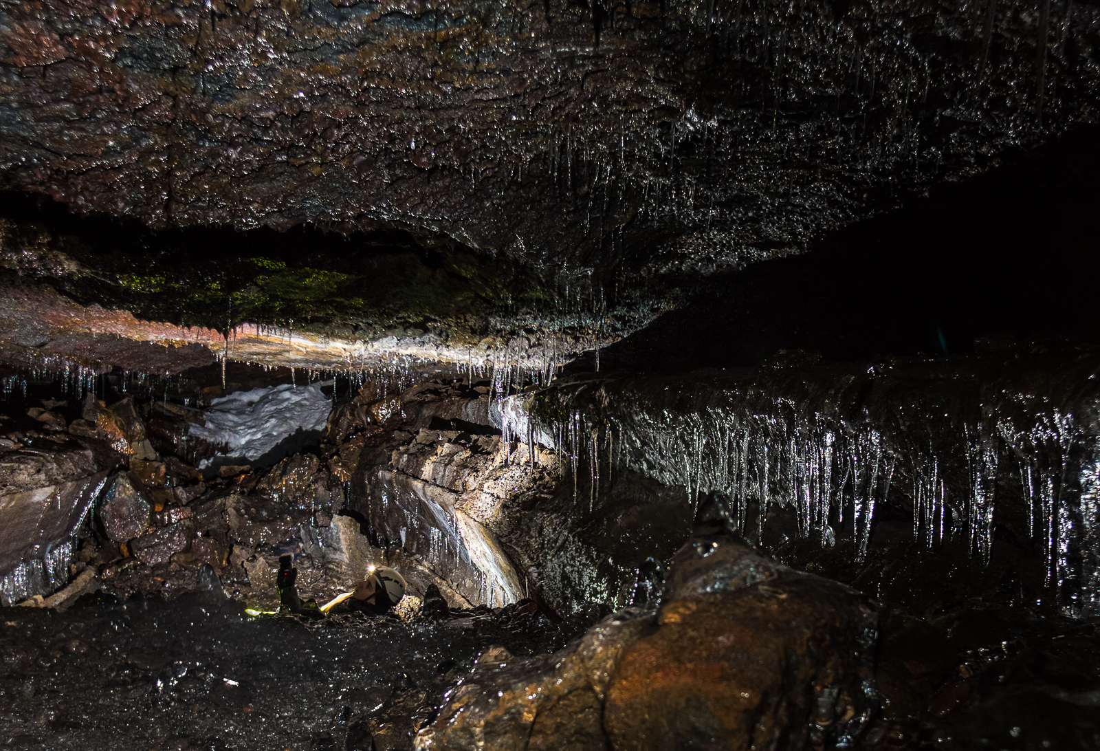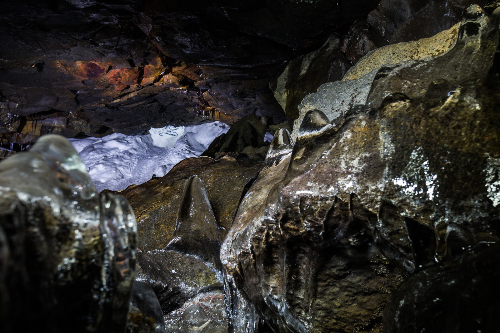 Entering the cave was an adventure in itself: on the seats of our trousers, we had slid into an icy world of lava, stones covered with ice and sparkling icicles in all sizes. Farther back in the cave it became warmer, fewer and fewer icicles hung from the ceiling, the cave walls sparkled in colours between red grey and blue and we passed strange lava formations. One was supposed to look like Abraham Lincoln, but not even Adrien could point him out. Most of the lava formations did look like petrified trolls, though, their faces and extremities protruding from the surface. But of course fantasy is always near in the darkness below the ground.