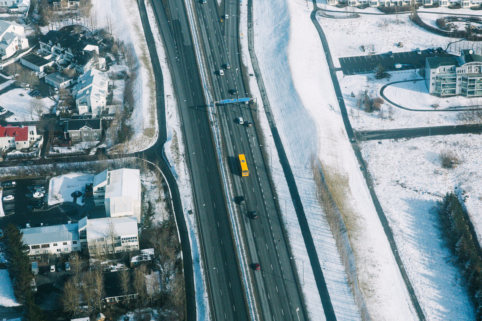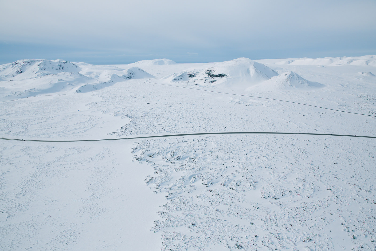 Soon after, we’ve left the city limits behind entirely, and we’re out over the open lava plains of South Iceland. Away from human habitations, the landscape changes dramatically—the temperature at ground level seems to have taken a nosedive, with wide drifts of frozen snow punctuating grey lava and yellowish moss. Before long, the distant ground is completely white, held under a smooth icing of deep winter snow.