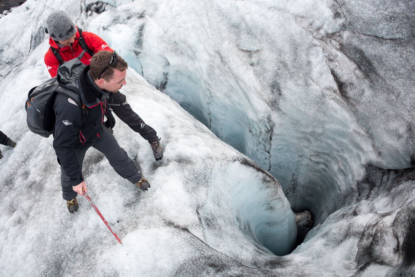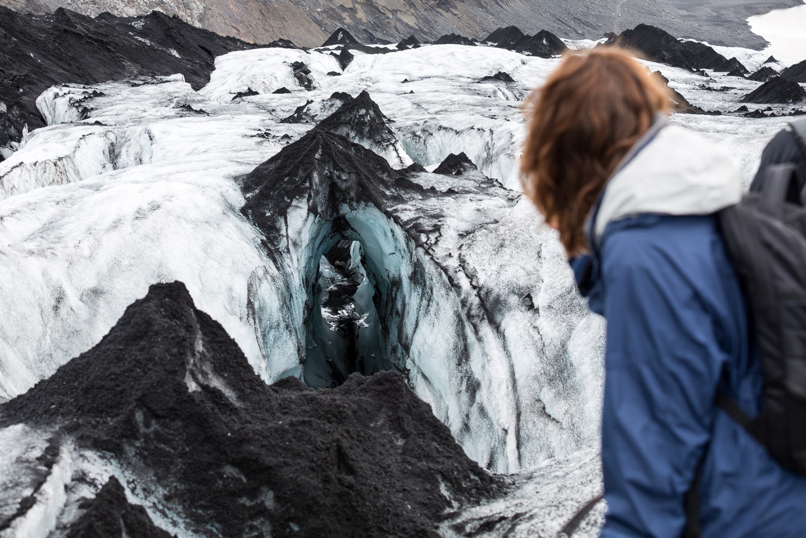 Arriving at the 200 metre tall Sólheimajökull was a bit of a shock. From a distance, it appears icy, brilliantly white, but as we approached it, it took shape as a dizzying landscape of dark, ashen crags. Less North of the Wall and more Detroit in February—that mix of hardened slush and oil that forms one impenetrable monster that lingers until mid-March. We peered down into a gaping crevasse of the glacier and saw a group of people trekking along, appearing impossibly small and vulnerable against the harsh terrain.