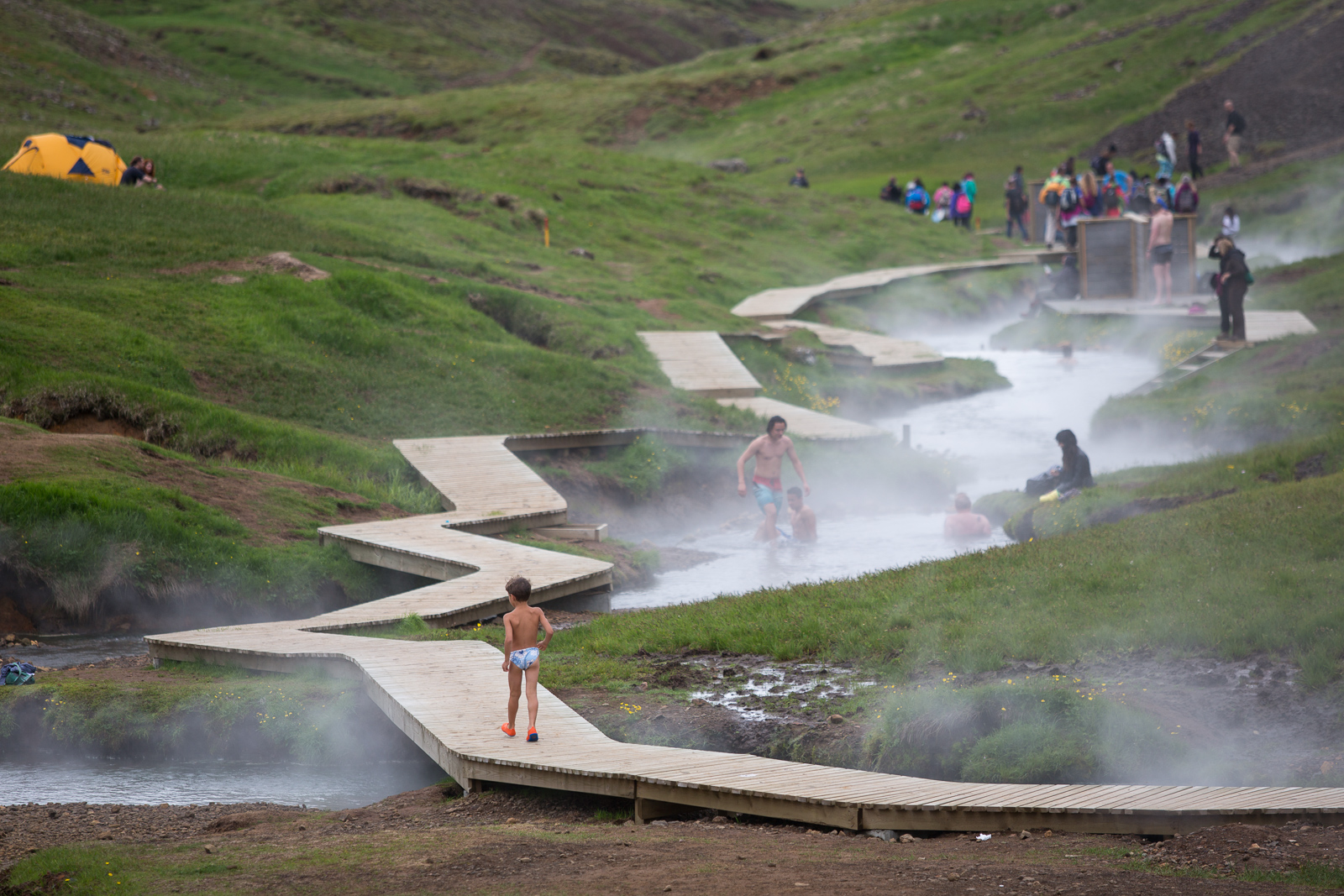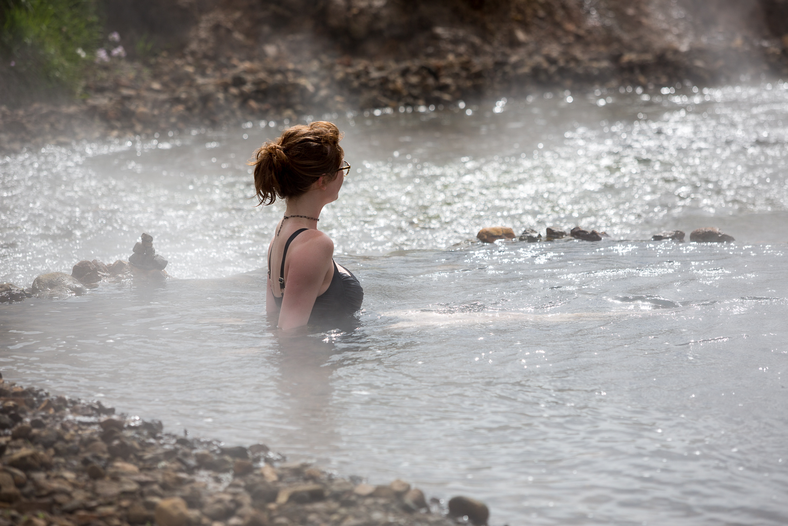 Testing out the water, I learned that Reykjadalur is kind of special because it is a meeting place for two rivers— one hot and one cold—which join to form pools with perfect temperatures for lounging. I got a kick out of watching other people go through the same discovery process, hearing them yell in different languages upon realizing the river to the left wasn’t a hot spring after all. “¡Fría!” “Zima!” I found a geothermal sweet spot, neither too hot nor cold, rested my head on a rock, and more or less passed out, while Linda, long overheated, enjoyed a cig in the grass.
