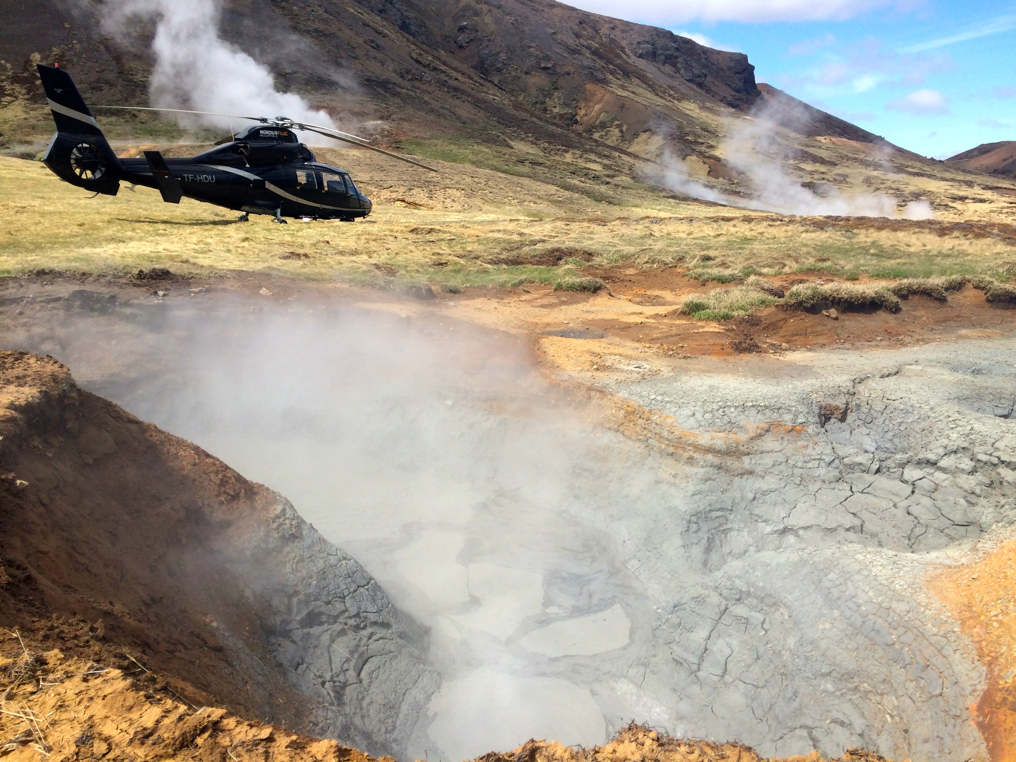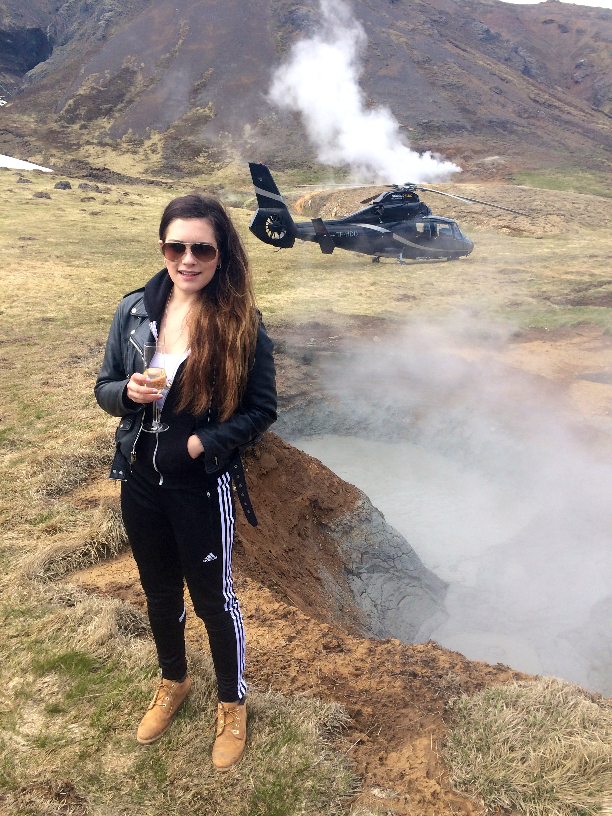 It’s time for our first stop, 30km from the city. On the side of a hill, near some geothermal waters, the helicopter touches down gracefully. It’s a picture-perfect Icelandic location, with views of hot pools, waterfalls and mountains all around us. Snorri shows us where it’s safe to feel the running water, and damn, it’s piping hot. As the wind blows down from higher ground, I think, “I could use a hot tub right now… I bet the Vikings felt the same way.” My pilot, I suppose, is psychic, and feels my desire for luxury and relaxation. He pulls out a bottle of champagne. Oh well—it’s 5 o’clock somewhere!