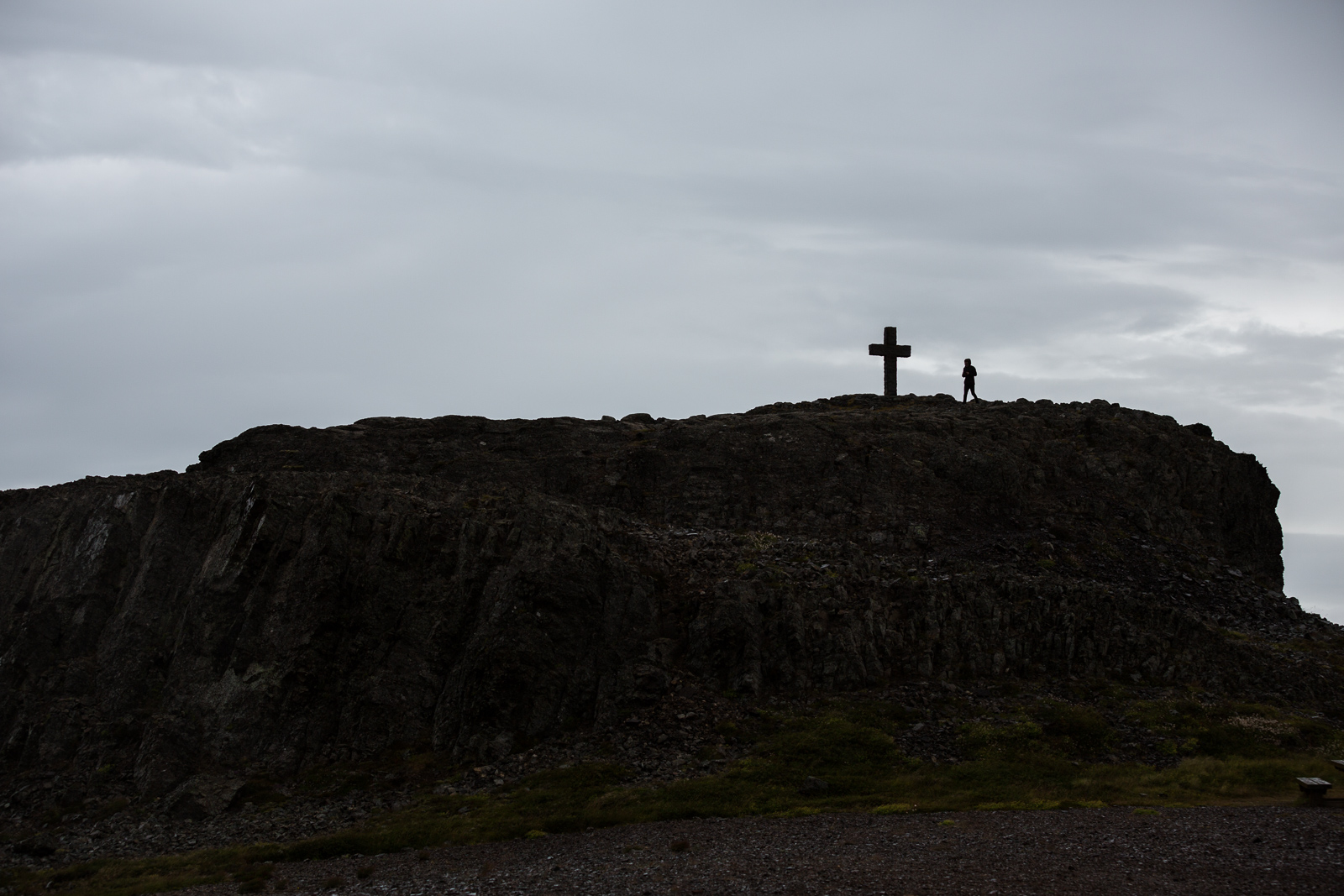 Climb up some rocky rocks. Wow, look at that. A real-life cross. Oh, and the views. I can see Búðardalur from here!