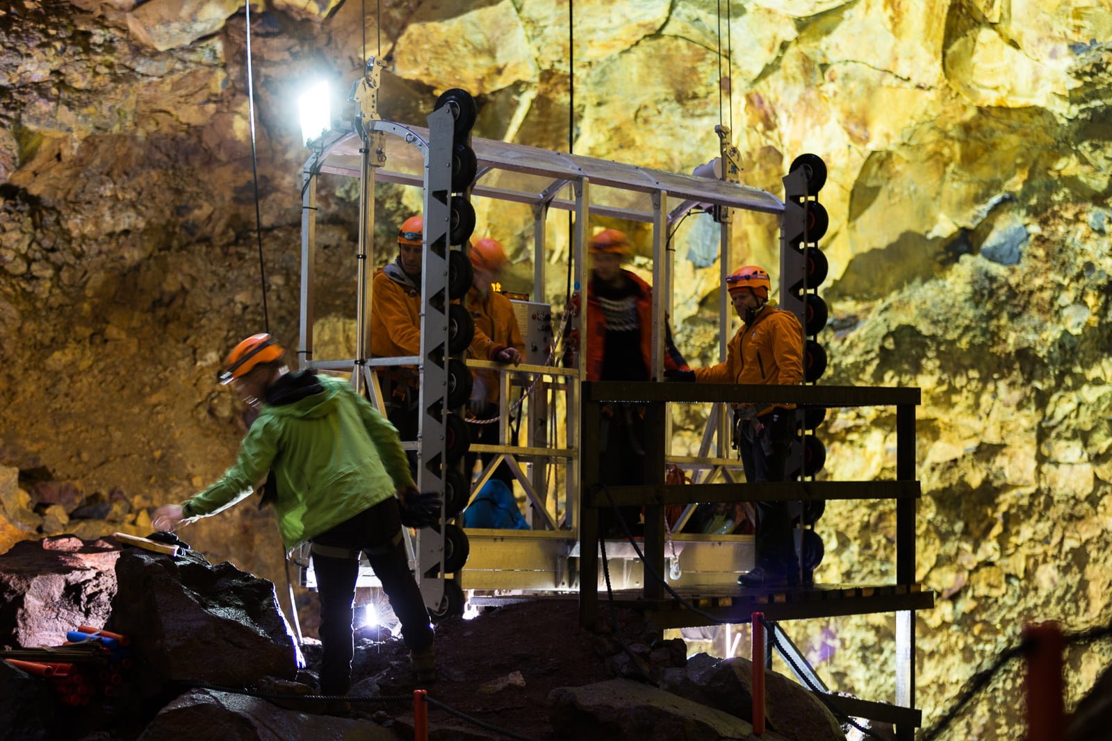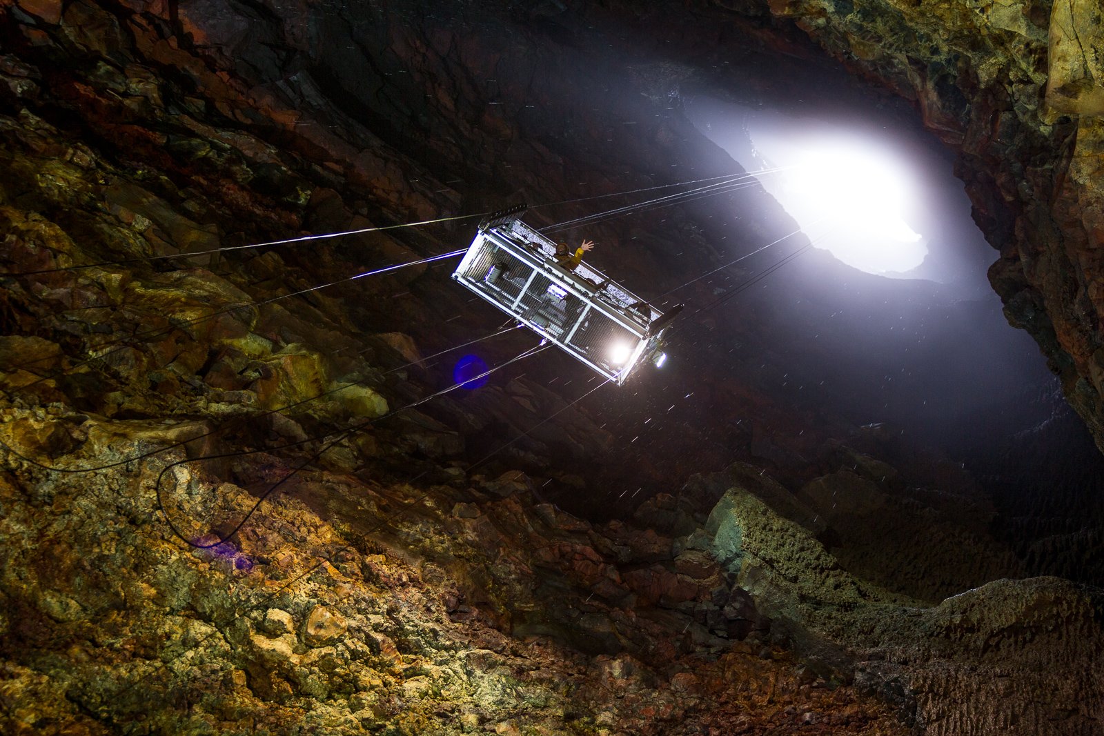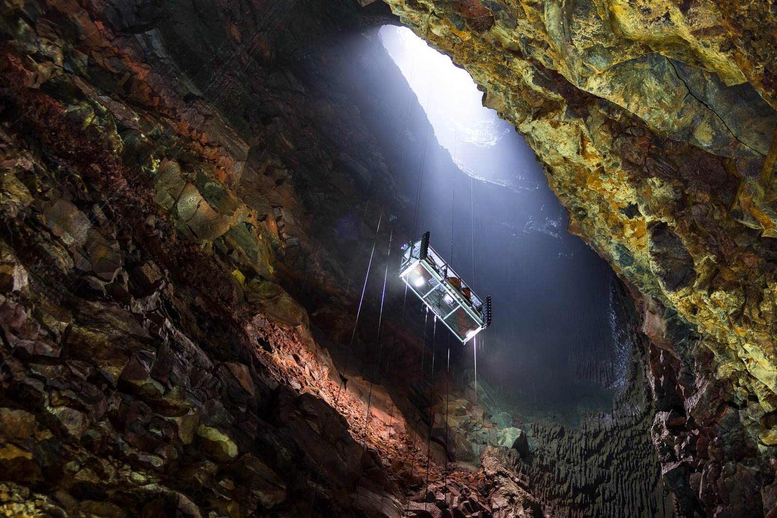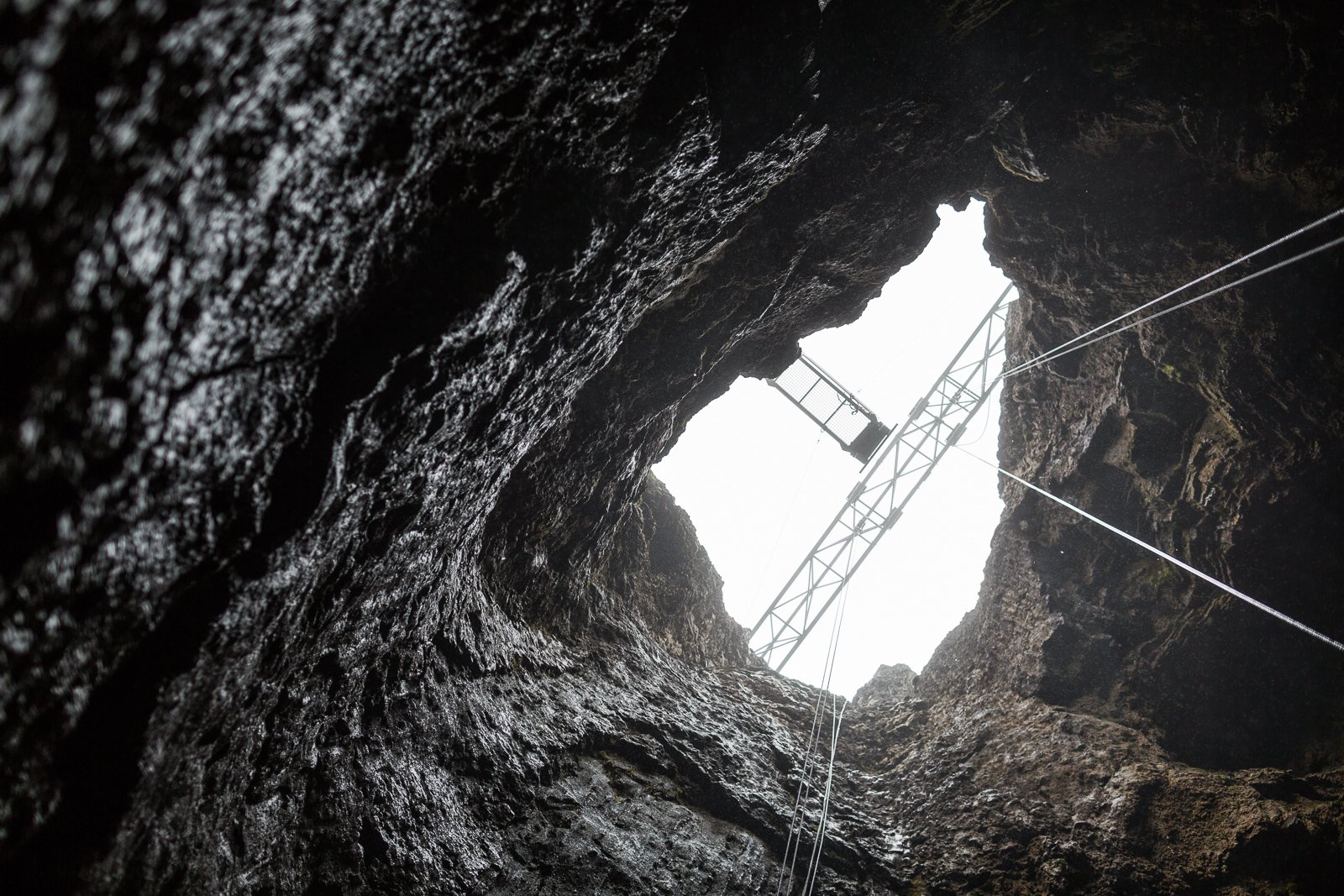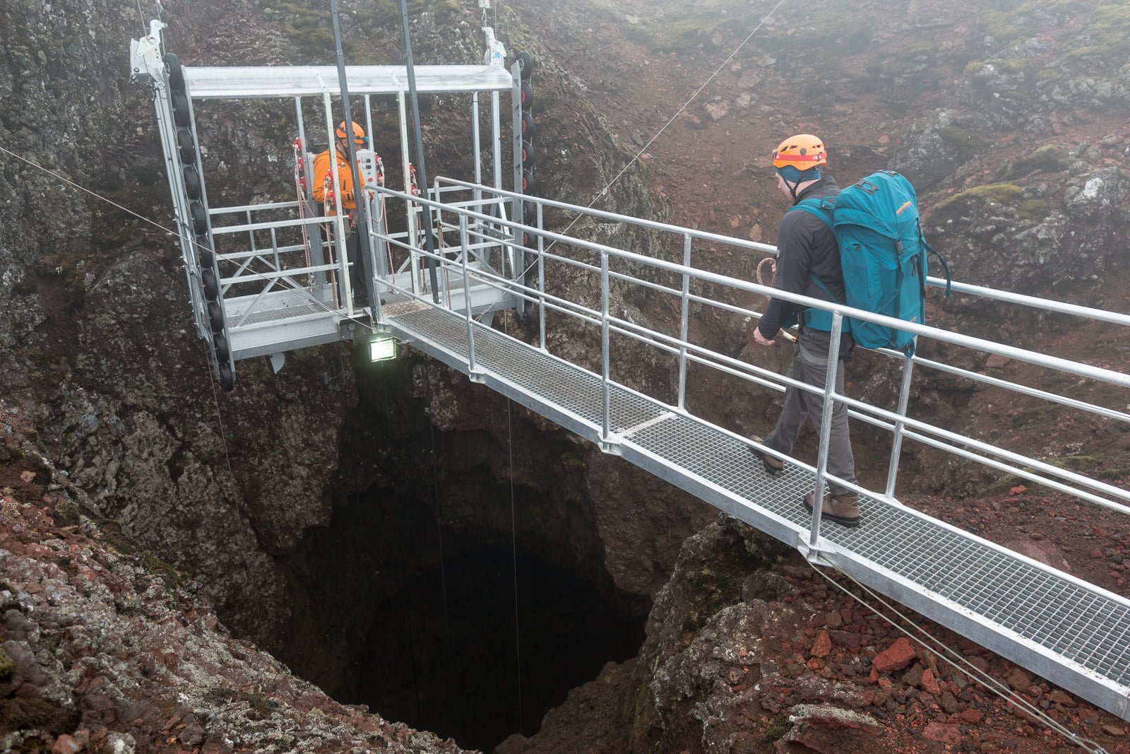 After warming up with some hot soup and coffee, we ditch the raincoats, strap on helmets and harnesses, and head up a short path to the elevator. This small cage, studded with spotlights, hangs by several thick cables from a gantry positioned directly over the inky black maw of Þríhnúkargígur. The wind has picked up, and a fine rain comes down as we clip onto a zipline and cross the slick, swaying walkway, peering eagerly through the mesh floor for a first glimpse of what lies beneath.