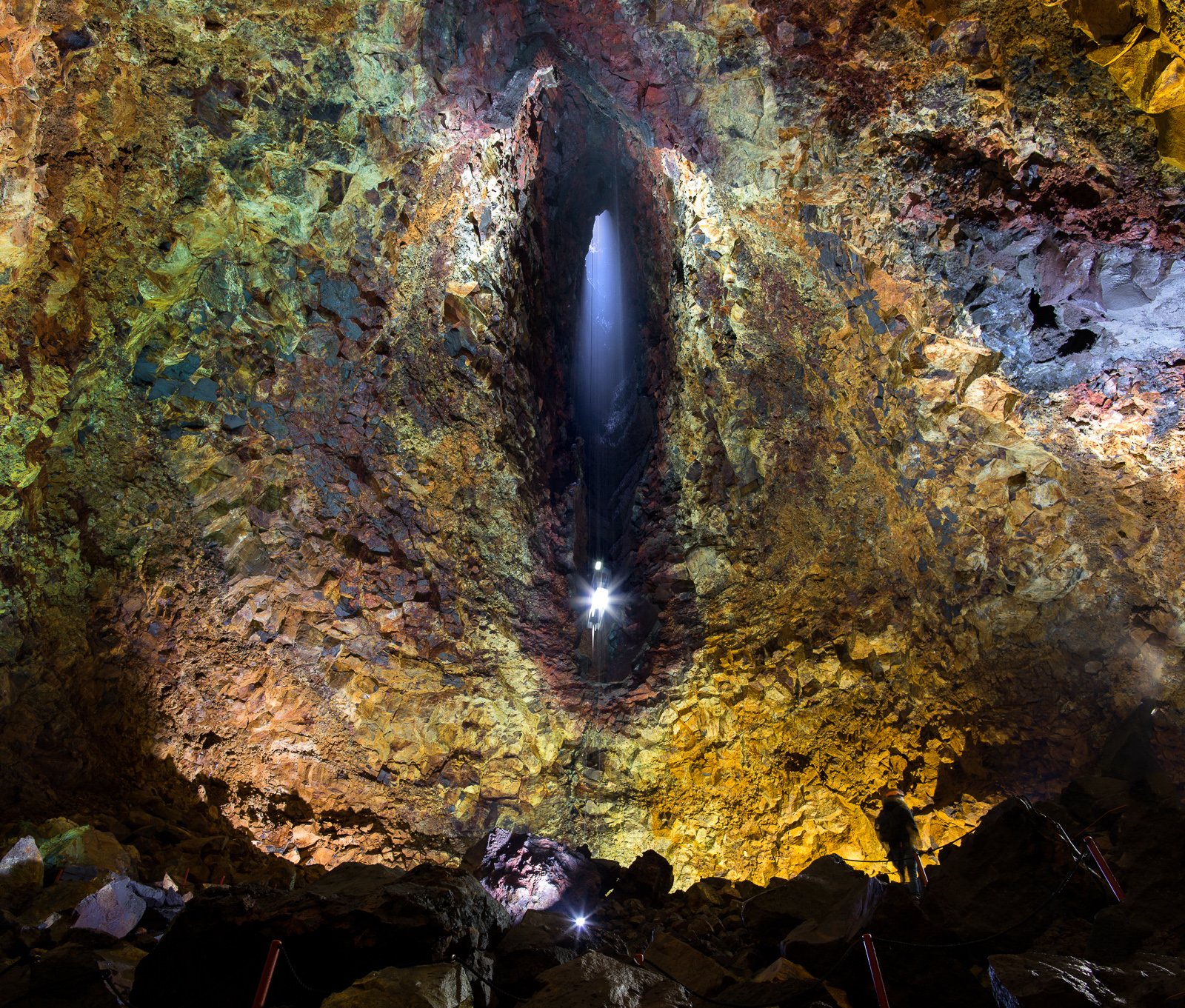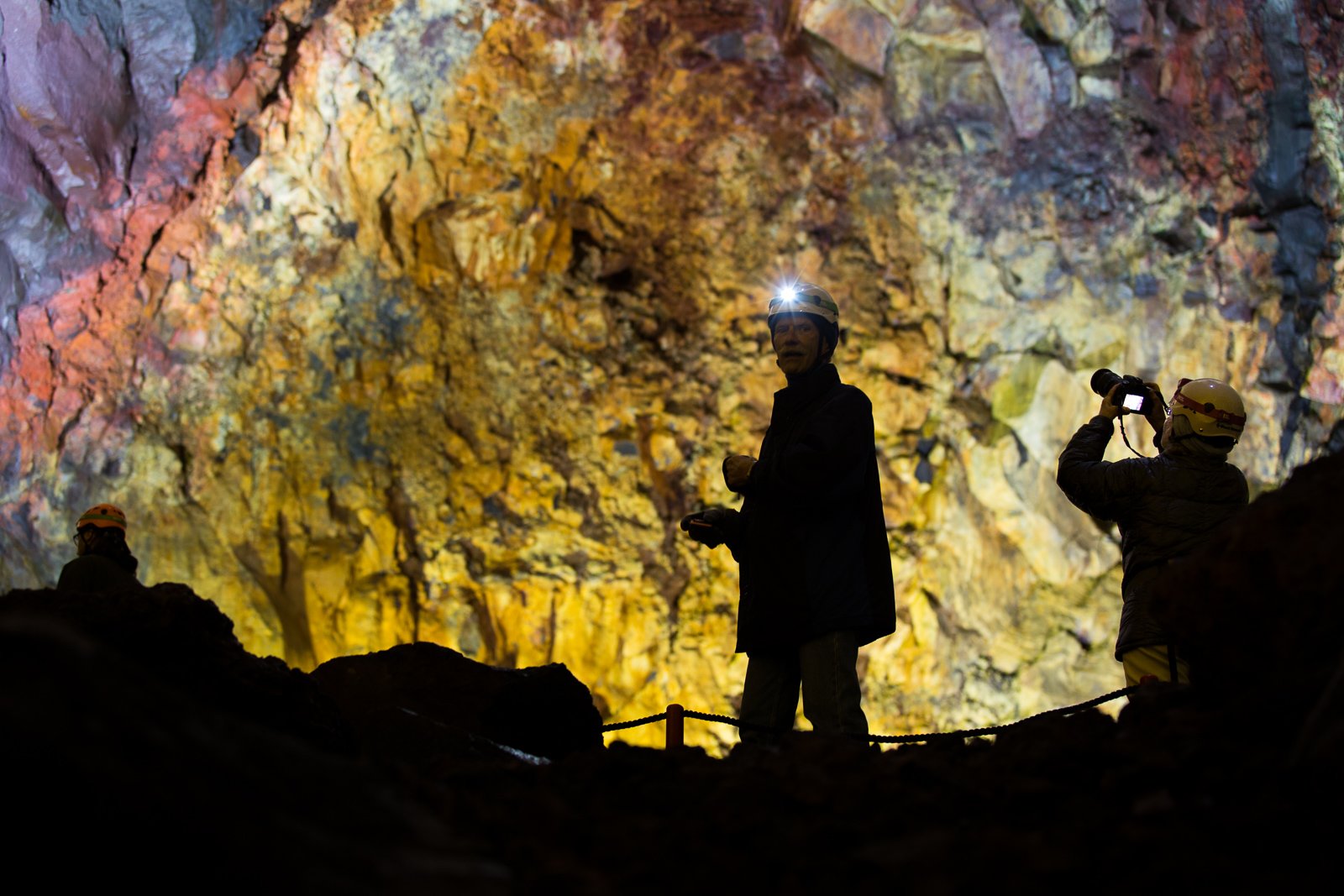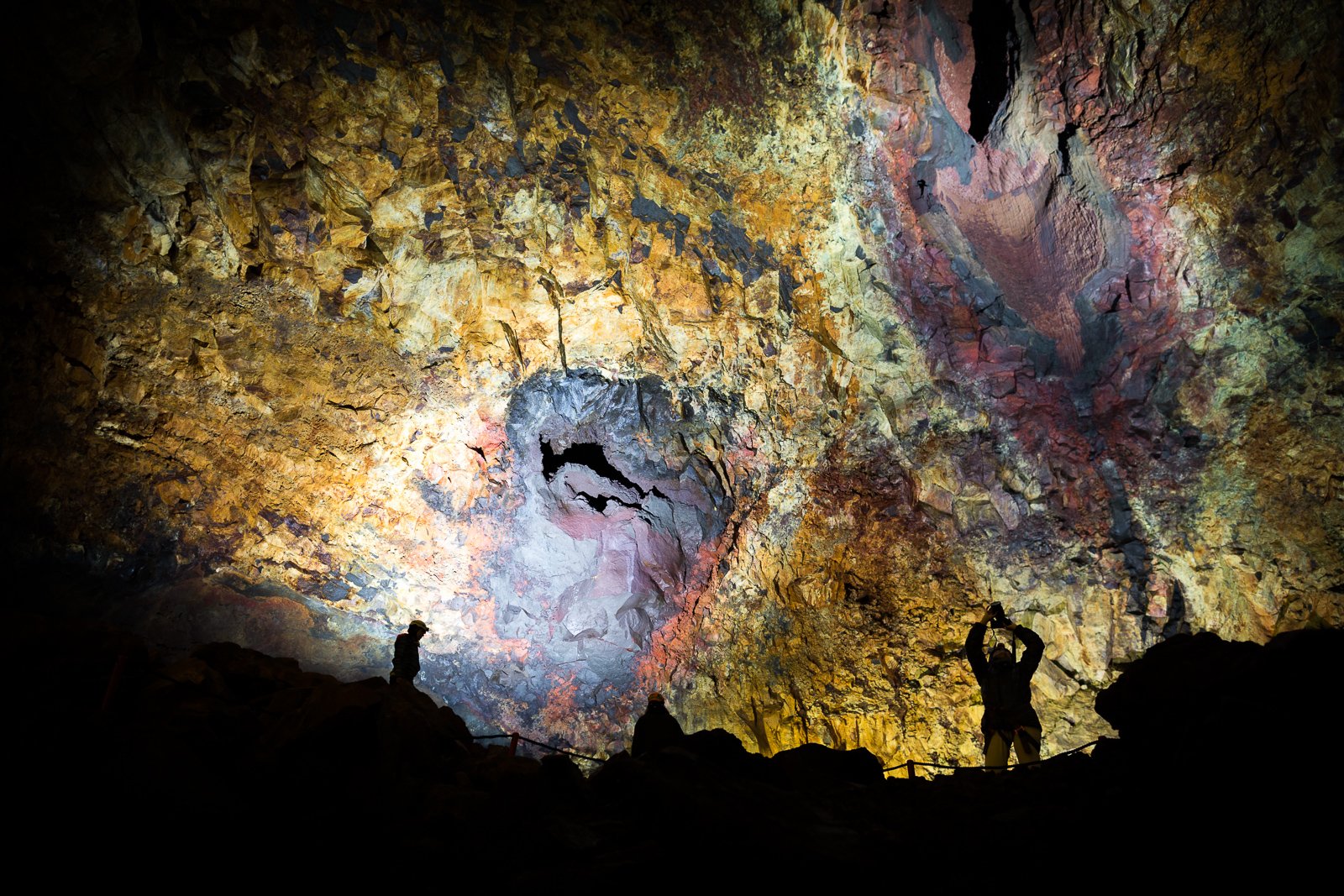 The space broadens out, and we find ourselves, quite suddenly, hanging high in the cavernous magma chamber. The spotlit walls are a rough, natural cathedral in Rothko colours: meaty maroon, arterial red, viscous purple. It feels like we’re coming down the throat of the volcano, and as the 120-metre descent ends, we set foot in its belly.