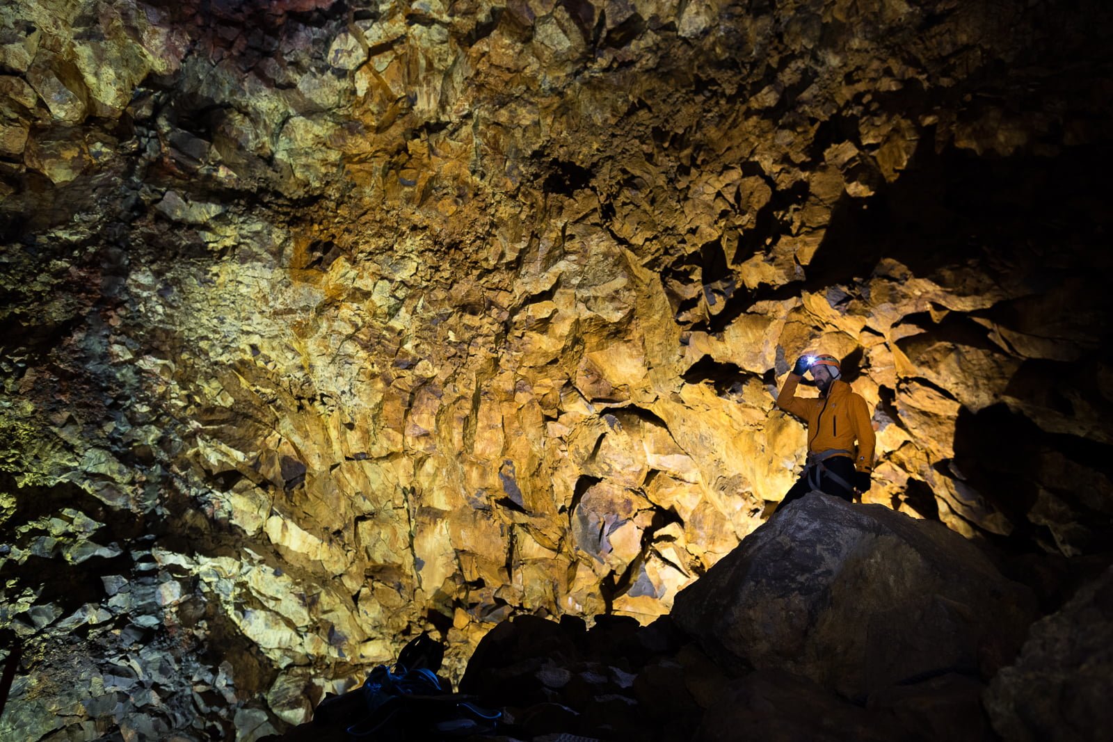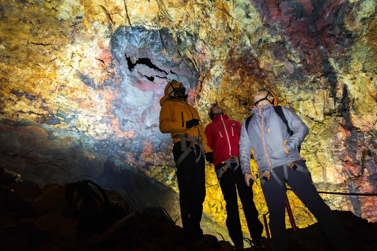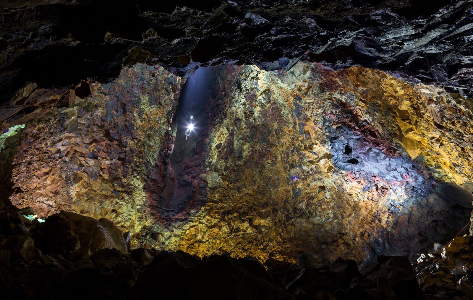 The space broadens out, and we find ourselves, quite suddenly, hanging high in the cavernous magma chamber. The spotlit walls are a rough, natural cathedral in Rothko colours: meaty maroon, arterial red, viscous purple. It feels like we’re coming down the throat of the volcano, and as the 120-metre descent ends, we set foot in its belly.