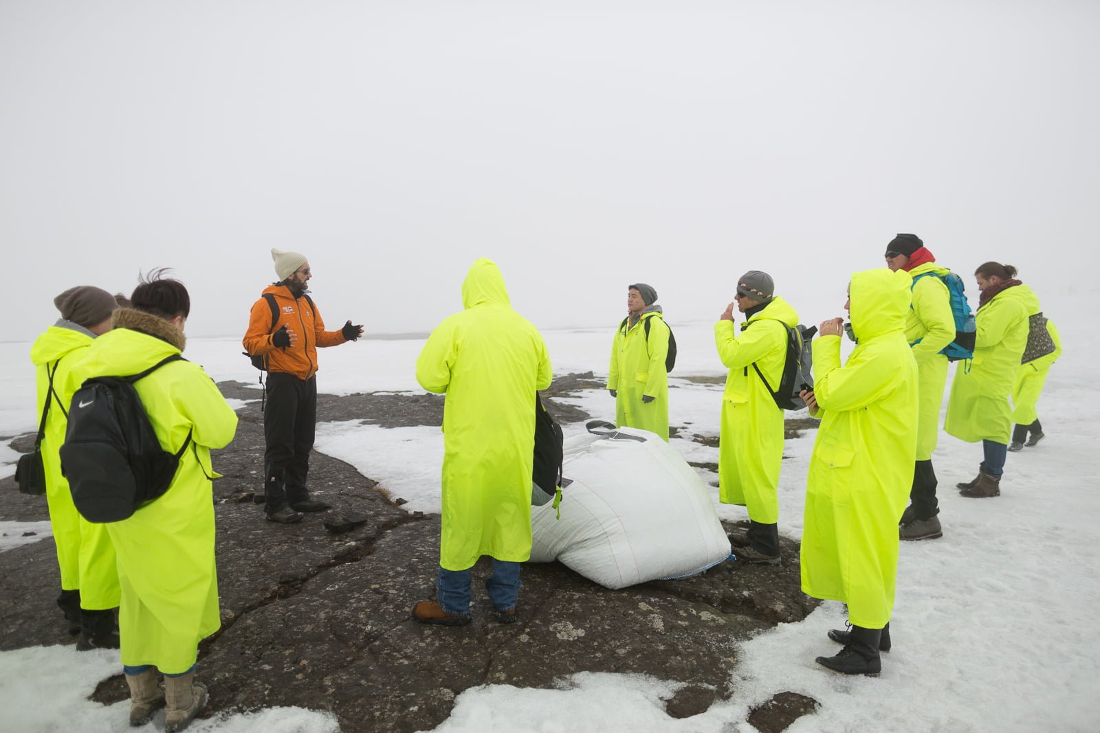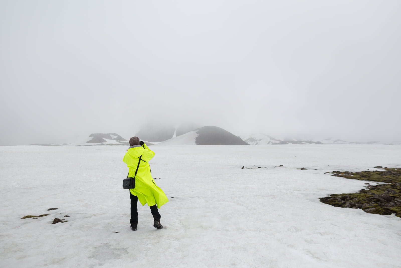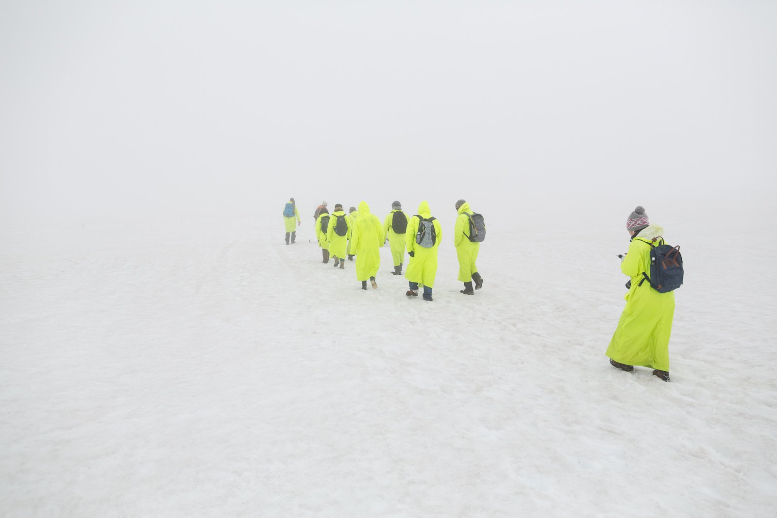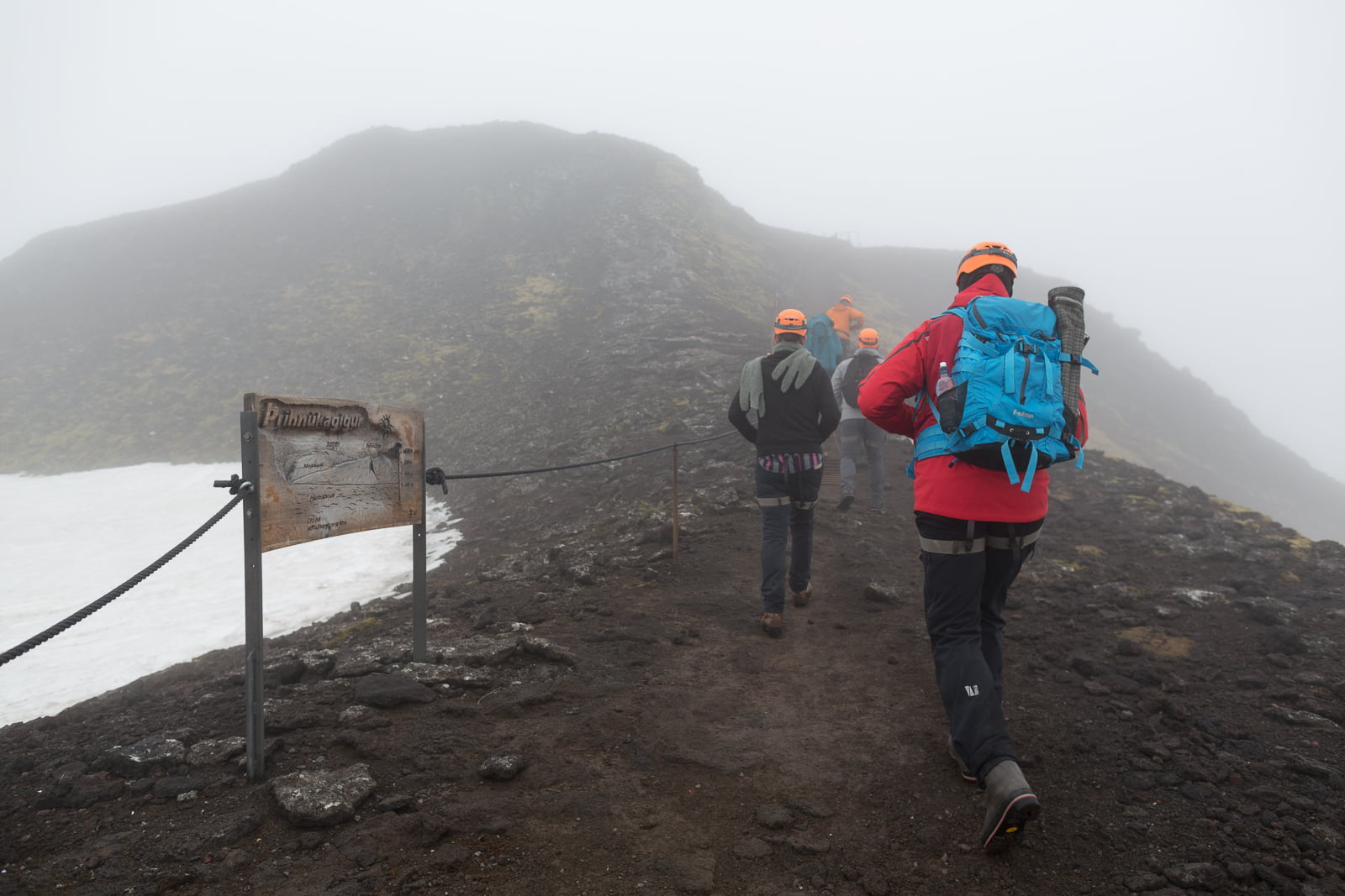 It’s easy to forget, basking in the tropical sun of a 9˚C summer morning in Reykjavík, that just outside the city, summer is yet to arrive. But sure enough, one Saturday in May, after pulling on some hiking boots and taking the twenty-minute drive to the skiing area of Bjáfjöll, I find myself trudging across a tract of deep, slushy snow. Bulging white sacks have been dropped at intervals to trace the buried path over this eerie wasteland, which is enveloped by a soaking, drizzly, impenetrable fog. Looking back, I see a couple of our group, dressed in ankle-length high visibility jackets, staggering along gamely. Ahead is the red jacket of our guide, Gummi, who strides forth with trademark Icelandic stoicism.