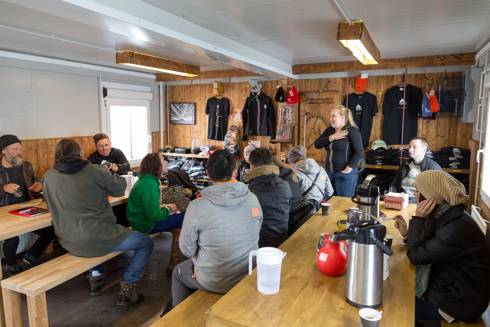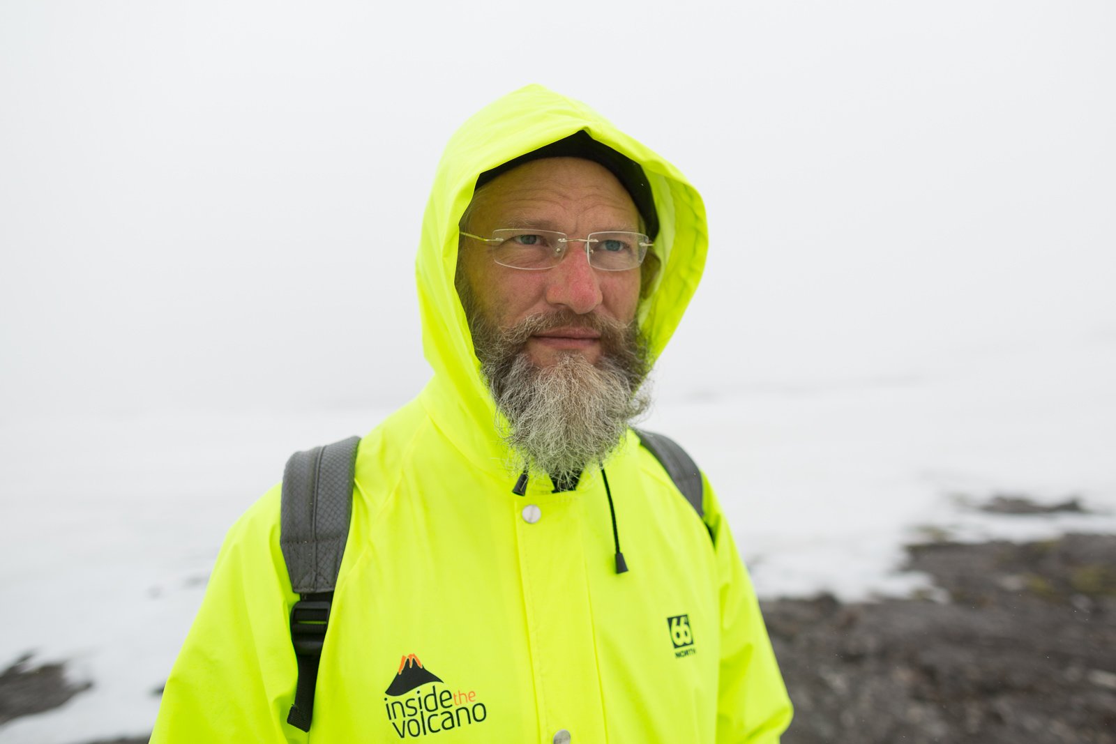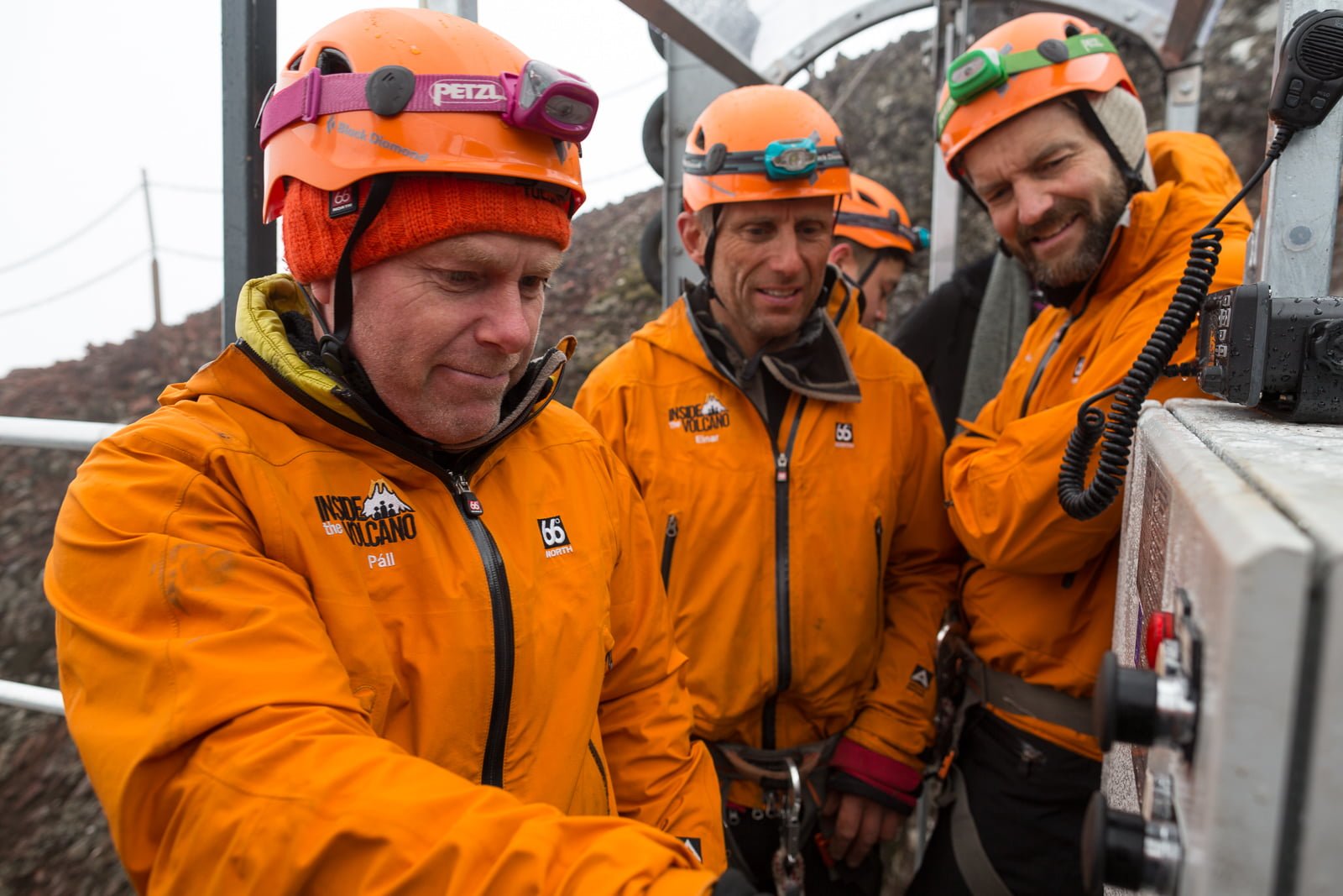 I grit my teeth and power on. Because today is one of the first days of 2016 that the famous Þríhnúkargígur (“Three Peak Crater”) volcano is open to visitors. During the high season, we’re told, this one hour trek to the volcano’s mouth is quite beautiful, with rugged mountains and craters surrounding the high mossy plains. But today, it’s a relief when the base camp, made up of a few container units, appears through the baleful murk.