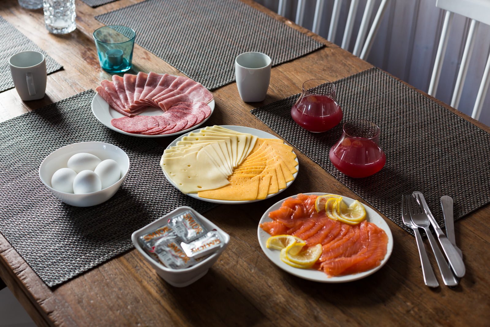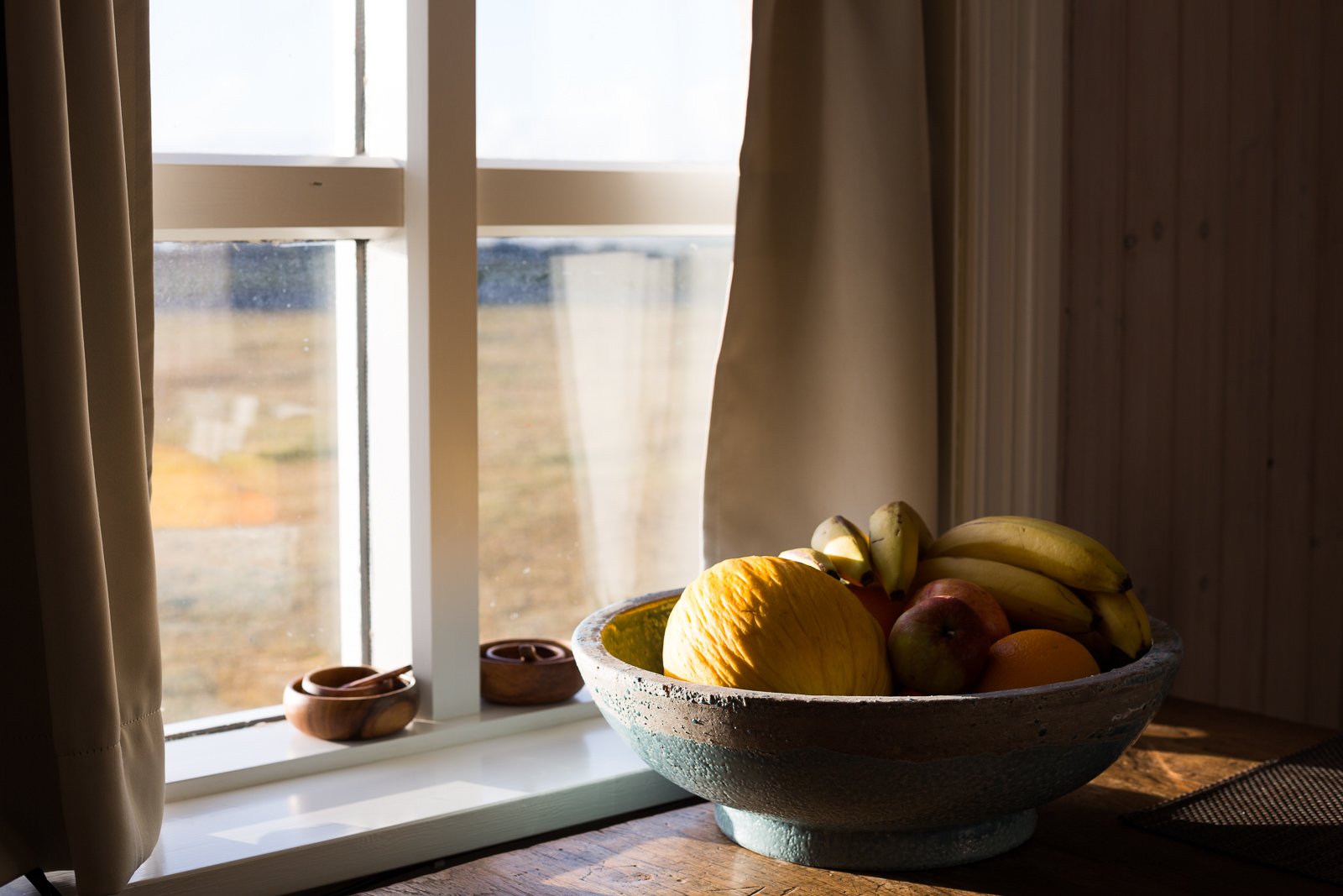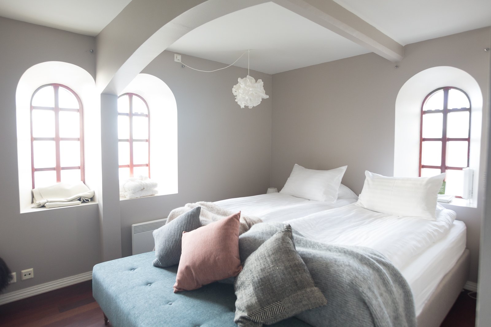 As the sun sets, pink light floods through the bedrooms. We settle into our rooms, all of which have nice design touches, whether hanging white lamp shades, coat hooks that resemble old doorknobs, or piles of comfortable blankets made from Icelandic wool. Each room also comes with a couple of pairs of earplugs, which I assume are for nights when the weather outside is particularly loud.