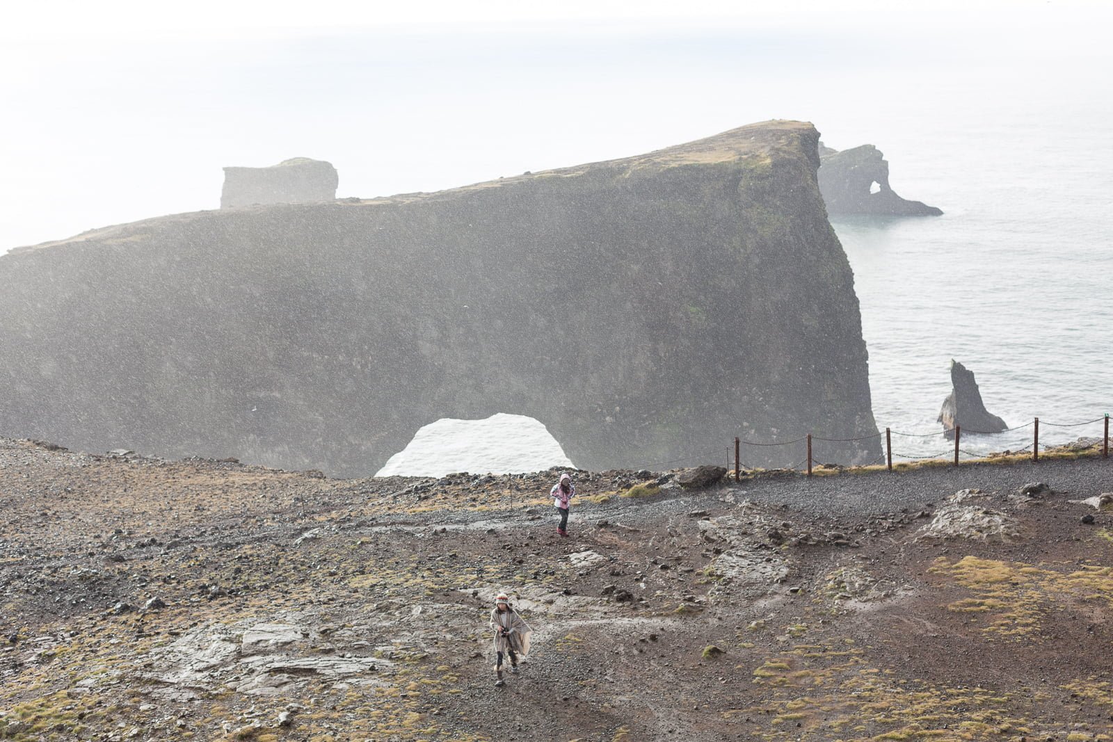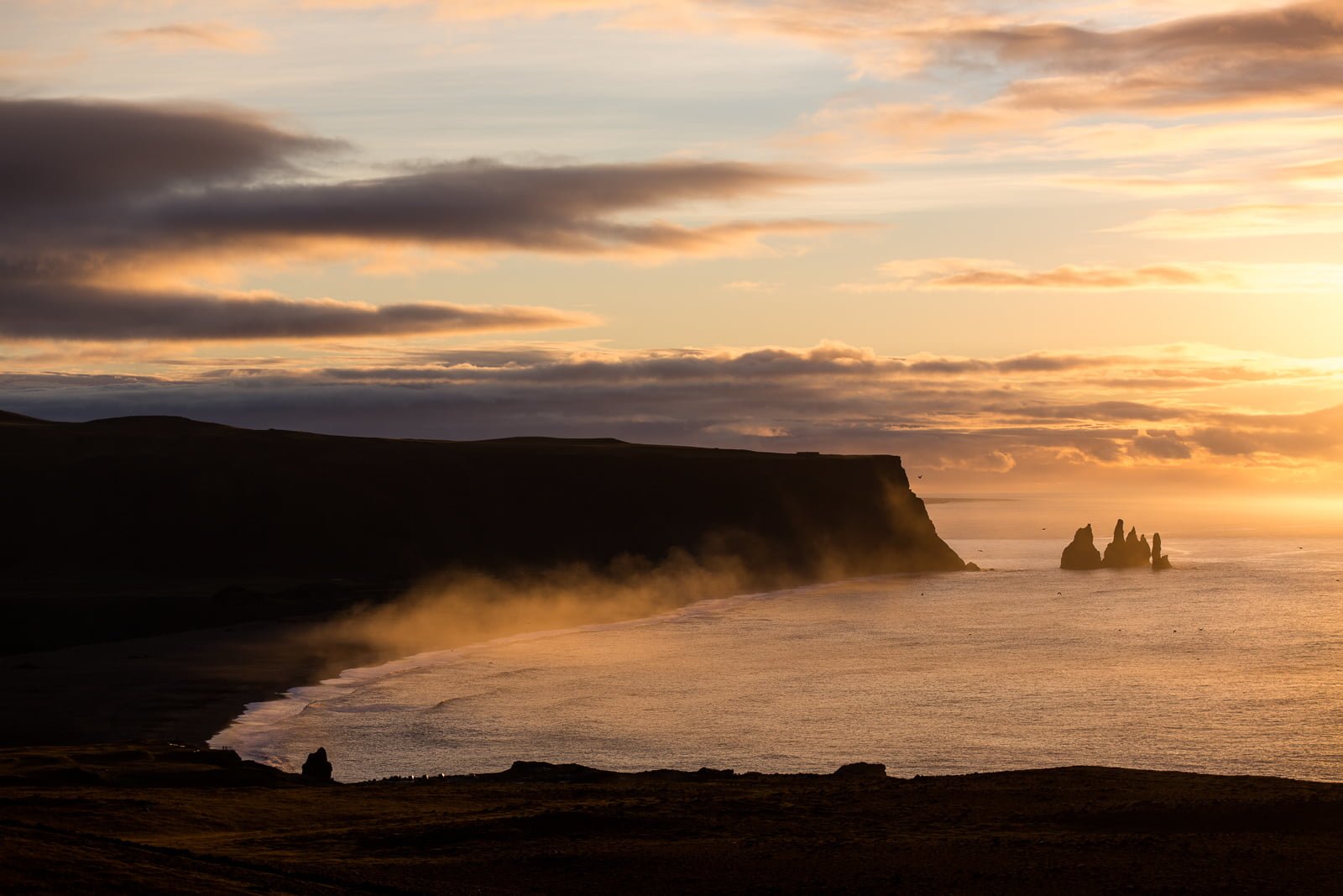 At the southernmost point of mainland Iceland sits a particularly dramatic and tide-lashed stretch of coastline. Around the town of Vík, the waves crash in with particularly ferocious force, rending the cliffside apart in imperceptibly slow motion and leaving behind angular basalt formations and precarious sea stacks. The black sands of the surrounding beaches are a flat expanse punctuated by craggy land islands that appear and vanish through fast-moving bands of rain and dust.
