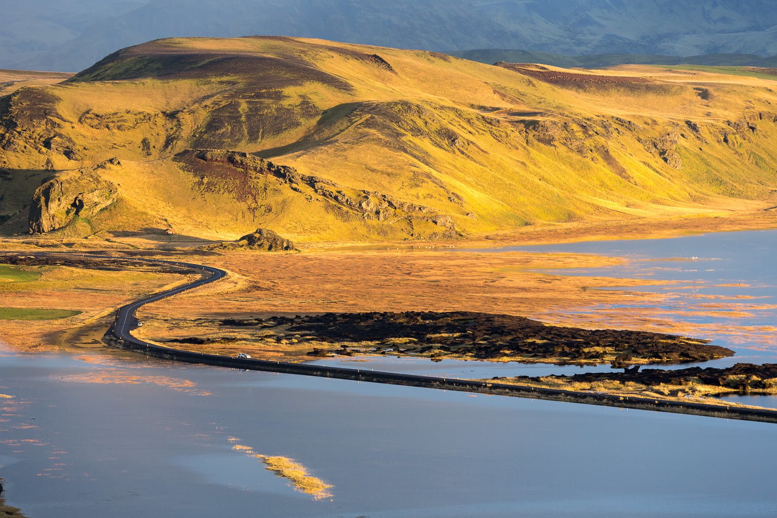 Nestled between Vík and Sólheimasandur is Dyrhólaey, a high headland that juts out defiantly into the ocean, offering a view over the scene. The road winds a delicate path between pockmarked hills before crossing a land bridge over a shallow lagoon to an area where the elements have battered the cliffs since Iceland was born, creating a series of impressive natural archways and rock formations. Down through a gap in the cliffside lies Kirkjufjara, a long beach where the violent tide lifts hundreds of black pebbles and noisily clatters them down again in a cloud of salty sea spray. Something about the ferocity of the elements imbues this part of Iceland with a sense of perpetual motion, and lingering drama.
