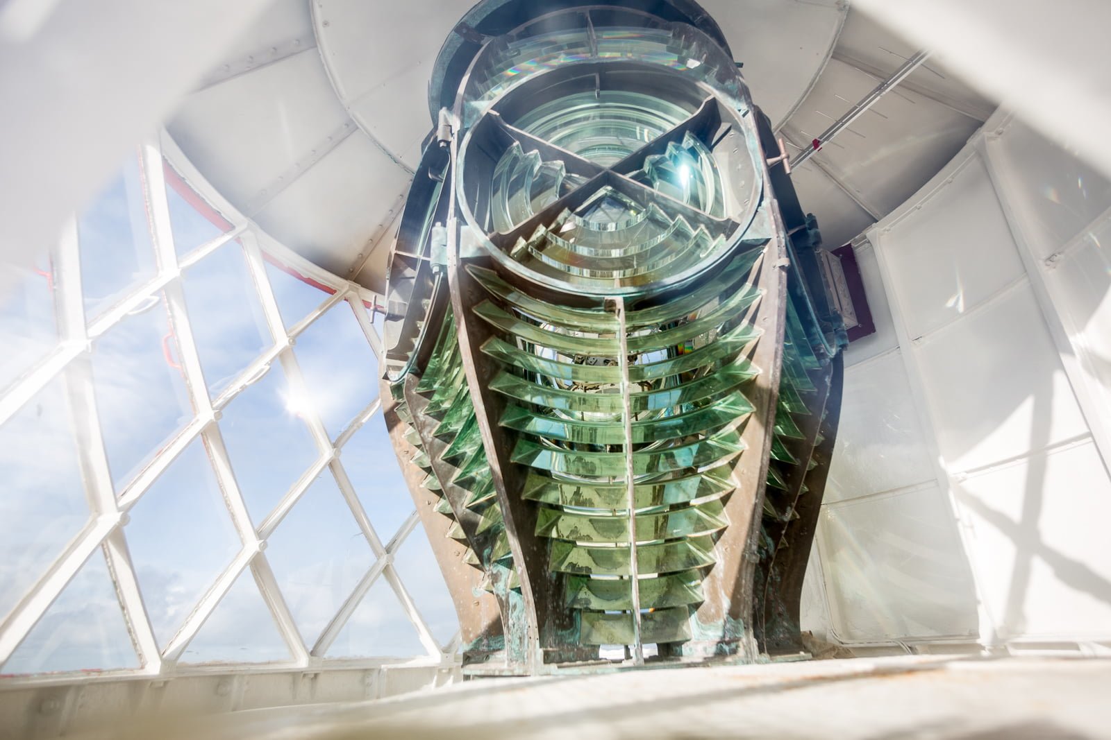 What lies inside might surprise them. Because rather than the lodgings of a lighthouse keeper or a workspace full of oil cans and machine parts, the lighthouse has been converted over the last year or so into a luxury hotel residence. As we unlock the door, we’re greeted by an immaculate grey wood-lined hallway, a modern kitchen, and dining and sitting rooms set up for five people. The narrow, winding stair leads up to three bright, minimally decorated bedrooms—a double, a twin and a cosy single—spread across two more floors.