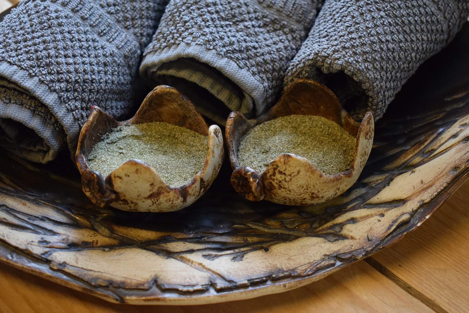 We sink into the pleasantly hot water, enveloped in the steam. The seaweed powder gives the water a silken feel, a distinctive ocean aroma, and a deep green colour. A pot of seaweed mud stands on the side of the tub—we rub it into our skin, which seems to rapidly drink in the natural nutrients.