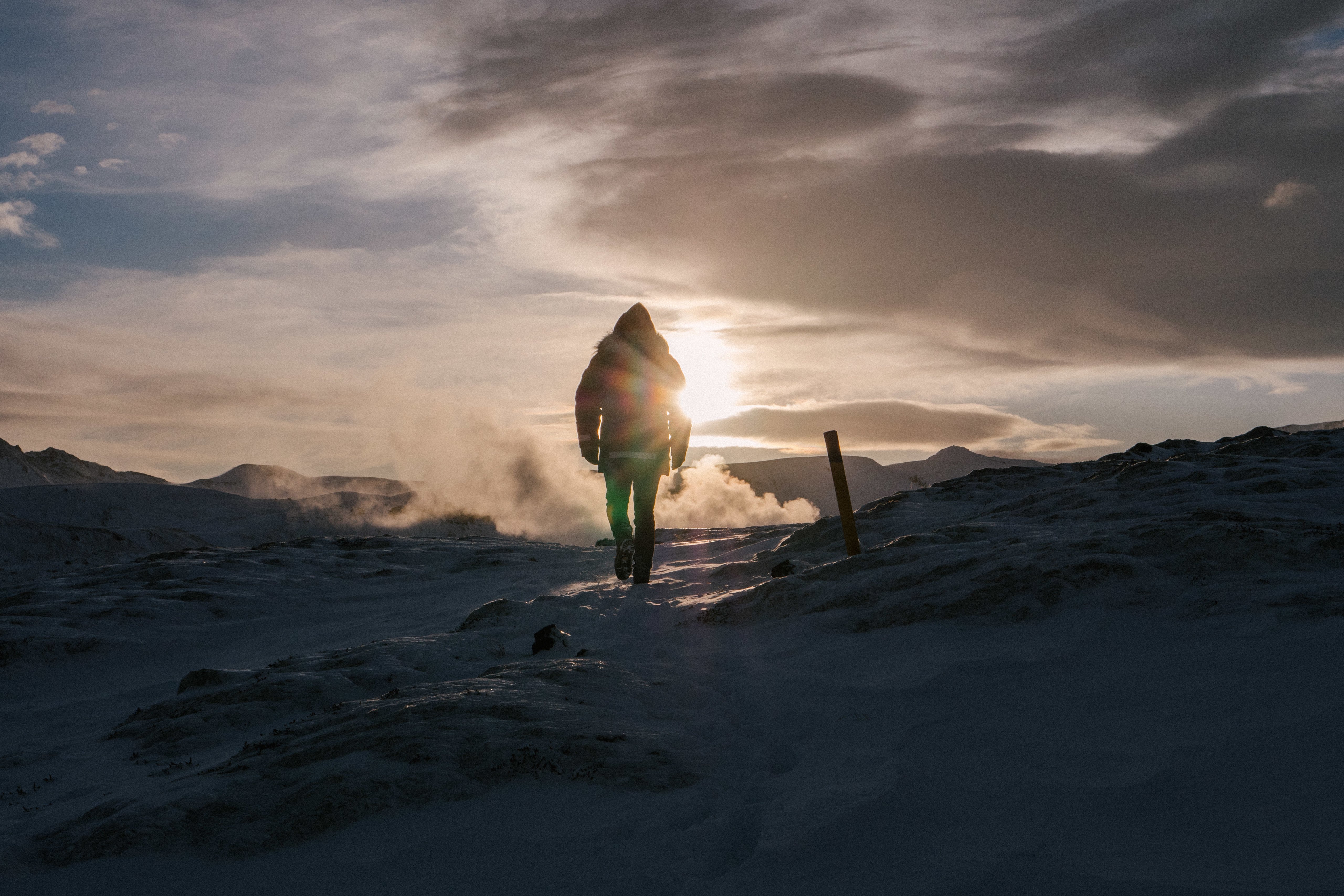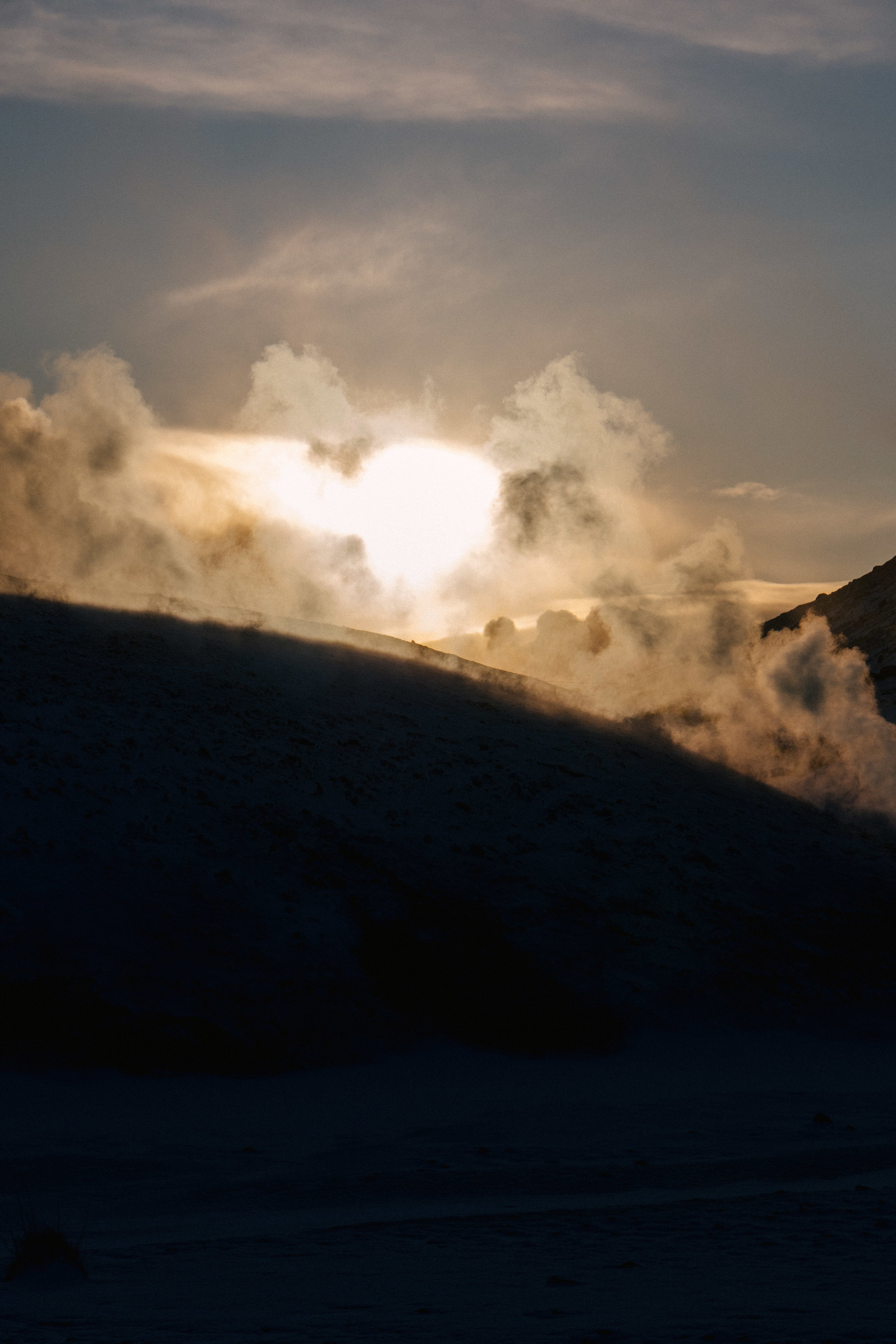 We scramble up as far as a rocky outcrop that looks out towards Nesjavallavirkjun. The power station runs all-but silently, emitting billowing columns of geothermal steam that catch the orange evening sunbeams, casting dancing shadows over the white plains below.