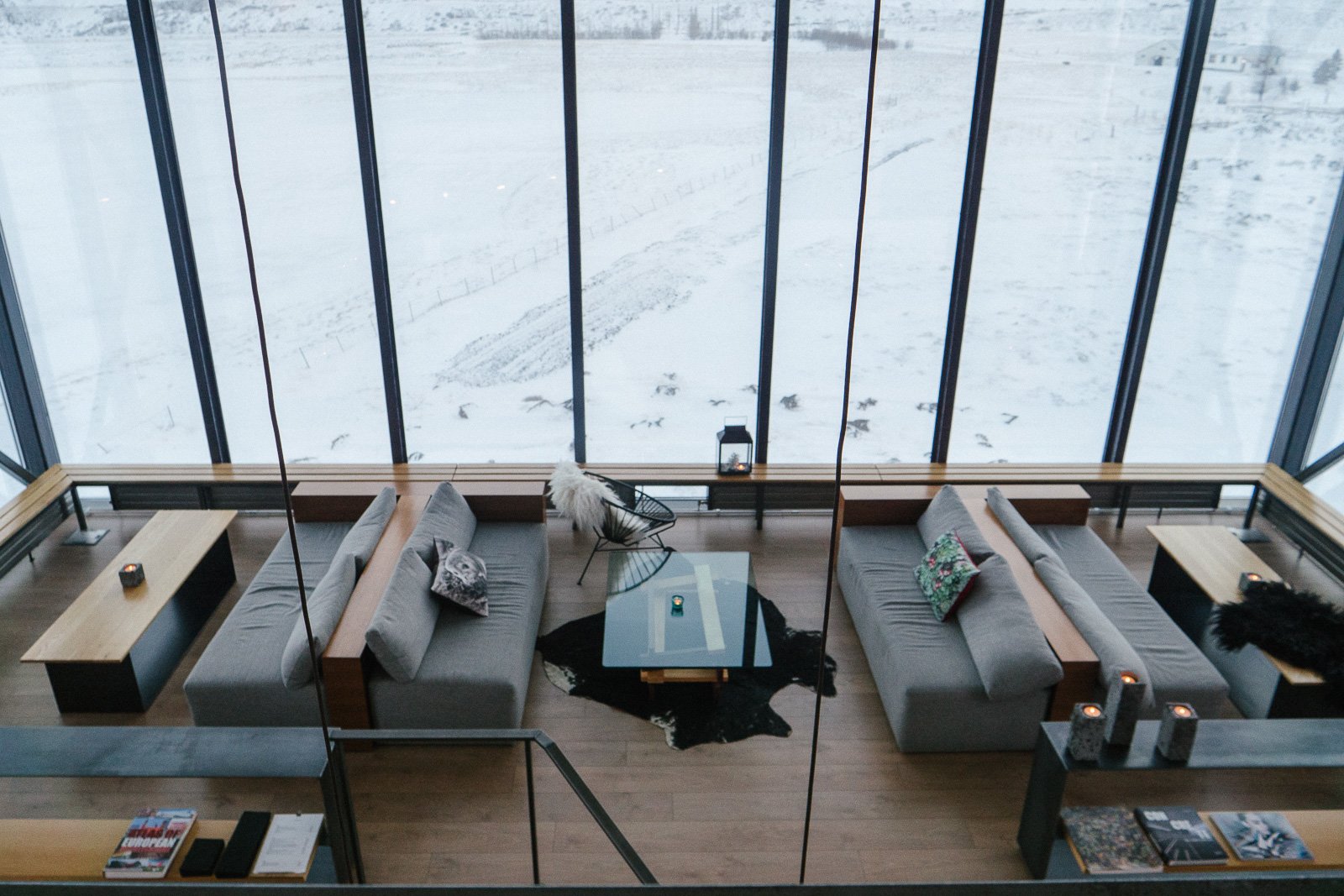 Not far from the lake’s southern shore lies Nesjavellir, a geothermally active valley that’s home to the Nesjavallavirkjun power station. It also contains the Ion Adventure Hotel, our destination for the night. We circle slowly up the long driveway towards the main building, which sits low and discreet in the landscape, protruding from the hillside supported by an array of distinctive diagonal struts.