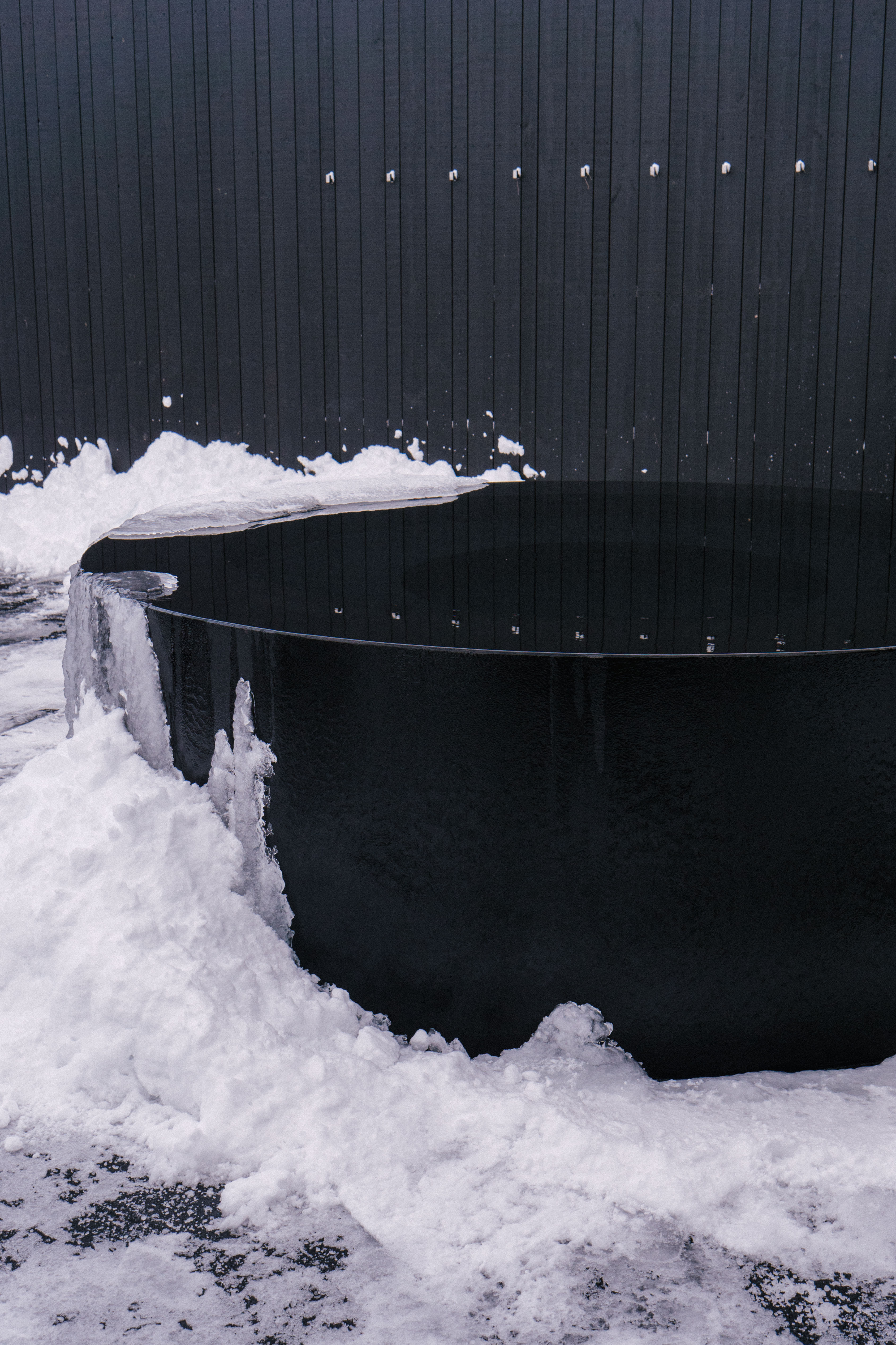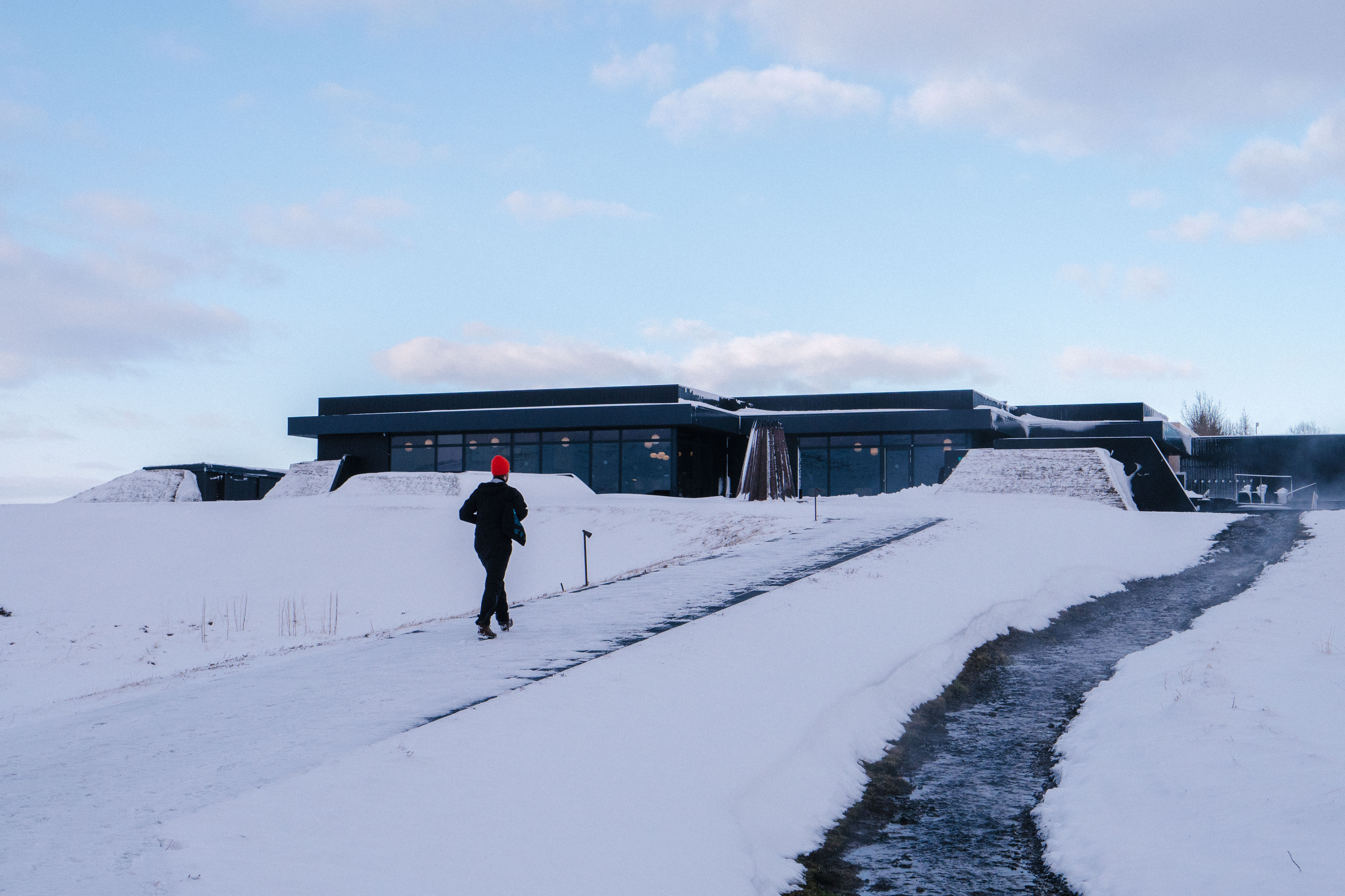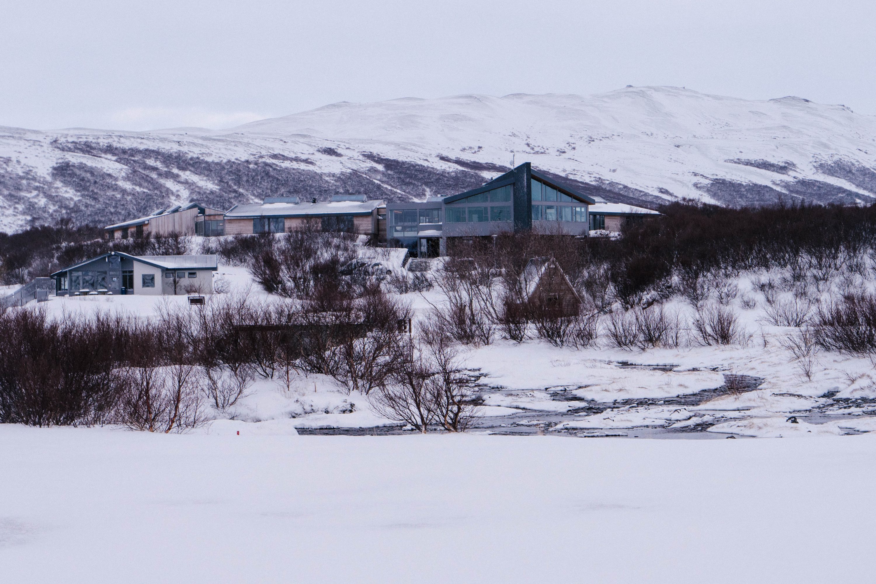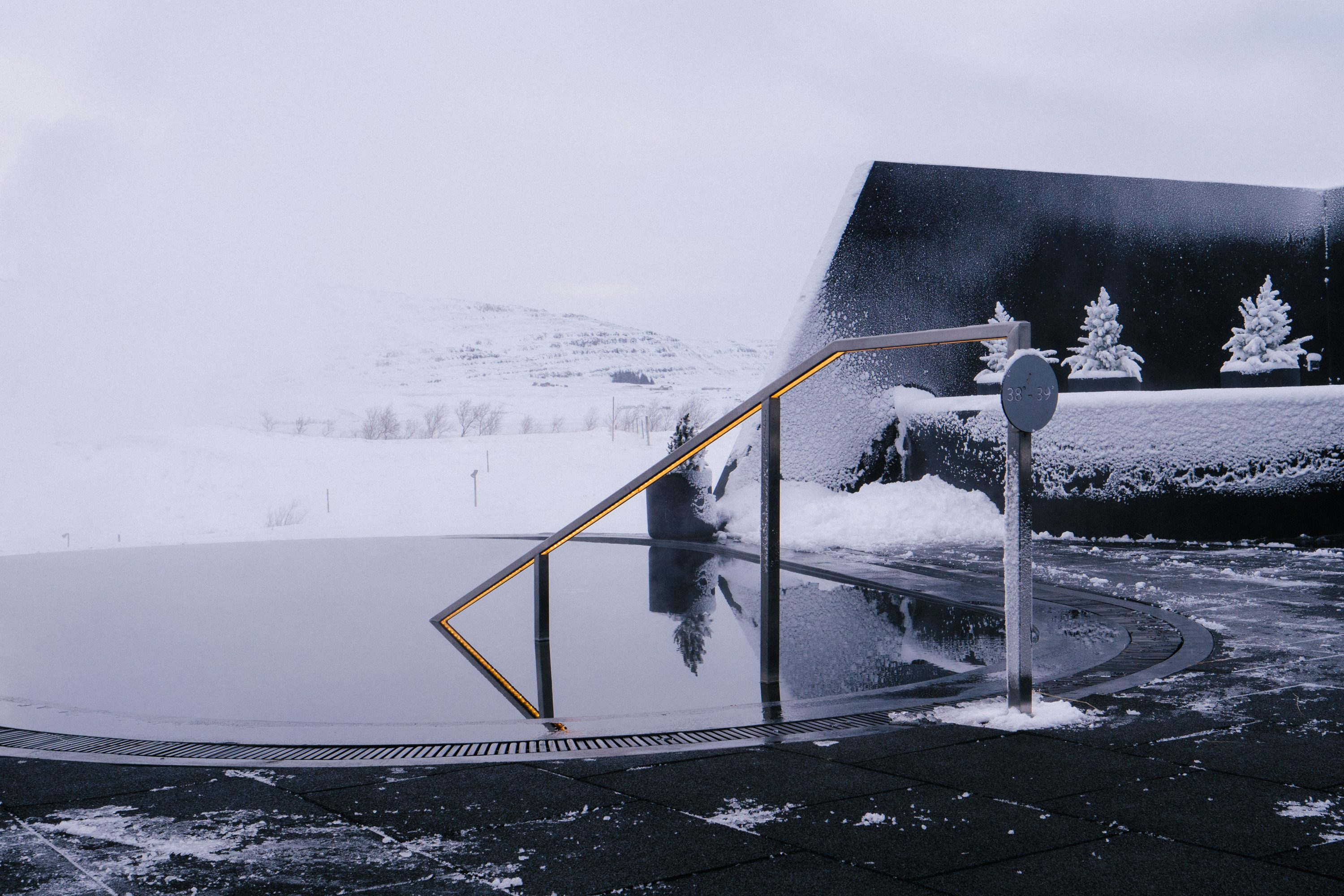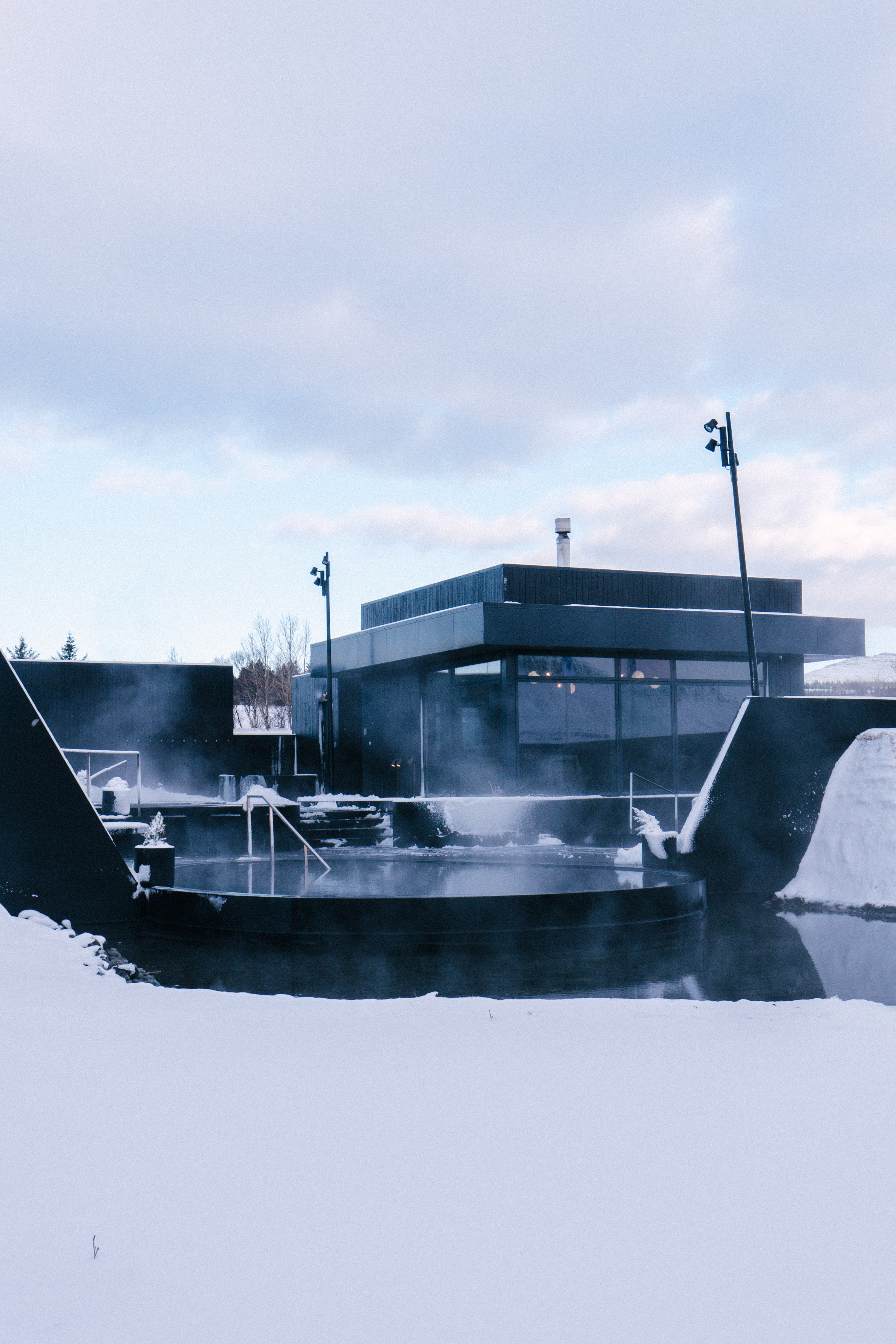 Jónas explains how the boiling hot water from the spring is mixed with cold glacial water from Rauðsgil, which originates from Ok—Iceland’s smallest glacier—to create the perfect bathing temperature. As we walk around, I can’t help but admire the contrast of the jet black circular pools set against the blindingly white fresh snow that lies shovelled into heaps. The design is by DARK Studio, the Icelandic architecture and design studio that’s also currently working on a new hotel at Geysir. Their sleekly organised bathing area can apparently hold 140 people at full capacity, although that seems slightly hard to imagine as we walk around the empty deck.