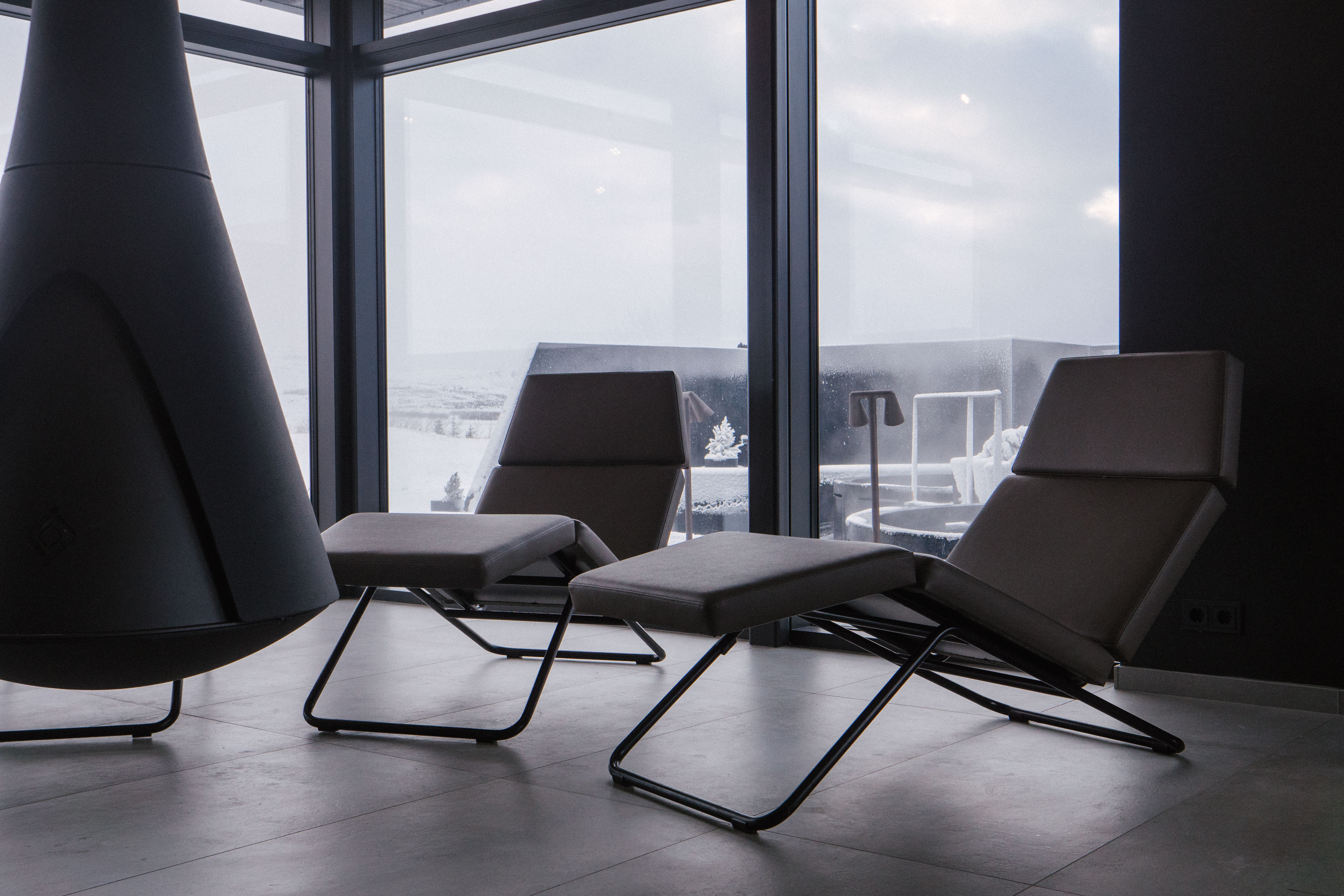 We’re welcomed by Jónas Friðrik Hjartarson, Krauma’s managing director. He walks us past the restaurant area, pointing out the five outdoor hot pots of various sizes and temperatures, a cold plunge pool, a scented sauna, a steam room, and a lounge area with an open fire that can be turned around to face a circle of reclining loungers.
