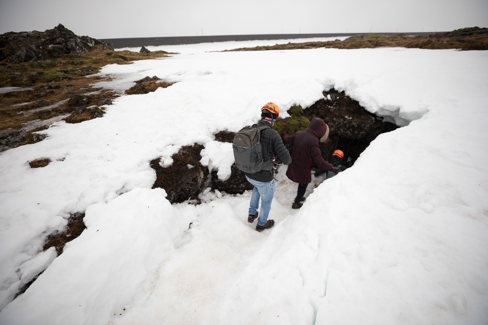 It was just another day in Iceland in February. Heavy rain was pouring down, with howling winds reaching an impressive 40 km/h. We had scheduled a tour with our guide Erla from Fjallahalla Adventures, and I was worried that the inclement weather would affect the trip. But we headed out undeterred. Soon, we’d be out of the elements, as our first stop was underground, at the Raufarhólshellir lava tunnel.