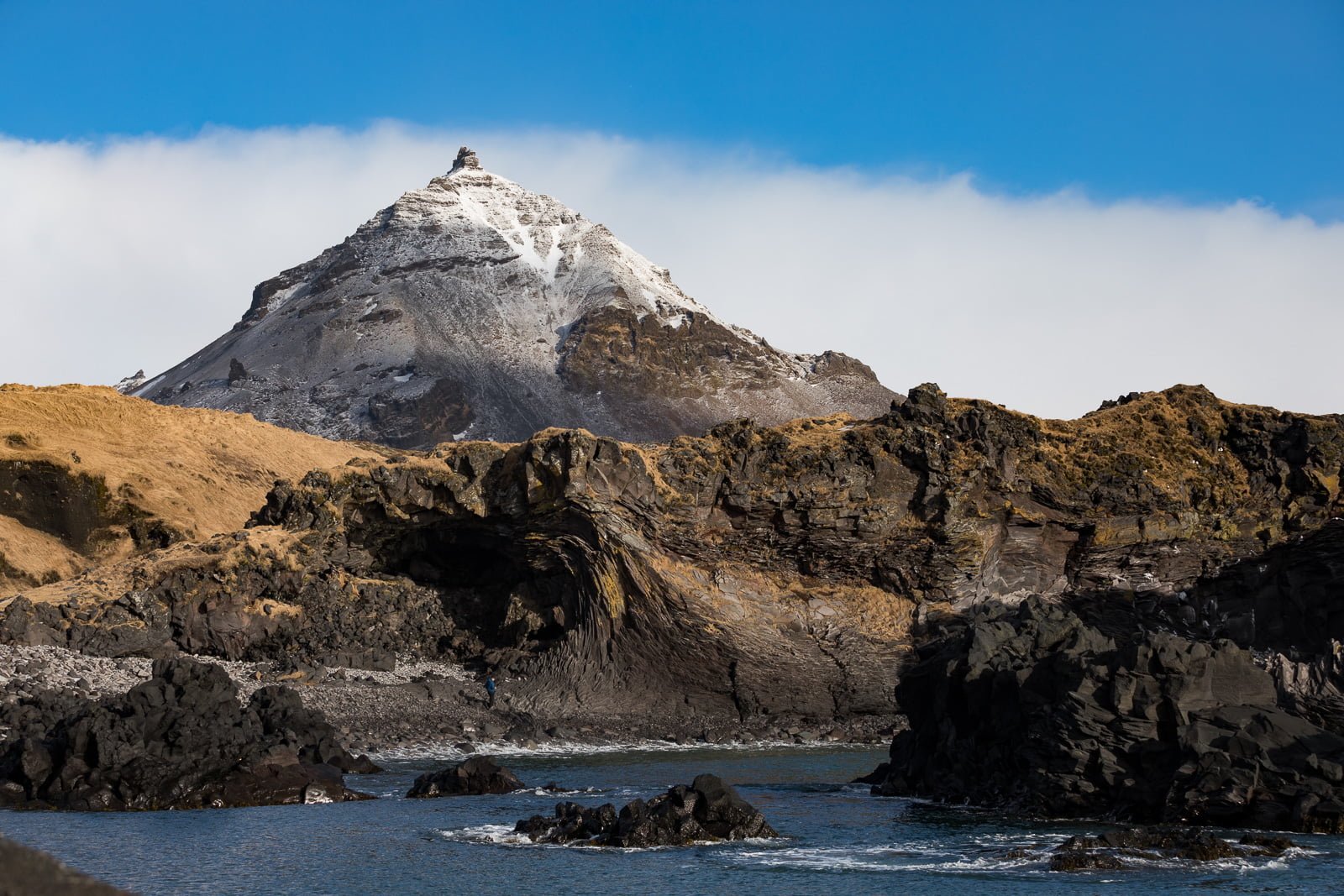 There’s a lot to see in this area. Bjarnarhöfn has a gorgeous tract of lava fields, and beyond that are wide, wild fjords full of seabirds. The peak of Kirkjufell mountain comes into view outlined by awe-inspiring coastal views, and as you get to the peninsula tip, there’s the white sands of Skarðsvík and black sand of Djúpalónssandur battling it out for most beautiful. Towering over all of this is the sparkling Snæfellsjökull glacier—a wonder of Iceland, if there ever was one.