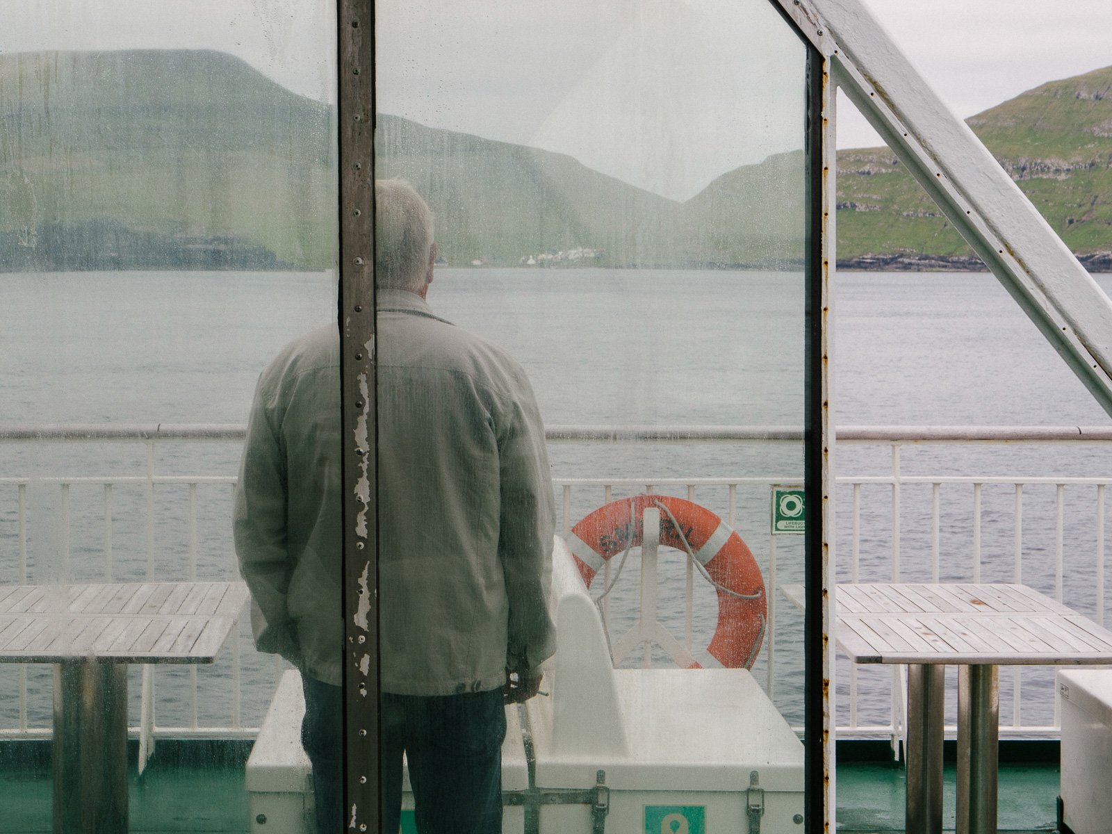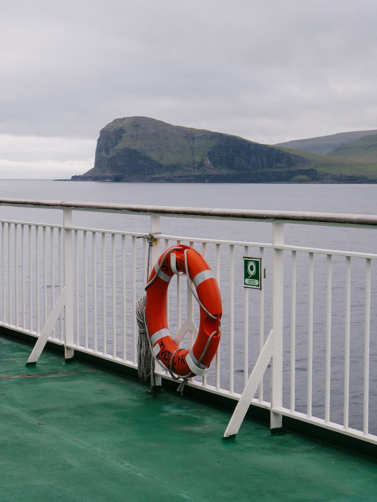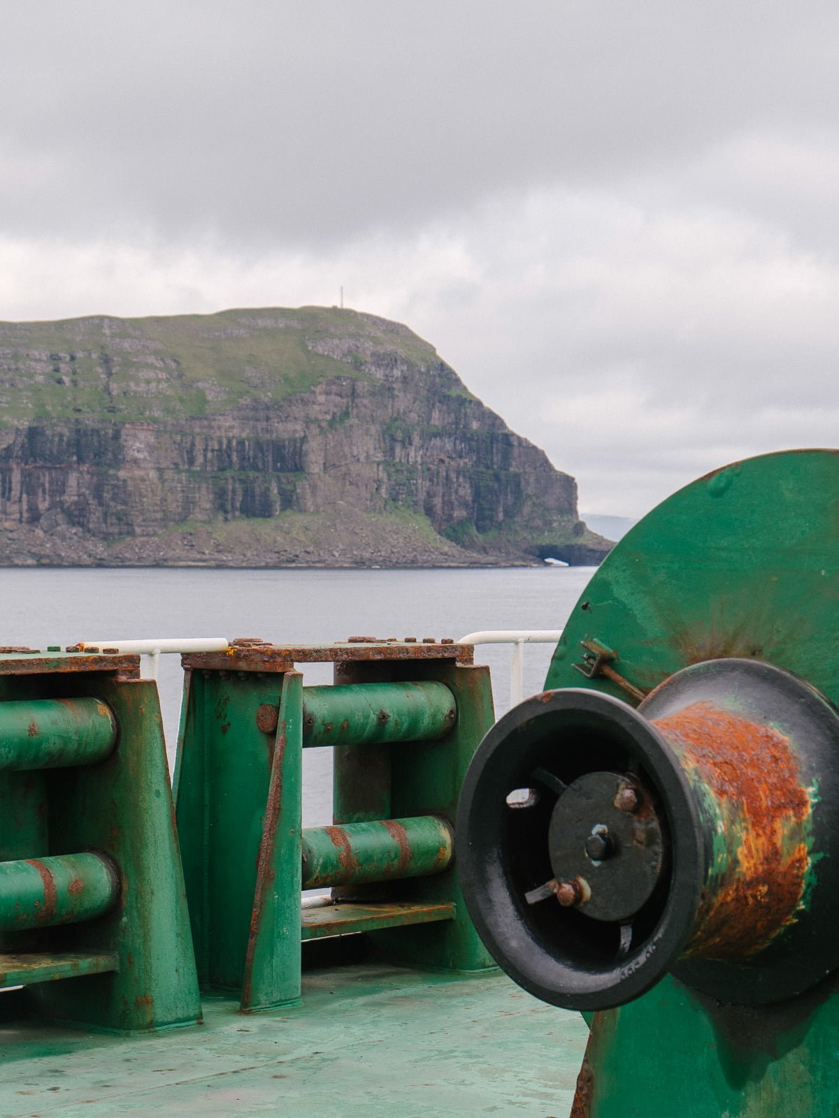 The ferry to the sparsely populated southern isle of Suðuroy leaves from Tórshavn harbour, with its maze of Eimskip containers and a marina with ranks of small, bobbing boats. A medieval sea fort sits nearby, and across the colourful rooftops we can the western edge of Tórshavn—the city ends where the valley gets too steep for buildings. We board the Smyril Line ferry, and take a seat on the deck beneath a flapping Faroese flag for the two-hour journey southward.