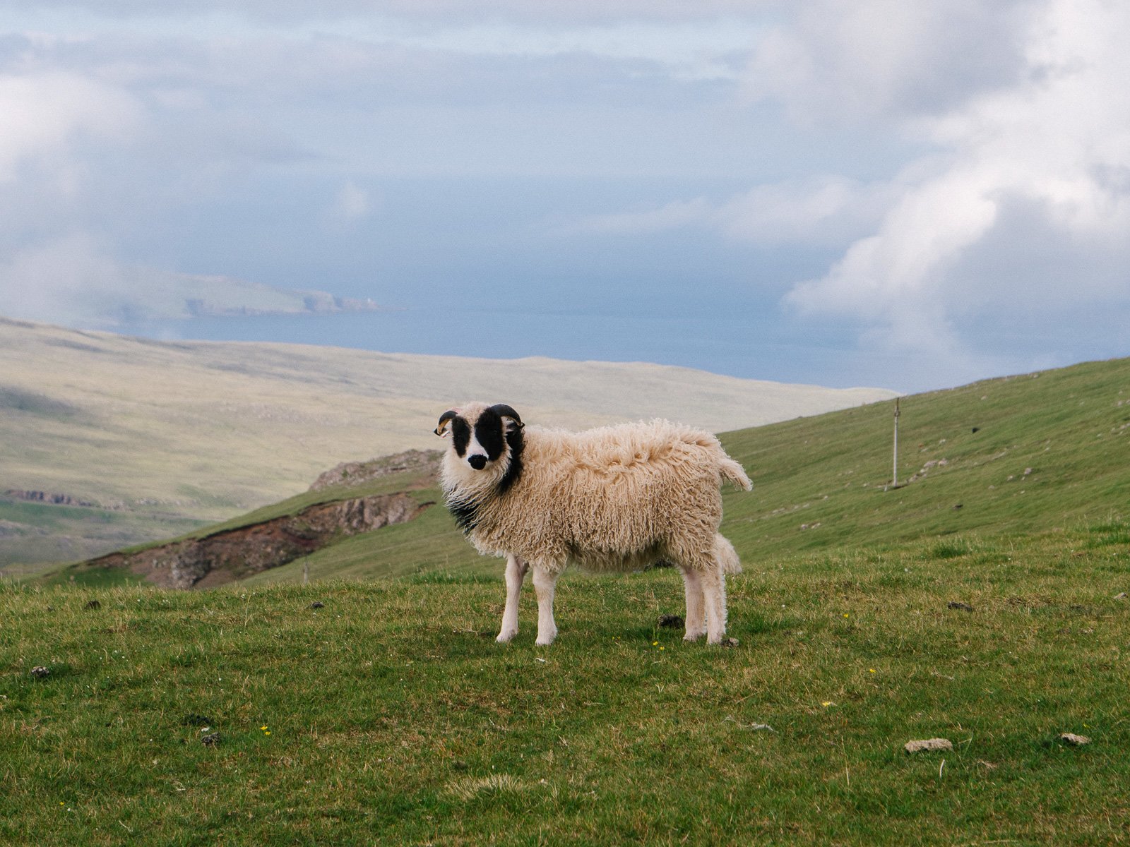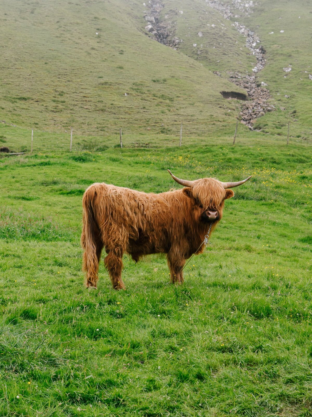 After a quick drive through the rolling countryside to the tiny northern villages of Hvalba and Sandvik, the southern route presents two options—the speedy tunnel, or the old mountain road. In the winter, the tunnel is the only safe option, but in summer, the high road offers views over the glittering ocean. It winds around the top of the mountain, through surprisingly verdant fields; we pass a pair of handsome Highland cows, and a flock of haggard-looking sheep, many with their tattered fleeces hanging off and dragging along behind them.