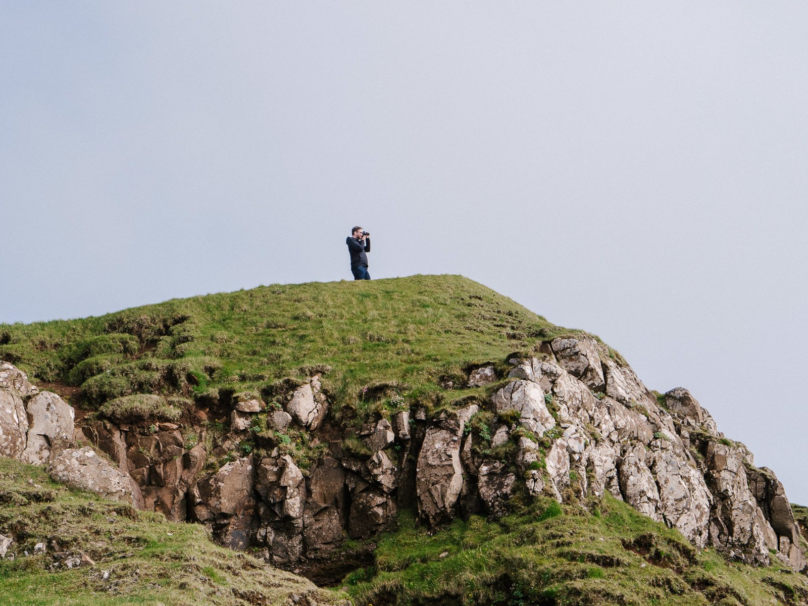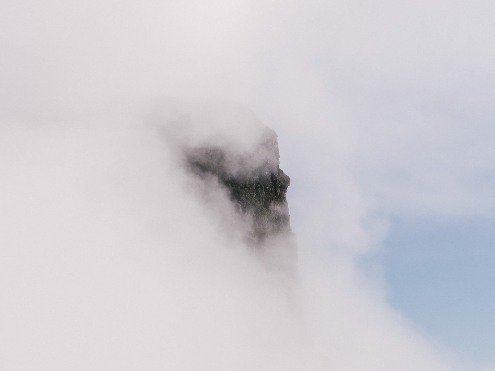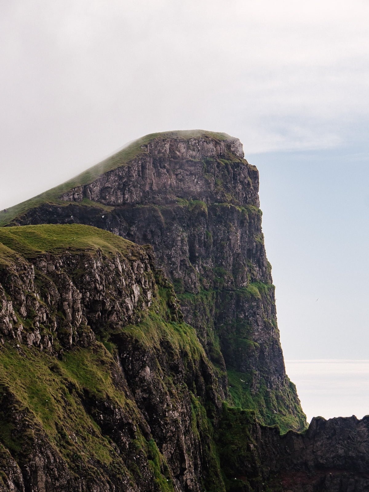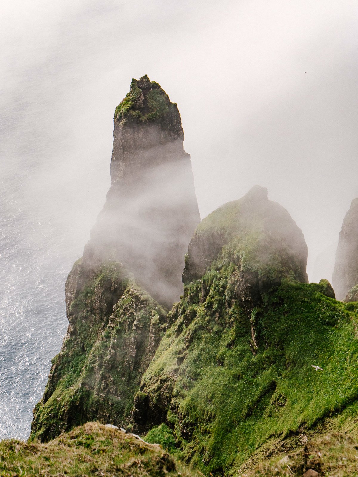 Our luck, it turns out is in—after a few minutes, a taut sea breeze comes in, lifting the fog and revealing the towering peaks of Beinisvørð. The distant shrieking sea birds wheeling around the jagged 470m summit are tiny dots, and the drop to the sea is dizzying, with various protruding headlands offering wide views over tall sea stacks and the tumultuous seascape below.