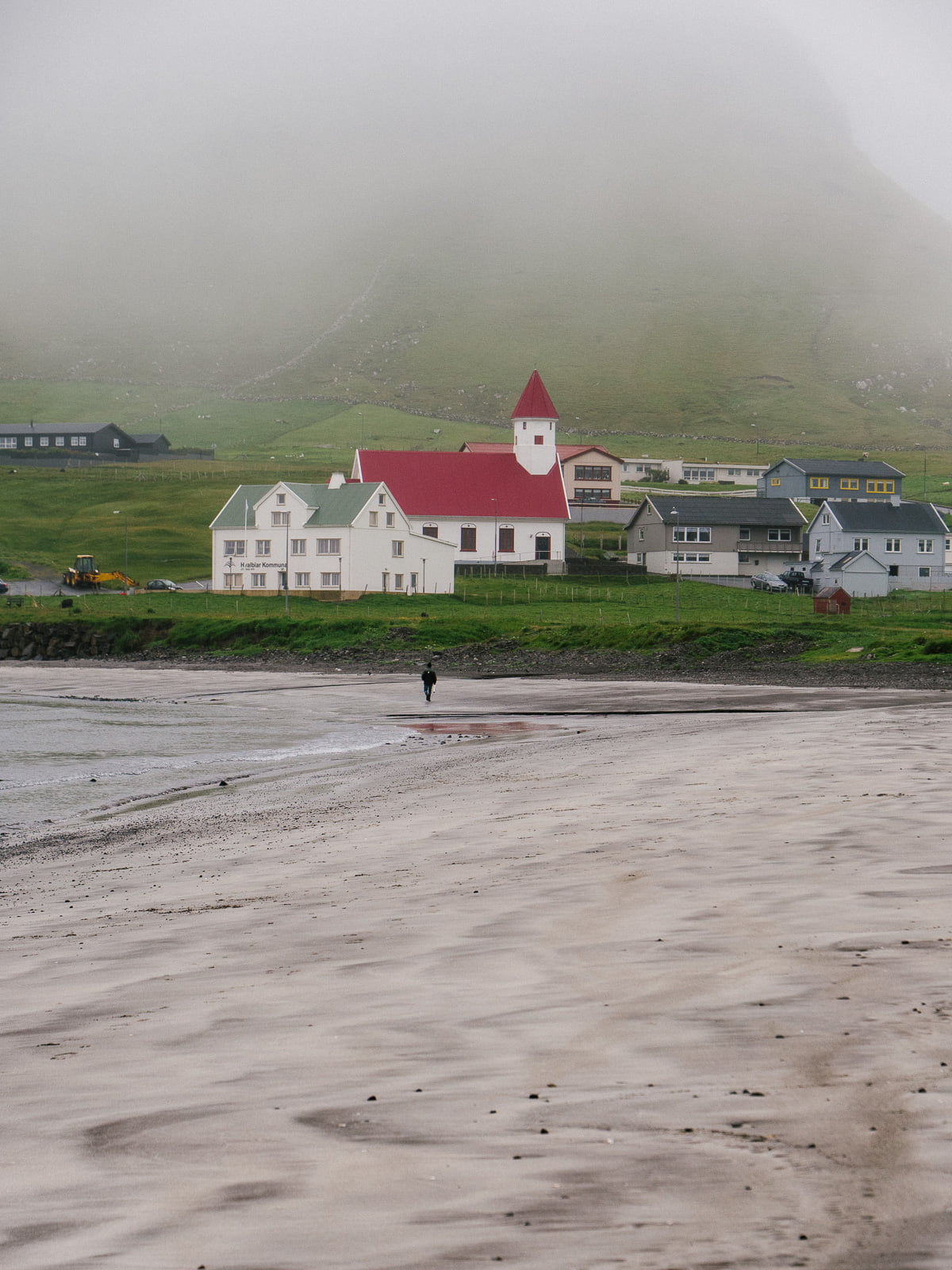 Vágar is the island’s largest settlement, with a bustling harbour, a strip of shops, an information centre, and a museum dedicated to the portraits and landscape paintings of local artist Ruth Smith. At the western edge of the town, out past the football field and a small lake, there’s a large cove called Vágseiði with a rocky beach and, after a short climb, a view over the surrounding mountains. The weather changes from moment to moment, and the vast cliffs melt in and out of view amongst an ever-changing mass of wisps, sheets and tendrils of cloud.