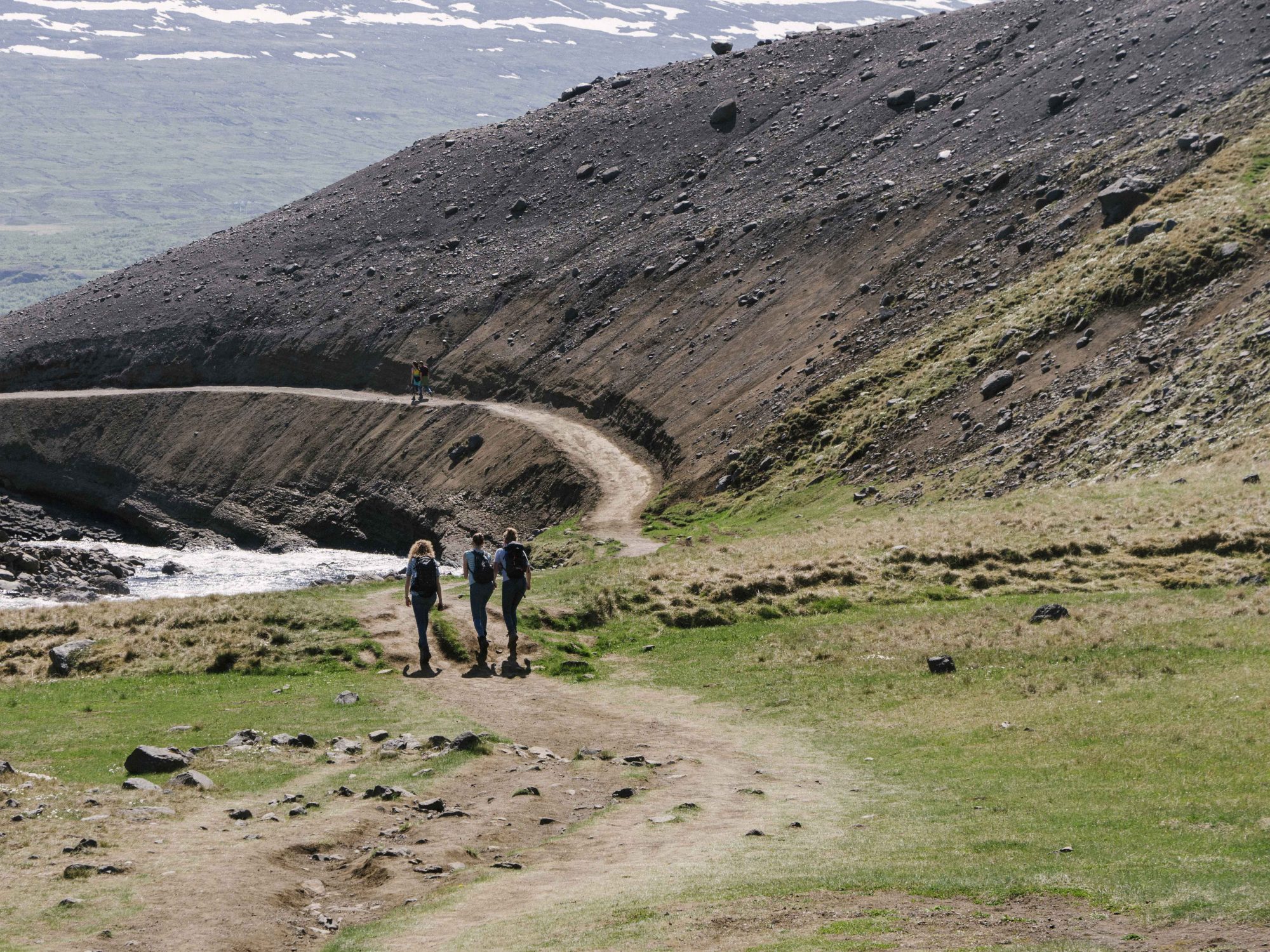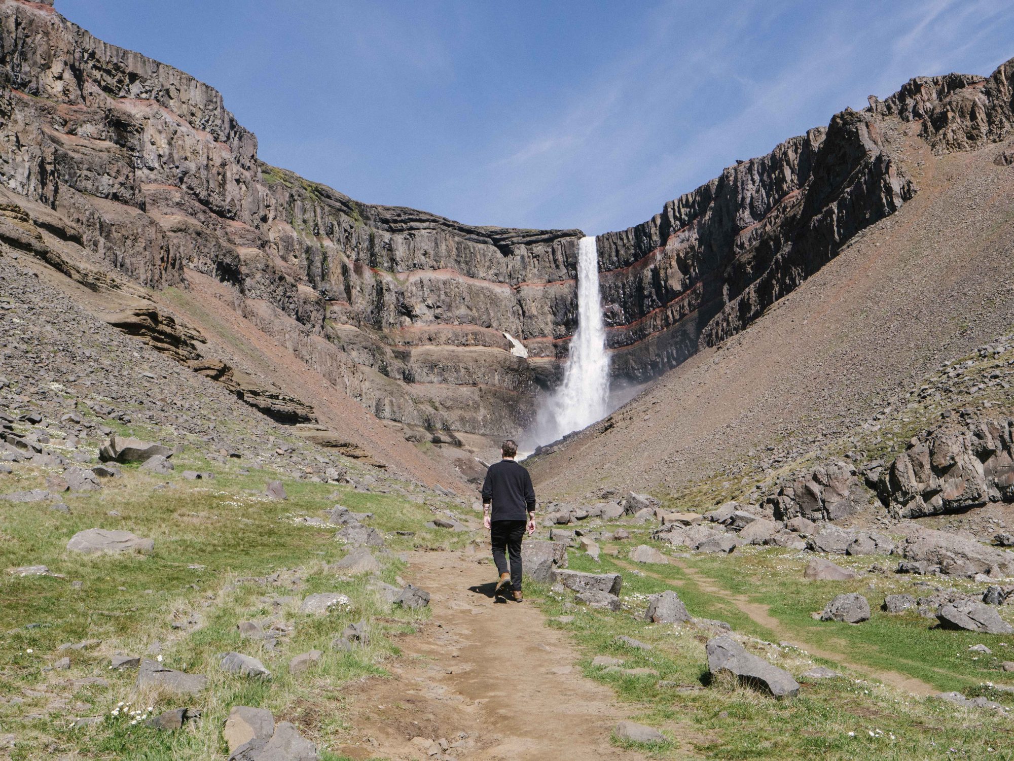 Hengifoss remains concealed until almost the last moment. We stride up the bank of the river, crossing boulders and grassy stretches, the path sometimes tracing the inside walls of the canyon as it narrows towards our target. Several European accents float by as we pass other hikers—German, Spanish, English, and more than a few speaking Icelandic. The summer weather has put everyone in an energetic mood, and with the crashing sound of the waterfall getting ever-louder, we bound up the final hill.