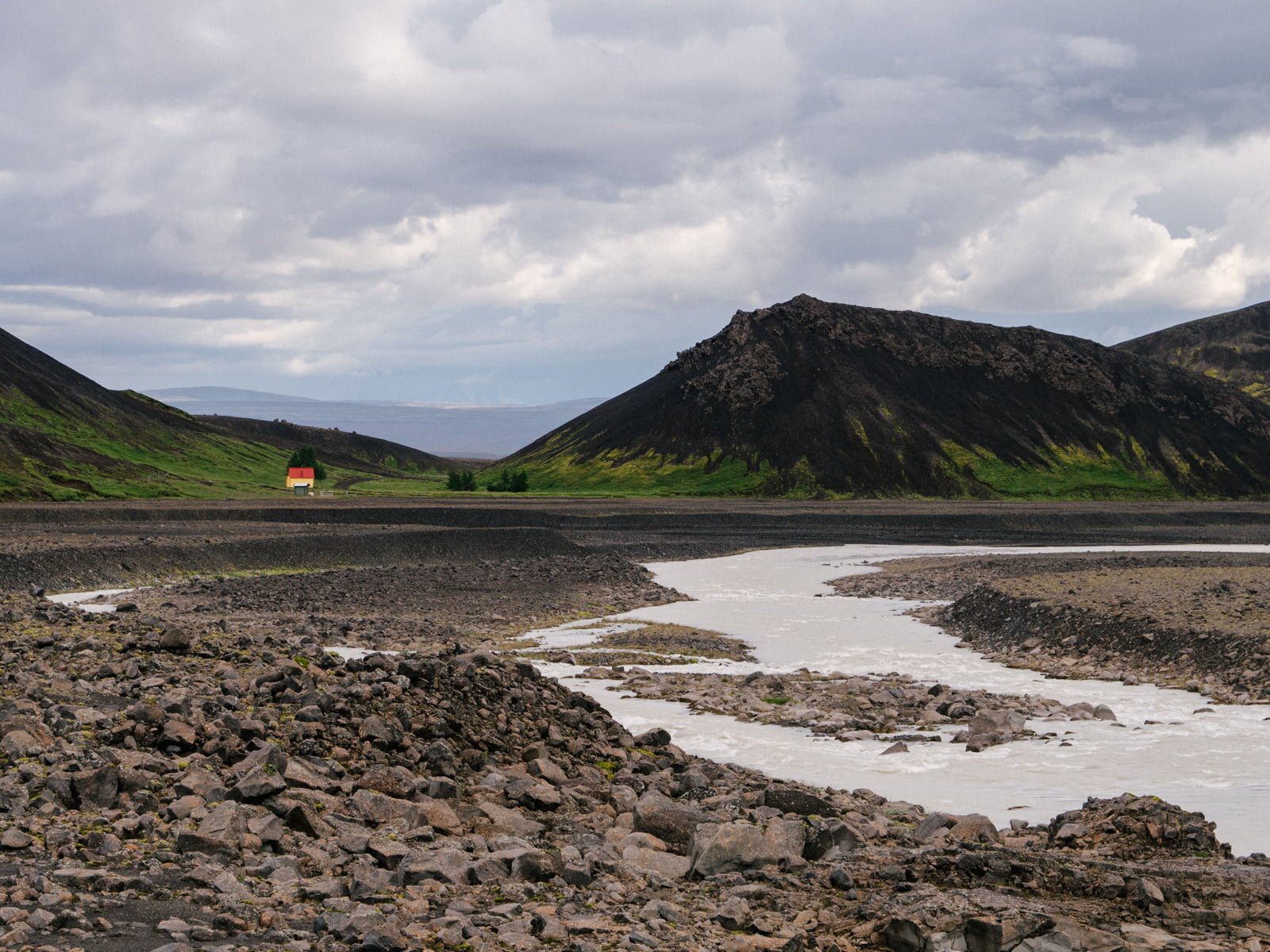 We rejoin the main road and head north. An hour later, the Kerlingarfjöll Mountain Resort comes into view. The campsite sits on a riverbank beneath a dramatic, sculptural cliffside, with quaint green and red A-frame cabins dotting the valley. We check in as night falls and eat a welcome hot meal of steaming hot plokkfiskur before falling into our beds and a deep sleep.