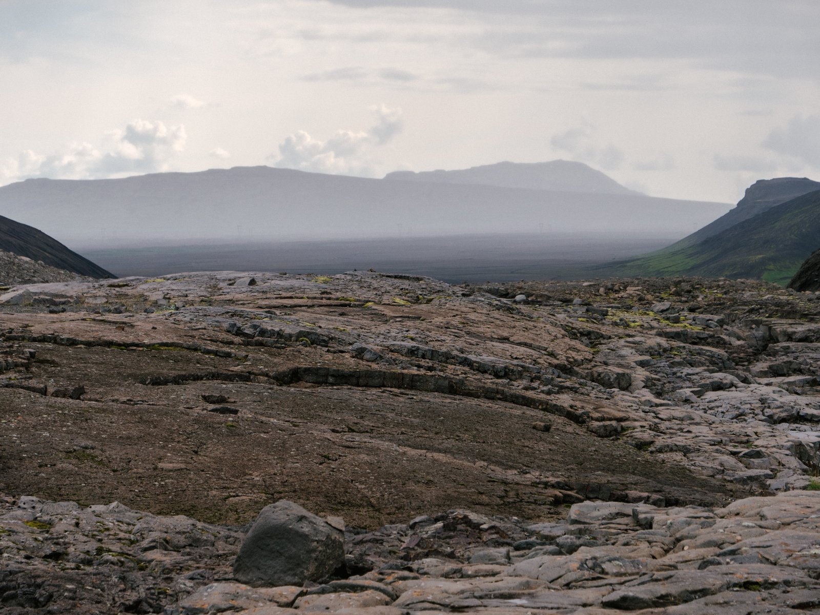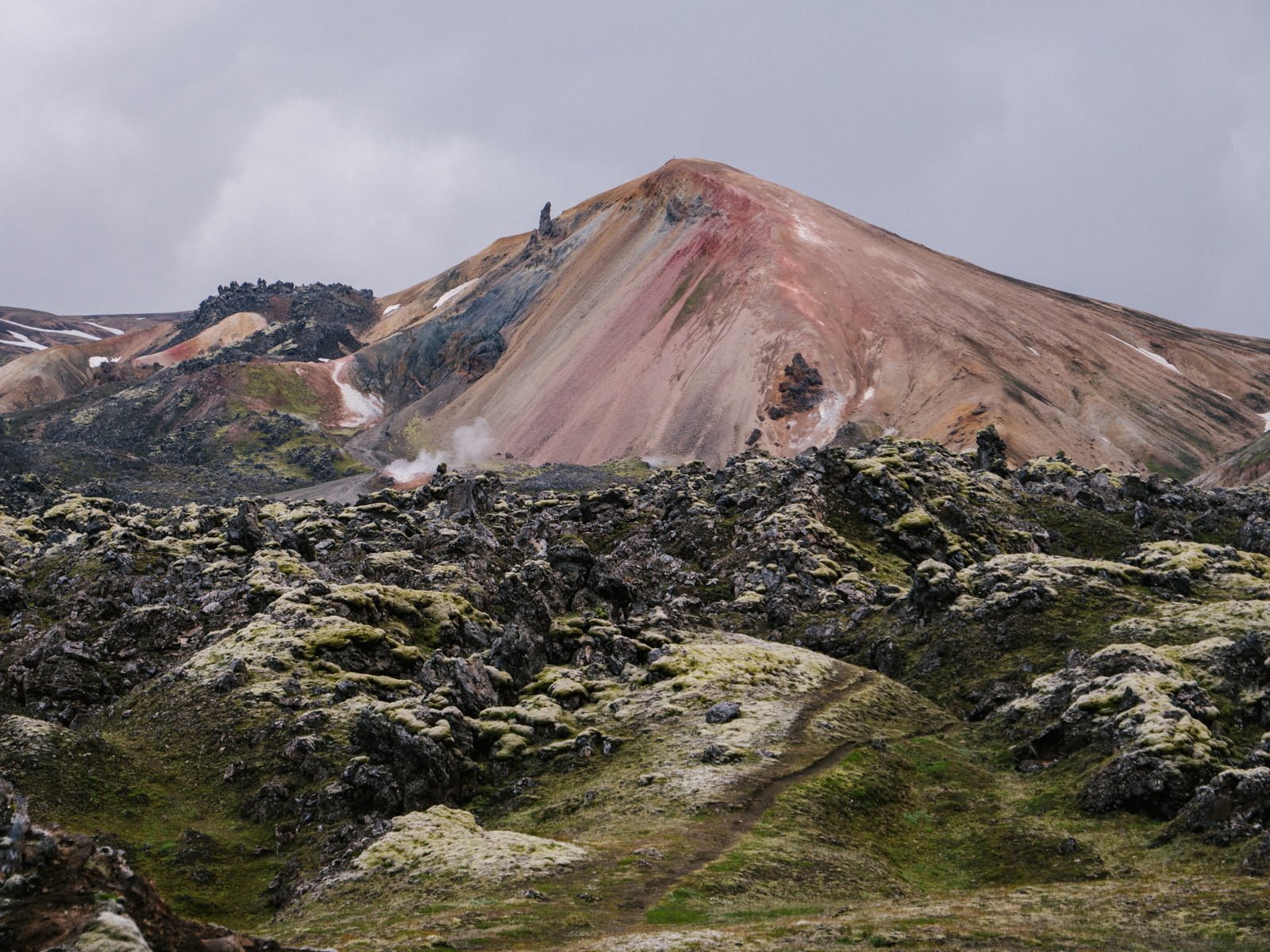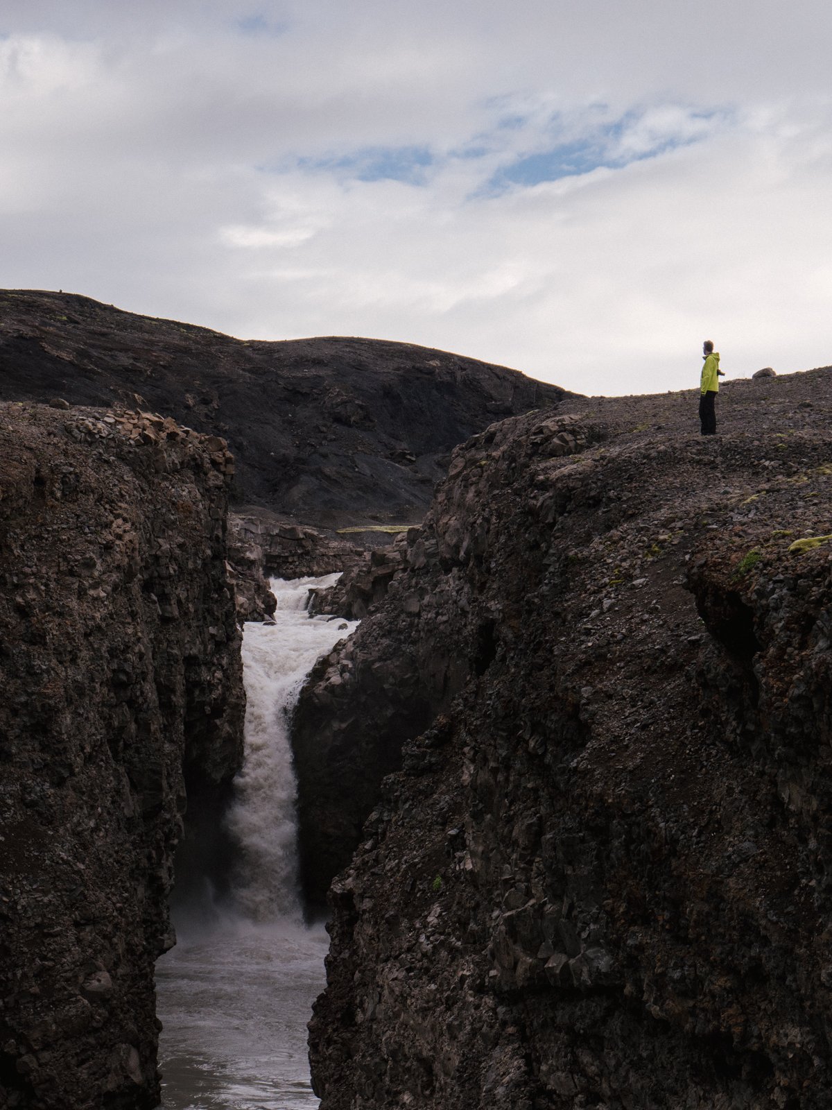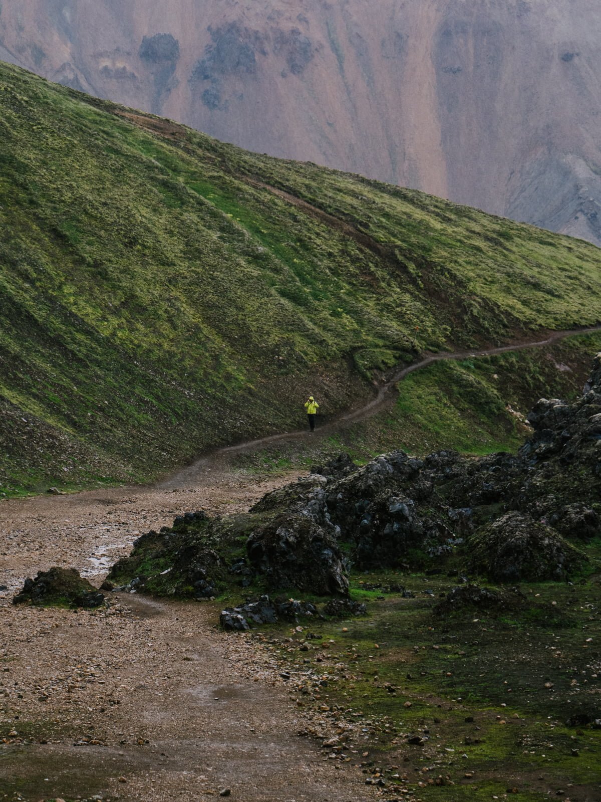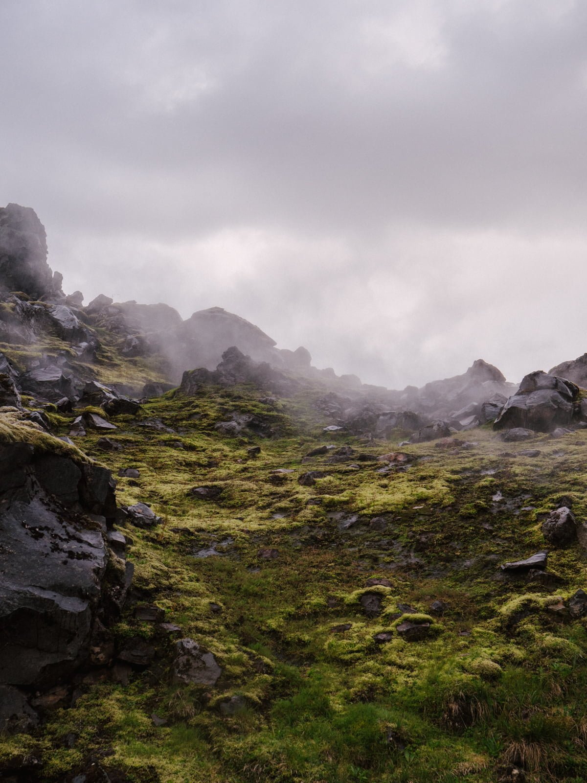 The next day, in spitting rain, we embark on a hike up to Hveradalir, a geothermal valley nestled deep inside the Kerlingafjöll (“Old Women Mountains”) mountains. The trail starts at the campsite, zigging up a steep hillside to the top of a long, jet-black expanse. Before long, the cabins are out of view and once again my senses tingle keenly, awakening to the feeling of amplified nature in the vast empty space.