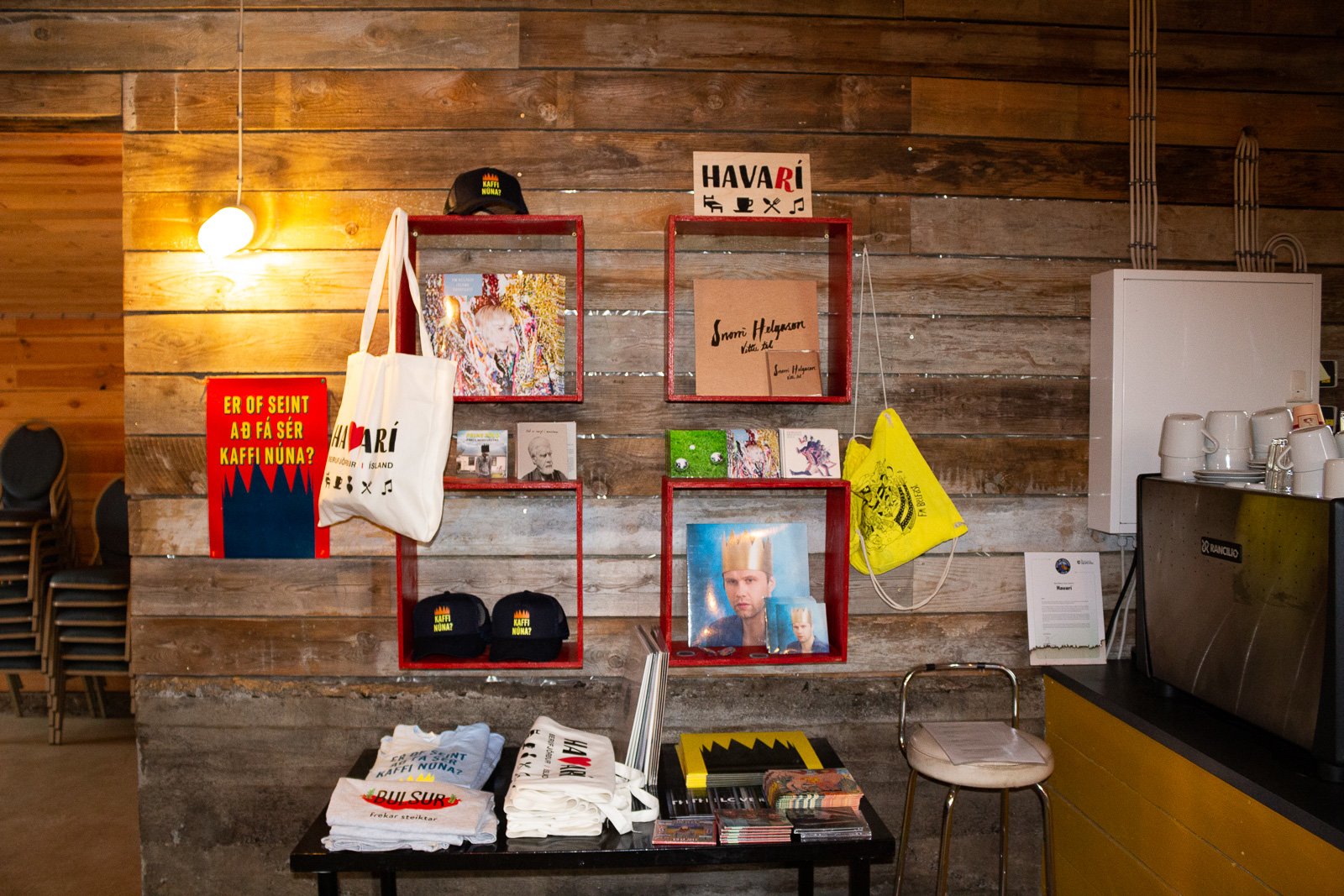 The café occupies one corner of Havarí’s concert venue—a tastefully sparse hall, decorated with paintings that feature Prins Póló’s signature crown. ‘Is it too late for coffee?’ asks the text on the paintings; it’s just gone 10 and the answer is unequivocally, ‘No.’ At the other end of the hall is the stage, graced this summer by numerous Reykjavík acts—FM Belfast, Sóley, and Úlfur Úlfur, to name a few. Packing the house has hardly been an issue for Svavar. The audiences mostly comprise Icelanders from near and far, he says, but some foreign visitors—unsuspecting guests at Havarí’s hostel—find themselves dumbstruck to have stumbled upon such vibrant events this far from any city.
