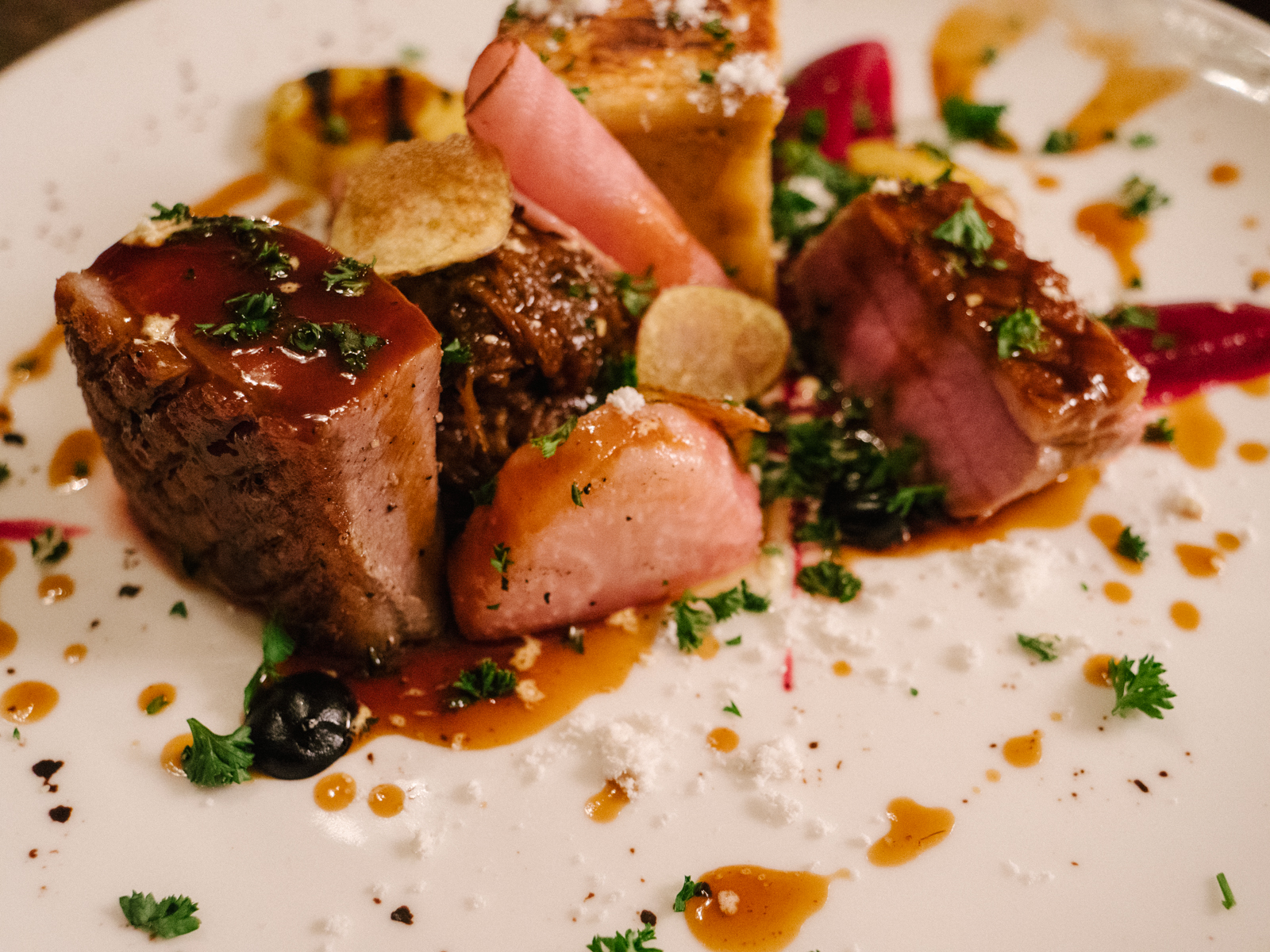 Many of the dishes on the game menu come with unexpected flourishes and multiple garnishes—the tender slow cooked pork loin embellished with chilli crumble and serrano ham, or the tuna with leek and shallot, but also pear and a cured egg yolk. The beef tenderloin is served with deep fried shiitake mushrooms and mustardy mash that pushes the flavours all the way up to eleven.